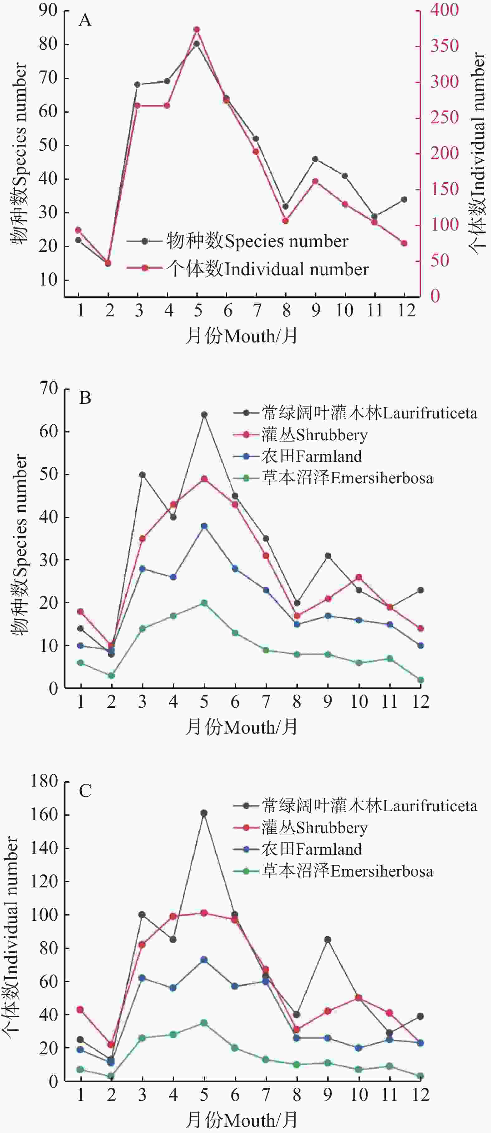 4种生境蝴蝶的种类与个体数的时序动态变化存在差异。常绿阔叶灌木林的蝴蝶物种数在2—3月大幅度增加,4—5月有小幅度下降,4—5月上升到最高值64种,5—8月持续下降,8—9月再次小幅度上升,9—11月持续下降,11—12月小幅上升,12—翌年1月持续下降到最低值8种(图2−B);灌丛相较于常绿阔叶灌木林其蝴蝶物种数增长的幅度较缓,3—5月持续增加,于5月达到最高值49种,5—8月回落,8—10月小幅增长,10—12月下降,12—翌年1月小幅增加;农田的蝴蝶物种数变化趋势与常绿阔叶灌木林一致,分别在5月上升到最高值38种和2月达到最低值9种;草本沼泽的物种数始终保持在20种及以下,但也在5月达到最高值20种和2月达到最低值3种。4种生境的个体数动态变化与物种数动态趋于一致(图2−C)。