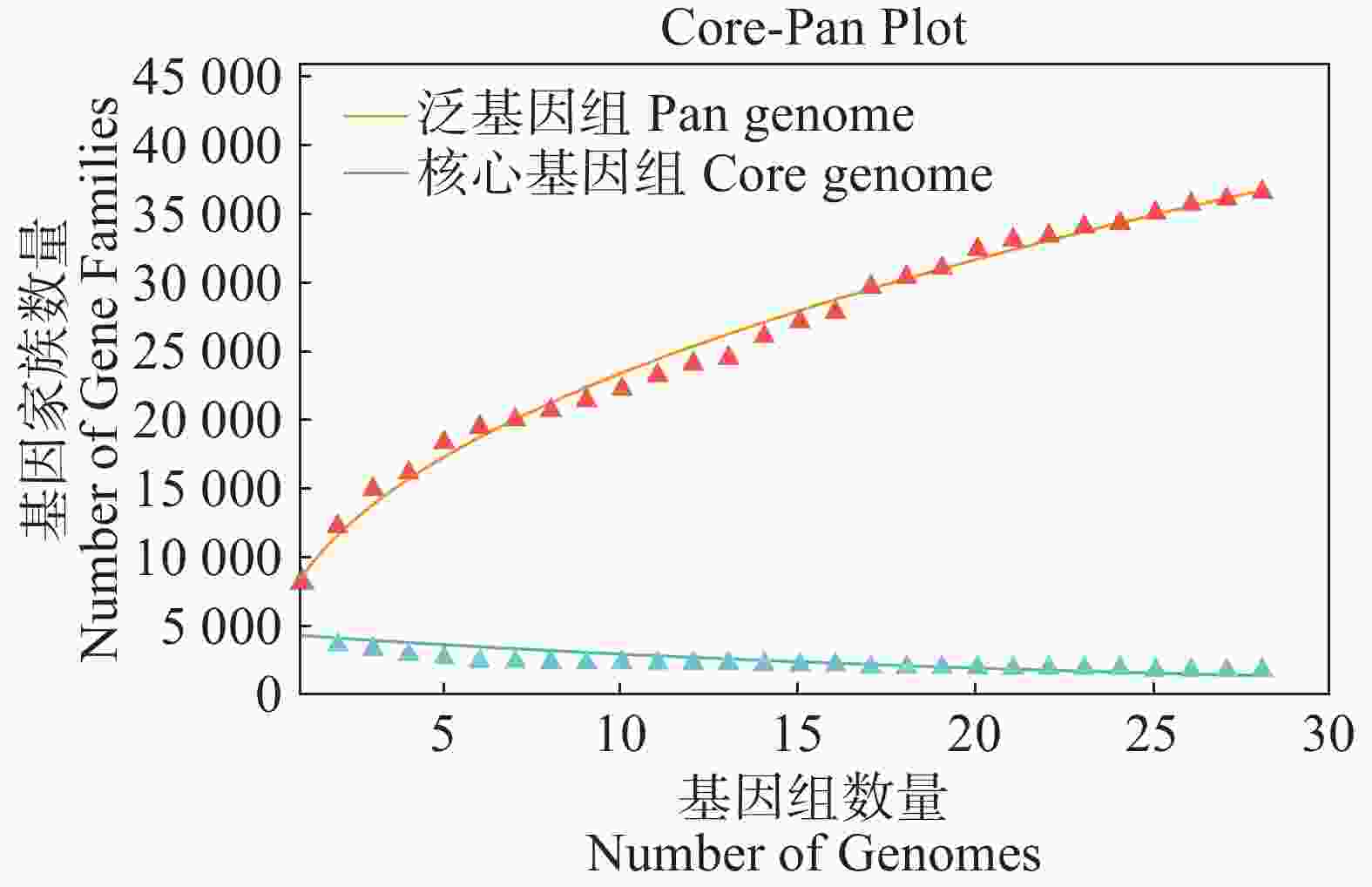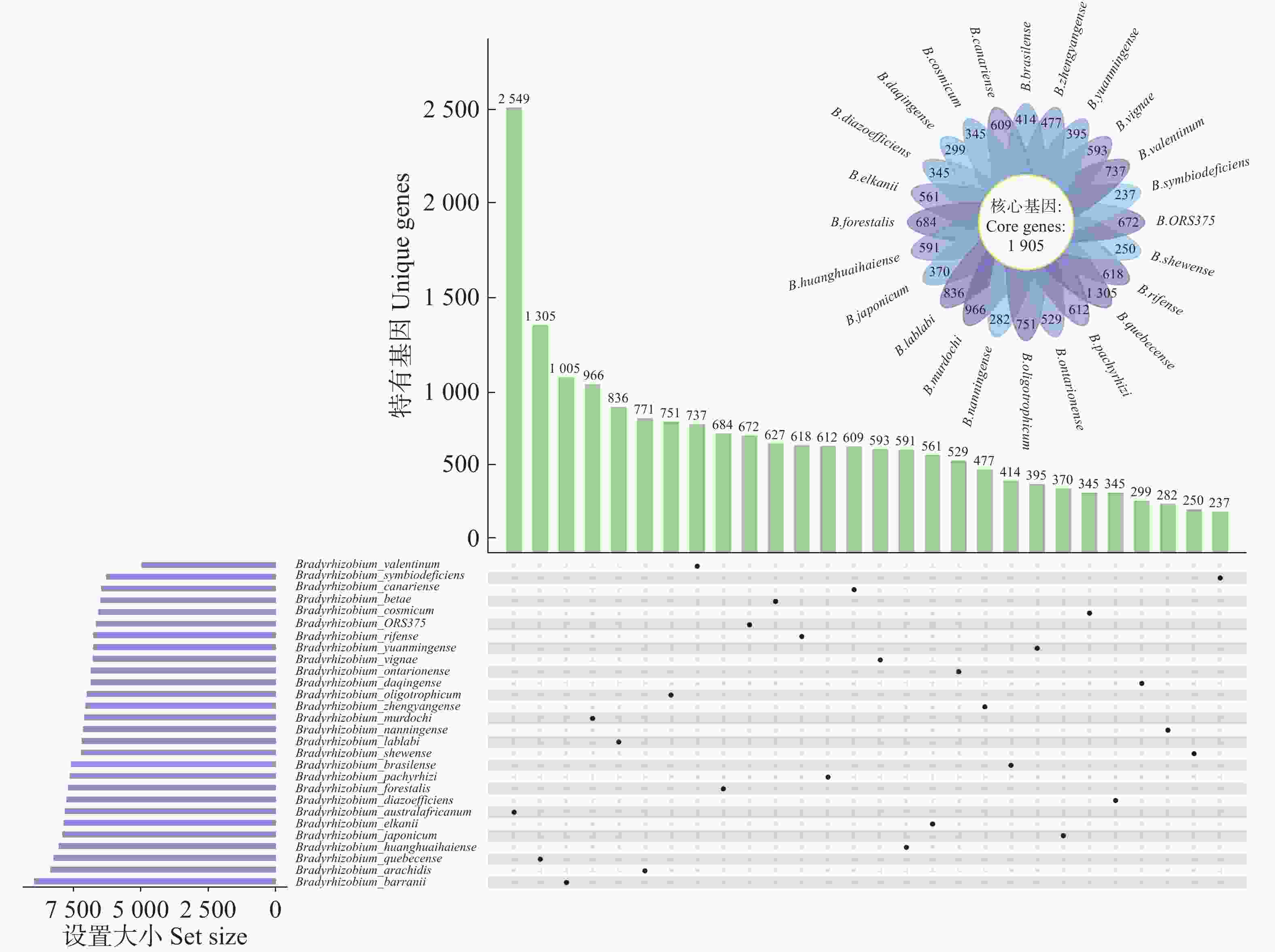 使用dataset软件从NCBI批量下载28株组装程度为complete的慢生根瘤菌属基因组序列。使用BPGA对28株慢生根瘤菌基因组进行泛基因组分析[18]。使用Diamond将泛基因组中的核心基因组、附属基因组以及独特基因组在KEGG数据库中进行功能注释[19]。分析的结果通过gnuplot和R包ggplot2[20]进行可视化。