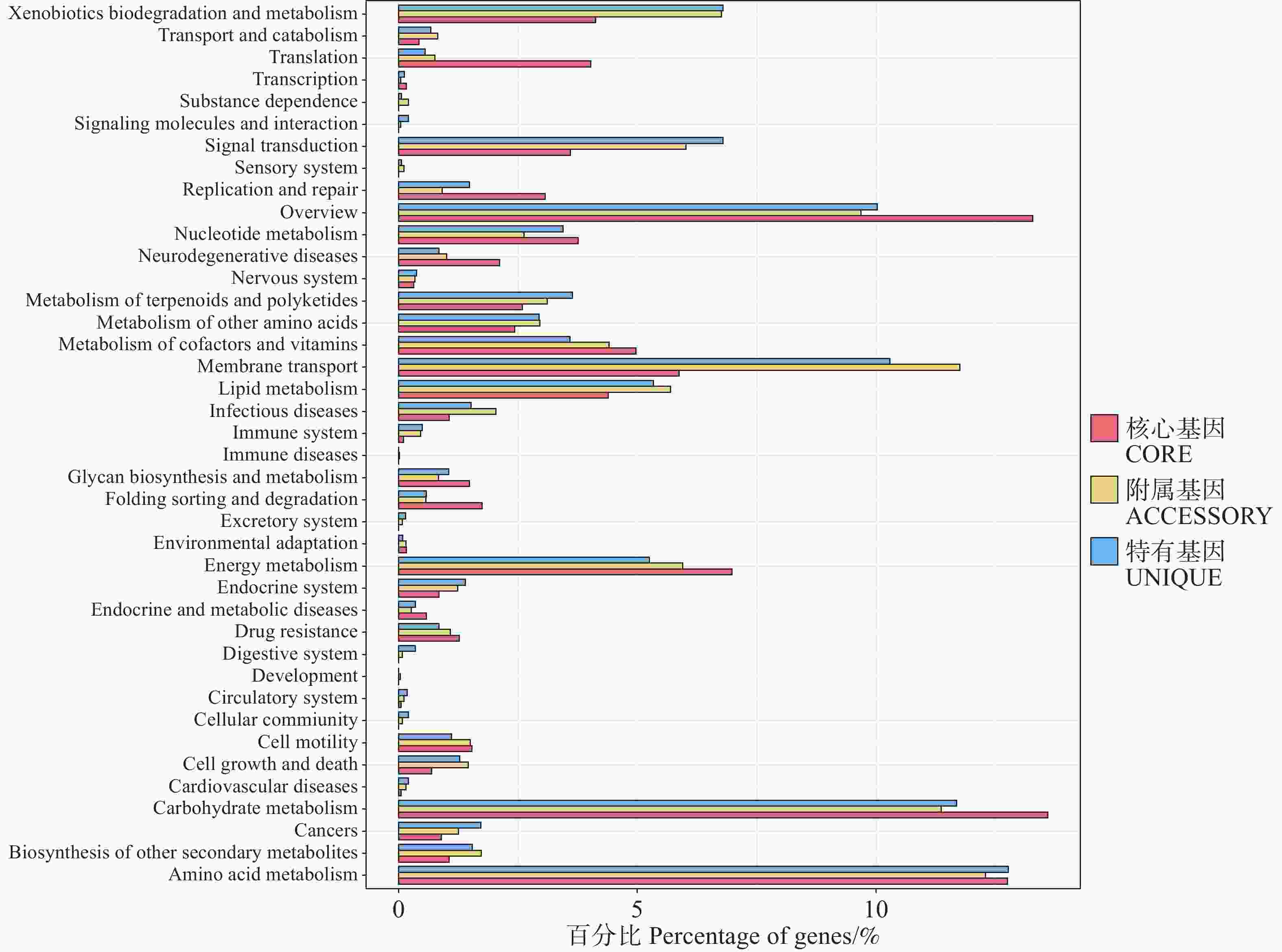为了揭示慢生根瘤菌属泛基因组的功能特征,本研究使用KEGG数据库对核心基因、附属基因以及特有基因进行功能注释(图3)。核心基因组大部分的功能与维持各种基础生命活动相关,比如碳水化合物代谢(13.59%)、氨基酸代谢(12.75%)、能量代谢(6.98%)、膜运输(5.87%),辅因子和维生素的代谢(4.97%)。附属基因的功能是氨基酸代谢(12.29%)、膜运输(11.75%)、碳水化合物代谢(11.36%)、异源生物降解和代谢(6.75%)、信号转导(6.01%)。特有基因功能与附属基因相似,主要为氨基酸代谢(12.76%)、碳水化合物代谢(11.69%)、膜运输(10.29%)、异源生物降解和代谢(6.79%)、信号转导(6.79%)及脂代谢(5.33%)。相比于核心基因,在附属基因及特有基因中膜运输、异源生物降解和代谢、脂质代谢、信号转导等相关功能比例升高。研究表明,塑料降解过程需要多种功能基因的协同作用。这些基因涉及异源生物降解和代谢、膜运输、脂质代谢及其他关键信号通路[31 − 34]。