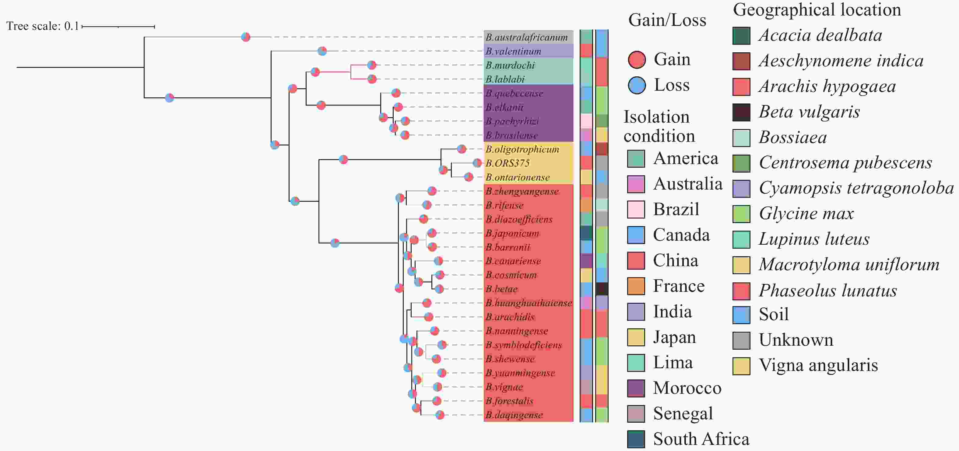 为了分析慢生根瘤菌属在进化过程中的基因流动,研究基于1 052个单拷贝核心基因构建了慢生根瘤菌的系统发育树。基于拓扑结构和物种的进化距离,慢生根瘤菌属的系统发育树可以分为6个主要进化支(图4)。其中,B. australafricanum与其他慢生根瘤菌属成员在进化上具有显著的分歧。本研究收集了28个物种的分离地点和分离来源。尽管某些物种有相同的分离地点或来源,但它们在系统发育树中的进化距离却较远(图4),显示出遗传多样性,这与慢生根瘤菌属具有开放的泛基因组,容易与其他物种进行遗传物质的交换有关。
