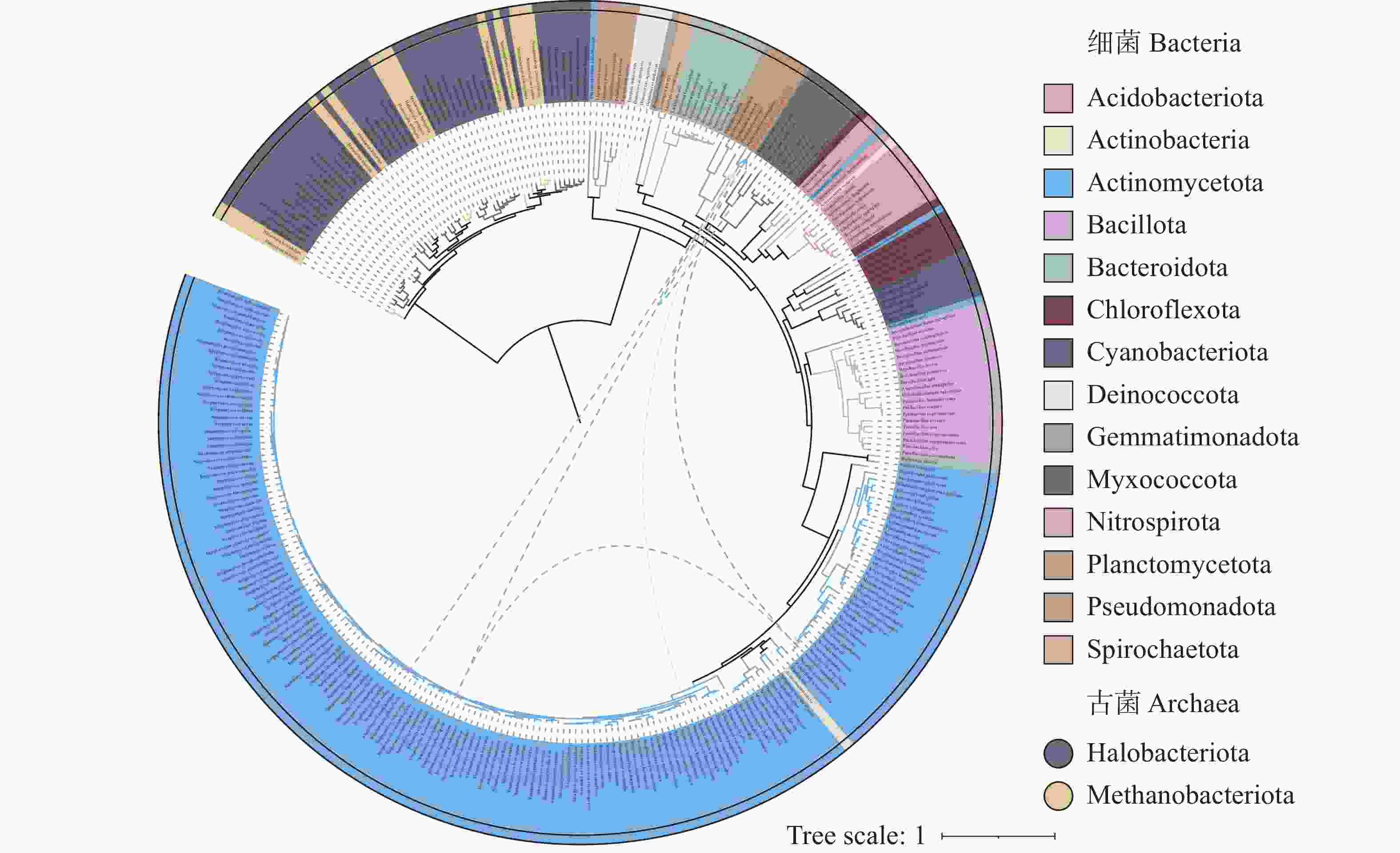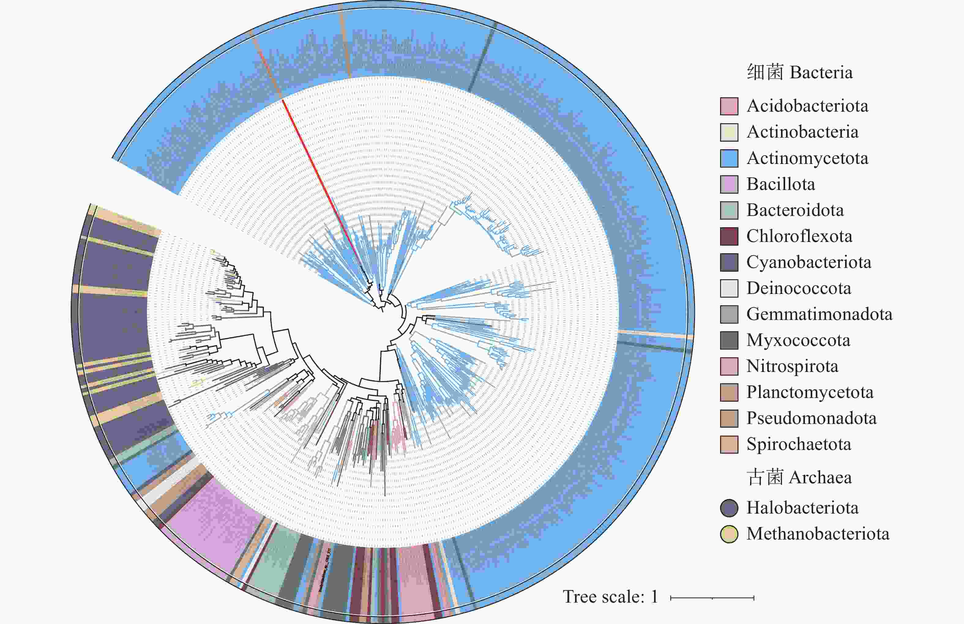 1 000 次重复抽样检验,取距离最远两物种的中点确定树根。用TaxonKit[27]对物种树上所有物种进行谱系注释,将物种分类至门水平,用不同颜色表示。所有的系统发育树使用ITOL[28]进行可视化。 -
