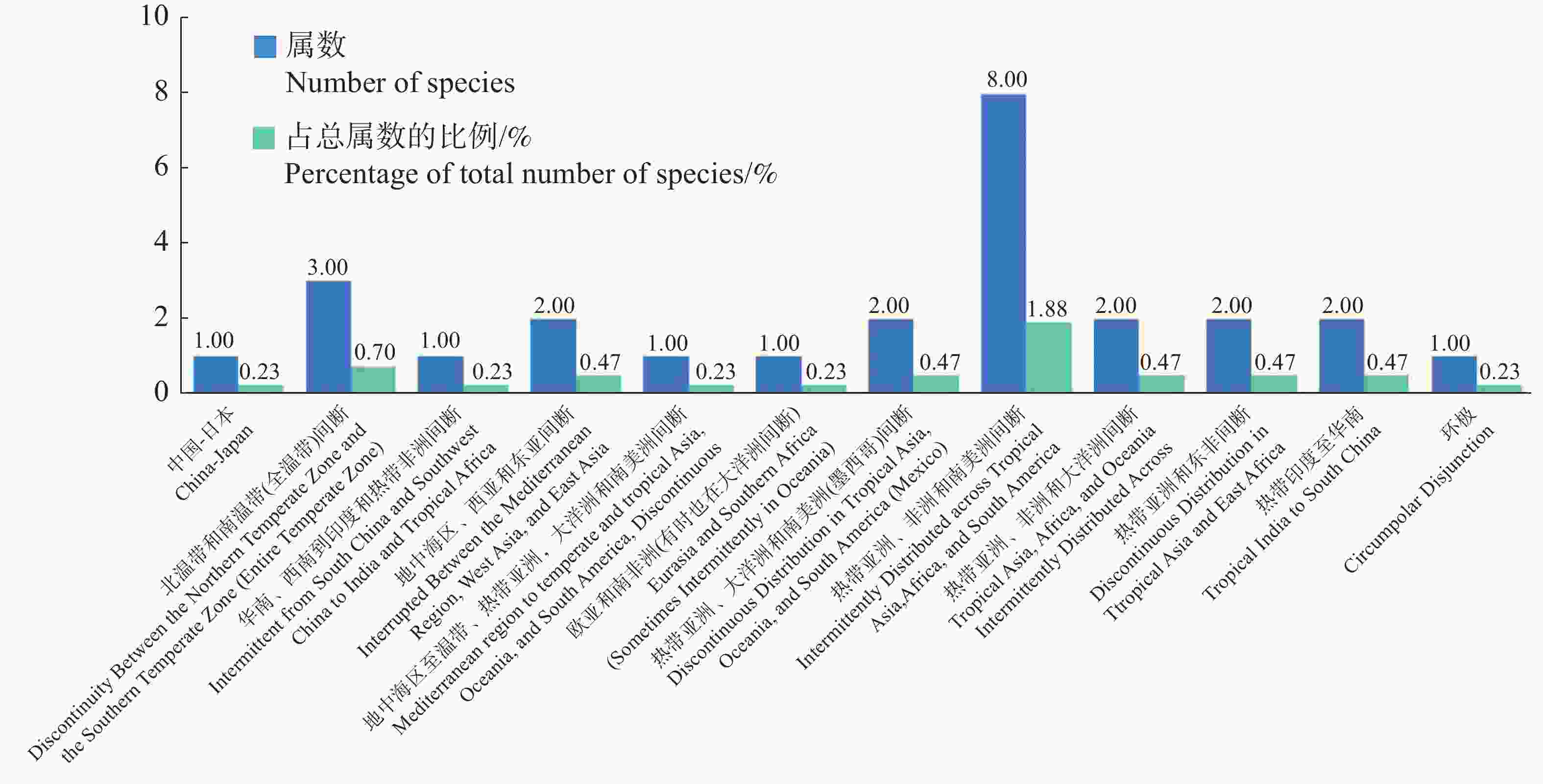 Figure 3. Distribution Area Type Statistics of Vascular Plant Genera in the Eastern Wetlands (12 types)