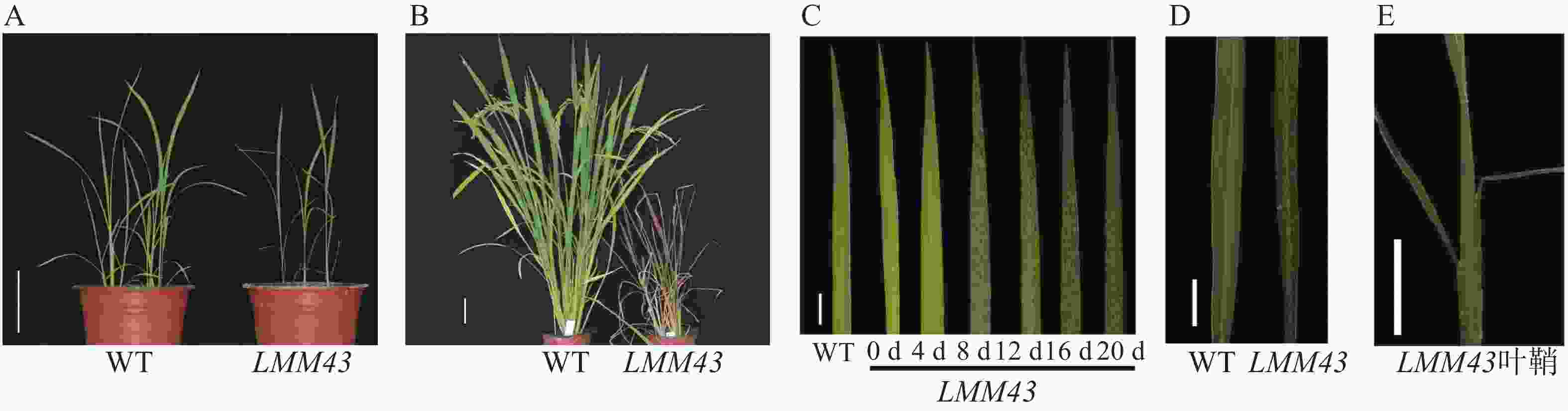 对WT和LMM43突变体进行全生育期观察,发现WT和LMM43在四叶期以前没有出现差异,从四叶期开始LMM43突变体开始在叶尖部位出现少量红褐色的坏死斑点(图1−A)。随着叶片的生长,类病斑斑点数目逐渐增加从叶尖部位逐渐扩散至整个叶片及茎秆(图1−C—E),从幼苗到成熟都带有类病斑表型,类病斑在叶片上随机分布,为扩散的全生育期型突变体。通过对比剑叶、倒二叶、倒三叶发现类病斑在老叶先产生,随后在新叶产生。与WT相比,LMM43突变体叶片枯死,严重时导致整株植株死亡,表明类病斑严重影响了水稻的生长发育(图1)。