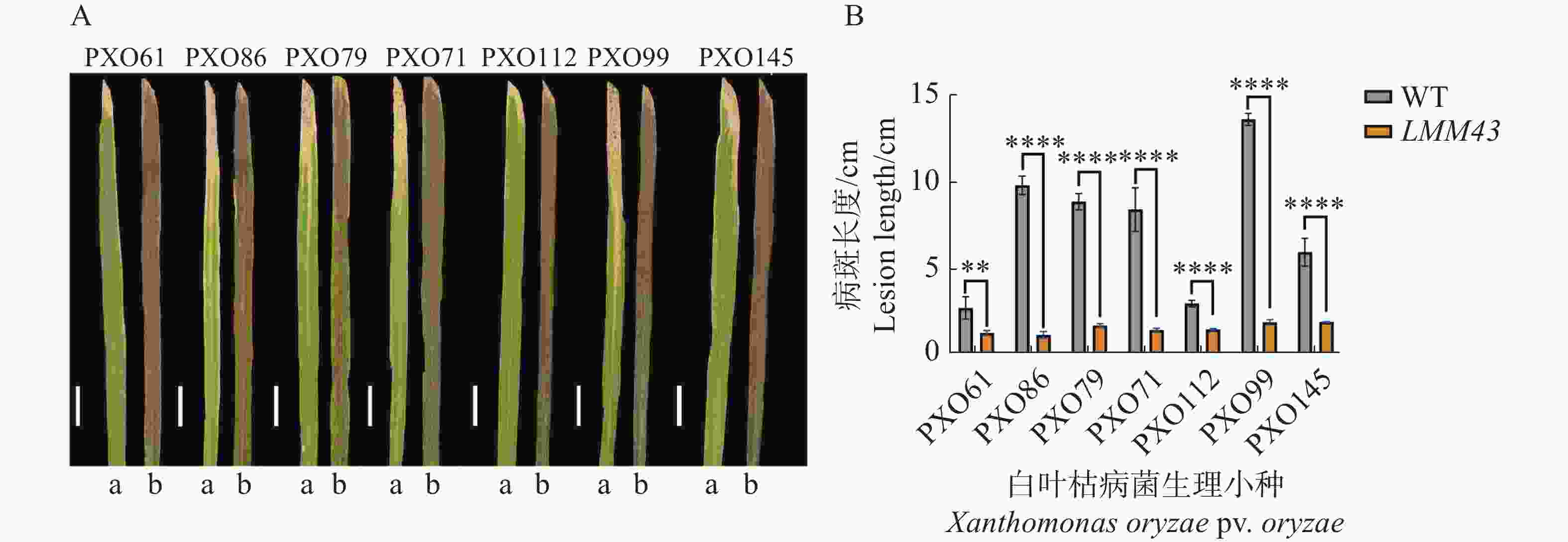 对LMM43突变体进行白叶枯病菌的抗性鉴定,通过接种实验,发现突变体对白叶枯病菌的7个生理小种的抗病性均显著增强(图2)。