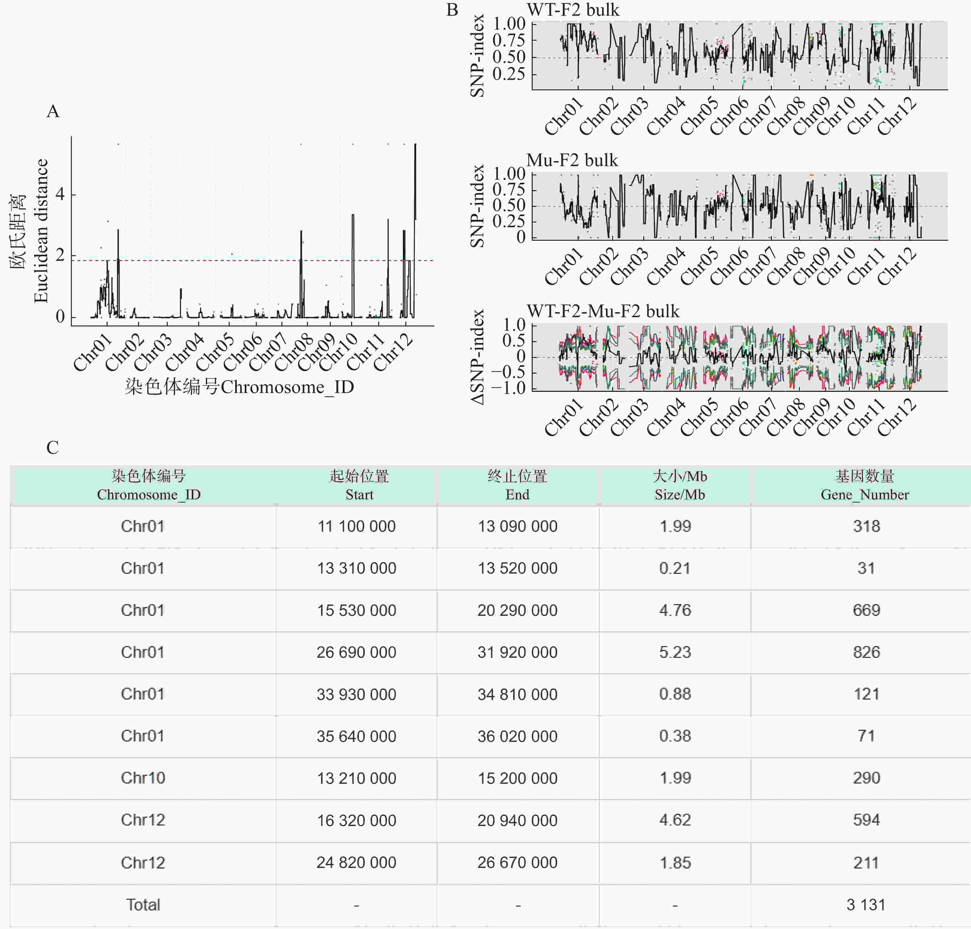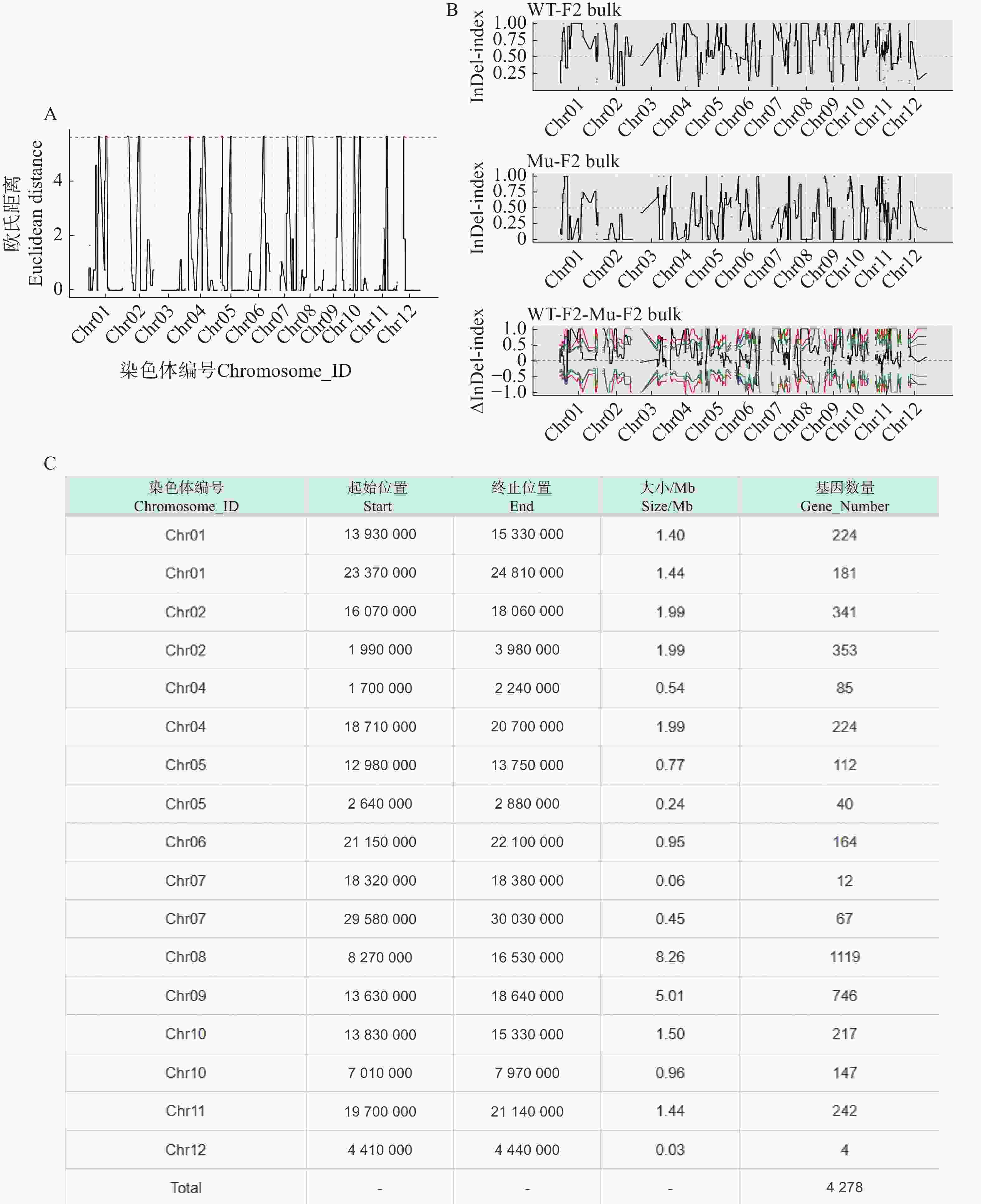 利用F2代的2个混池,将SNP和InDel分别通过ED和Index算法进行关联分析。在ED算法中先计算出每个位点的ED值再进行5次方处理以消除背景噪声,采用Distance法进行拟合后分别可以得到SNP-ED值分布图和InDel-ED值分布图(图3-A、图4−A),然后取所有位点拟合值的median+3SD作为分析的关联阈值(1.86、5.62)即得到8个SNP区域(图3−A中突起峰区域)和17个InDel区域(图4−A中突起峰区域);在Index算法中计算出分别计算出WT-F2和Mu-F2每个位点的SNP-index值,然后两者相减得到ΔSNP-index值,Distance法进行拟合后得到SNP-index值分布图和InDel-index值分布图(图3−B、图4−B),随后取阈值线为置信度0.99,得到了9个SNP区域(图3−B ΔSNP-index值分布图中位于置信度0.99的阈值线上的突起峰)和26个InDel区域(图4−B ΔInDel-index值分布图中位于置信度0.99的阈值线上的突起峰)。将SNP经2种算法得到的8个和9个区域取交集后得到3个SNP关联区域572个位点(图3−C),InDel的17个和26个区域取交集后得到17个关联区域4 278个位点(图4−C)。