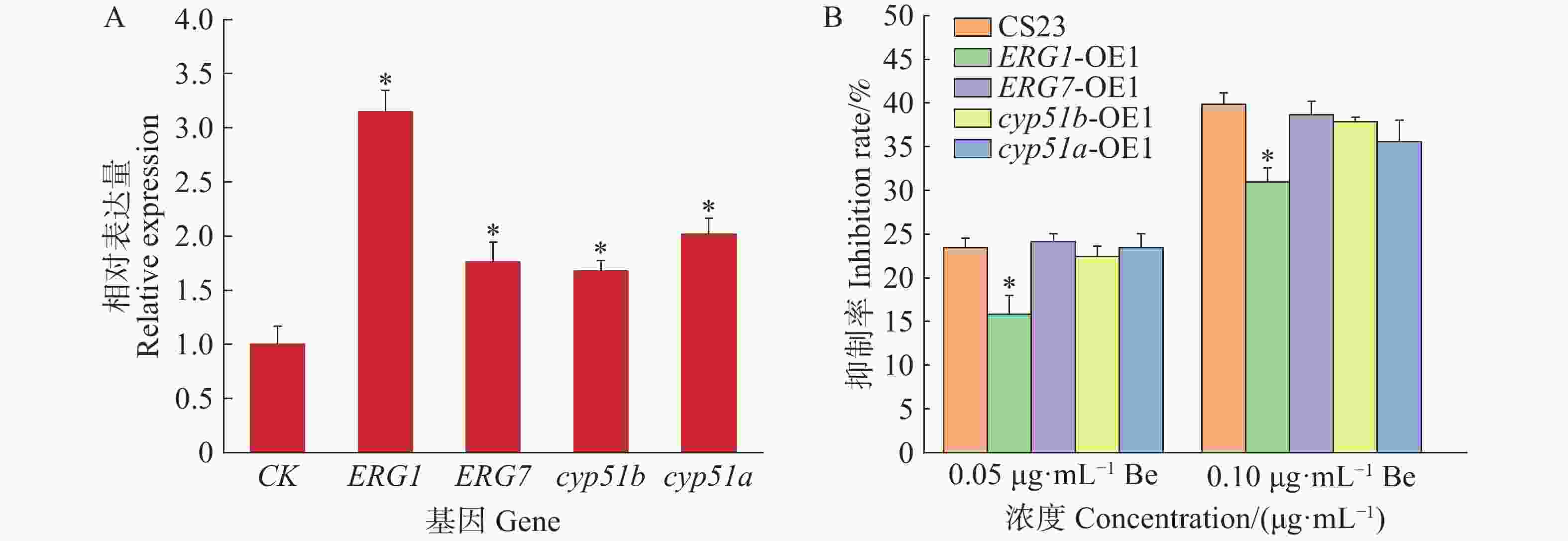 将CS23菌株和过表达菌株ERG1-OE1、ERG7-OE1、cyp51a-OE1、cyp51b-OE1在PDA平板上于28 ℃活化培养3 d后取直径5 mm菌饼置于含有100 mL PDB液体培养基锥形瓶中28 ℃和180 r·min−1下振荡培养。每个菌株设置3个生物学重复。药剂处理:摇培36 h后向培养基中加入苯并烯氟菌唑使其终质量浓度为5 μg·mL−1,继续摇培36 h。滤干菌丝多余水分,采用Trizol法提取RNA以β2-tubulin基因为内参基因比较不同条件下的基因表达式,使2−ΔΔCt方法计算每个基因的相对表达水平。基因表达量的相对标准偏差(RSD)均小于15%,数据以均值±SD形式呈现。