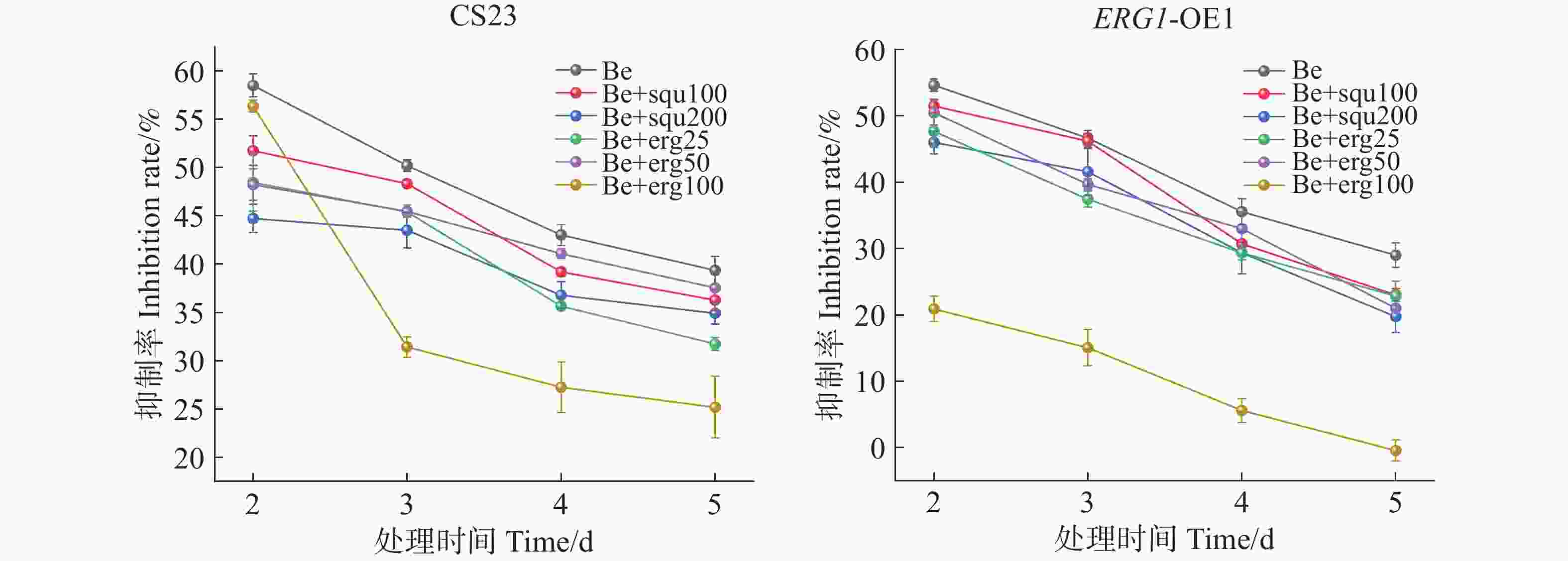 以未添加组为对照,研究外源添加角鲨烯和麦角甾醇条件下,苯并烯氟菌唑对CS23菌株及ERG1-OE1菌株菌丝生长抑制率的影响。结果表明,0.1 μg·mL−1苯并烯氟菌唑处理后2~5 d内,菌丝生长抑制率逐渐降低,外源添加不同质量浓度角鲨烯和麦角甾醇显著降低了药剂对2个菌株的抑制率,尤其在第5天时,100 μg·mL−1麦角甾醇处理下,苯并烯氟菌唑对CS23菌株的抑制率仅为25.18%,对ERG1-OE1则无抑制效果(图3)。由此可见,外源添加角鲨烯和麦角甾醇能显著降低苯并烯氟菌唑对暹罗炭疽菌的生长抑制作用。