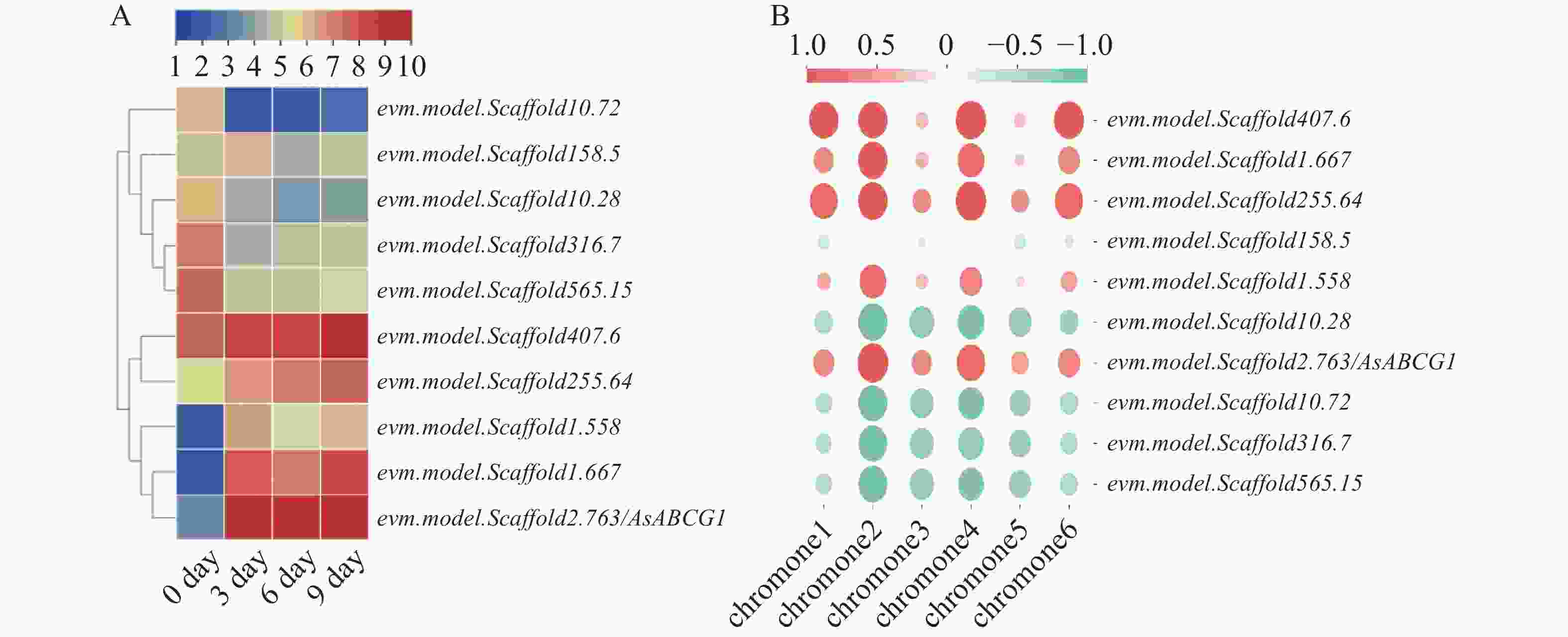 根据课题组梅文莉等专利结香技术处理的白木香转录组数据库[18],共筛选出10个差异表达的ABC转运蛋白基因。利用TBtools V2.056 软件分析其FPKM值并绘制表达量热图(图2-A),结果显示, evm.model.Scaffold2.763 基因的表达在结香剂处理后上调最为明显,将其命名为 AsABCG1。将色酮类化合物含量与ABC基因表达进行相关性分析(图2-B),结果显示,10个具有差异表达的AsABC基因中5个与色酮类具有不同程度的正相关性,另外5个则具有不同程度的负相关性,而AsABCG1与几种主要的色酮类化合物均表现出较高的正相关性,说明AsABCG1可能参与沉香色酮等代谢物的积累。