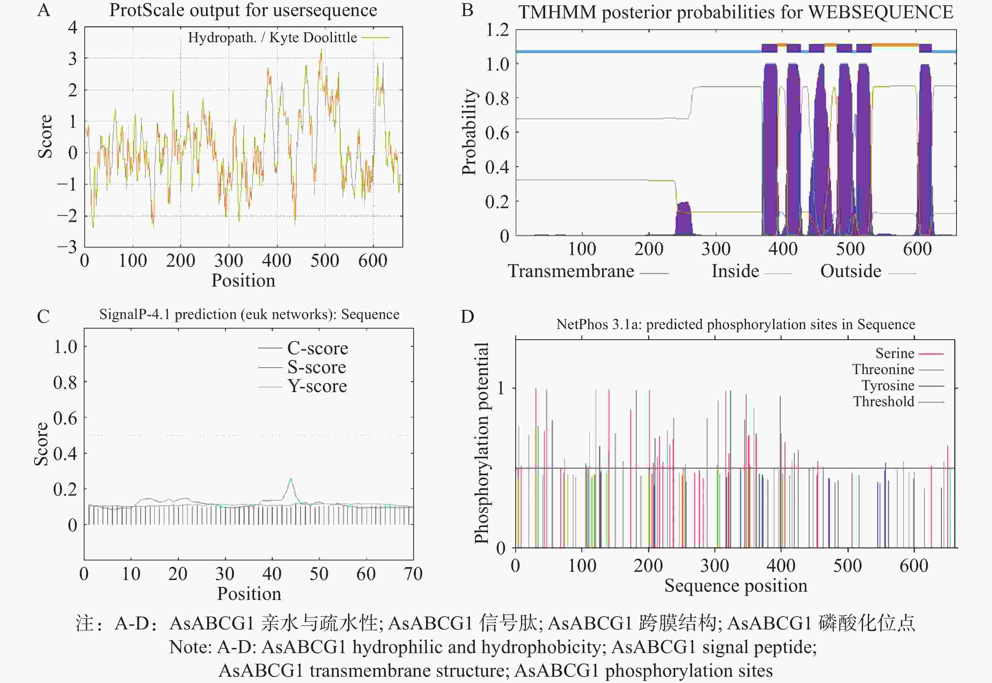 3327 H5222 N872O931S38)相对分子量约为73.56 kDa,理论等电点(pI)值为8.64。其脂肪系数为96.07,不稳定系数为40.98。电荷分析显示该蛋白含有56个负电荷残基(Asp + Glu)和62个正电荷残基(Arg + Lys)。平均亲水性系数为0.139,结合其多肽链存在显著的非亲水性区域,表明AsABCG1属于疏水蛋白(图4-A)。TMHMM server V2.0跨膜结构在线预测表明编码该蛋白的661个氨基酸中共包含6个跨膜结构域,确认为跨膜蛋白图(4-B)。信号肽在线预测显示AsABCG1蛋白C-score、S-score、和Y-score分值都较低,且不存在信号肽剪切位点,为非分泌性蛋白(图4-C)。此外,NetPhos 3.0预测揭示AsABCG1存在较多的潜在磷酸化位点,其中丝氨酸(Ser)最多共有33个,苏氨酸(Thr)为21个,酪氨酸(Tyr)为6个(图4-D)。