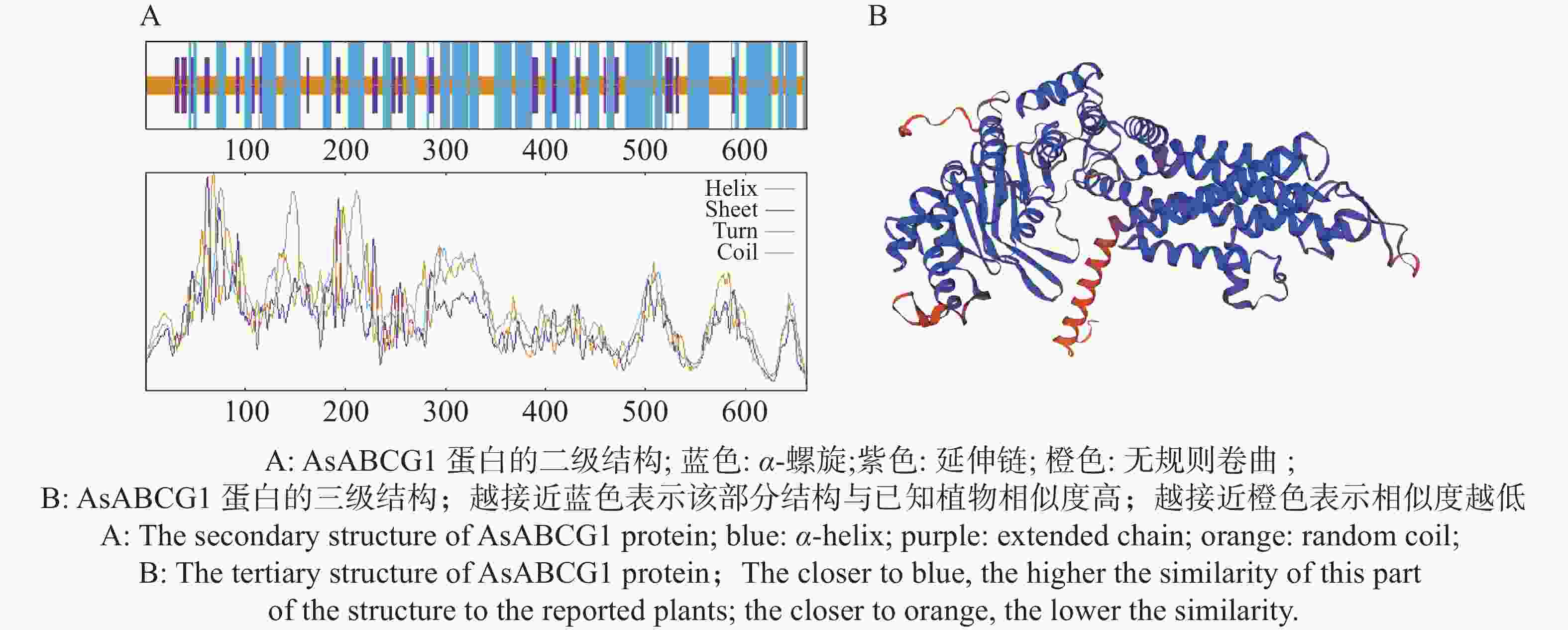 蛋白二级结构有α-螺旋、β-折叠、无规则卷曲和延伸链等。SOPMA在线预测AsABCG1蛋白二级结构(图5-A)结果显示,其结构主要为α-螺旋(48.26%)、无规则卷曲(39.49%)另还有较少的延伸链(12.25%)。α-螺旋是蛋白质二级结构的主要形式,主要由其精确的原子级结构决定,具有高度的规律性和稳定性,能够构成跨膜通道并转运蛋白;无规卷曲是由主链骨架无规律排列形成的构象,能够介导分子识别与结合、构成催化位点、作为翻译后修饰和调控的位点;延伸链指的是构成 β-折叠的肽链构象,也称为β-构象,为蛋白质提供了独特的刚性、平坦和抗拉伸的结构基元。AsABCG1中α-螺旋为其主要结构,结合该结构的功能,可进一步证实该蛋白属于跨膜蛋白。