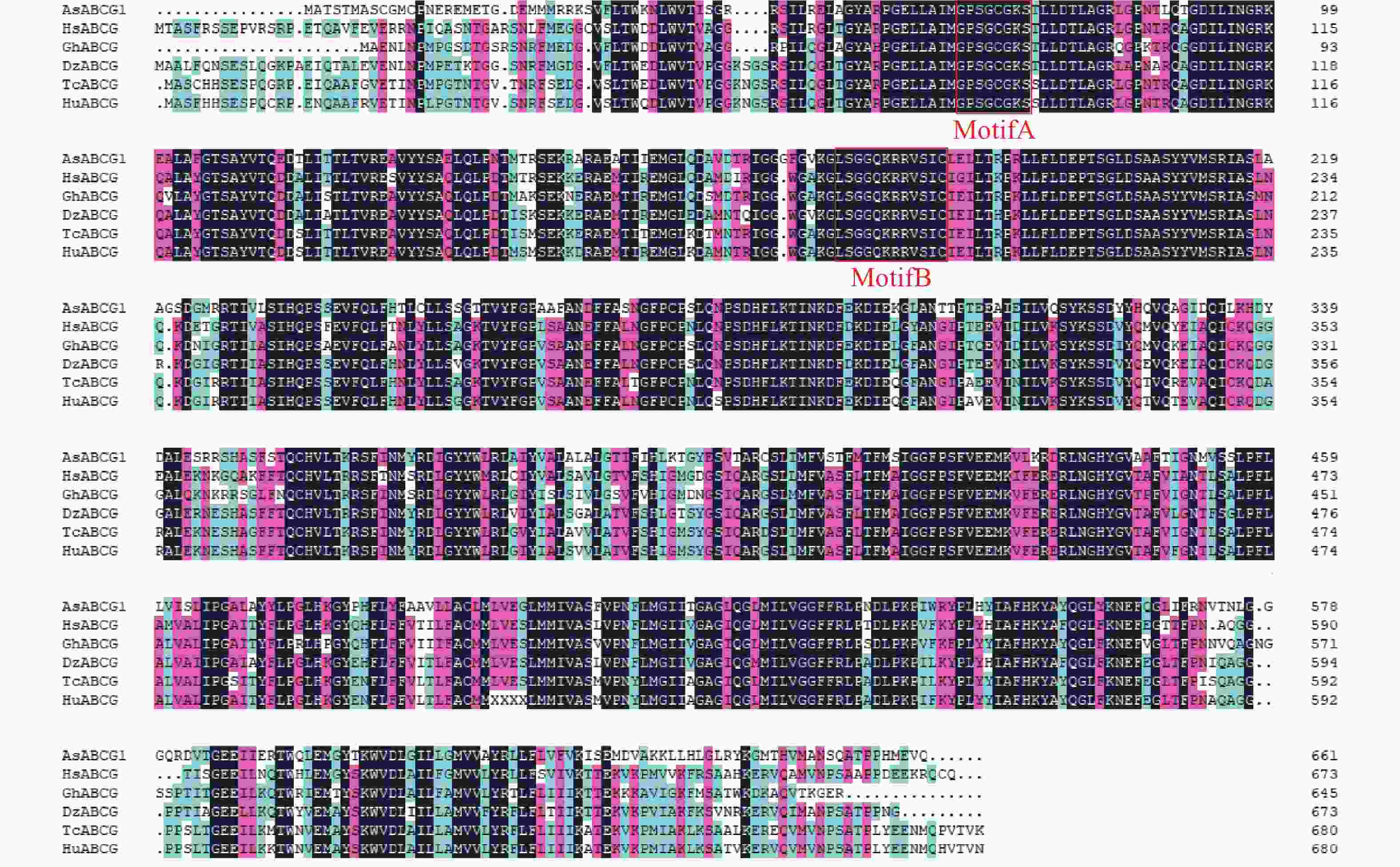 从NCBI中下载与AsABCG1同源性较高的氨基酸序列,并做同源性对比(图6)。结果显示AsABCG1具有典型的植物ABC转运蛋白结构特征,包含两个保守结构域(MotifA和MotifB)。AsABCG1与木槿(Hibiscus syriacus)HsABCG、陆地棉(Gossypium hirsutum)GhABCG、榴莲(Durio zibethinus)DzABCG、可可树(Theobroma cacao)TcABCG、哥伦比亚锦葵(Herrania umbratical)HuABCG中ABC蛋白同源性分别为69.39%、69.77%、69.77%、69.24%、69.20%。