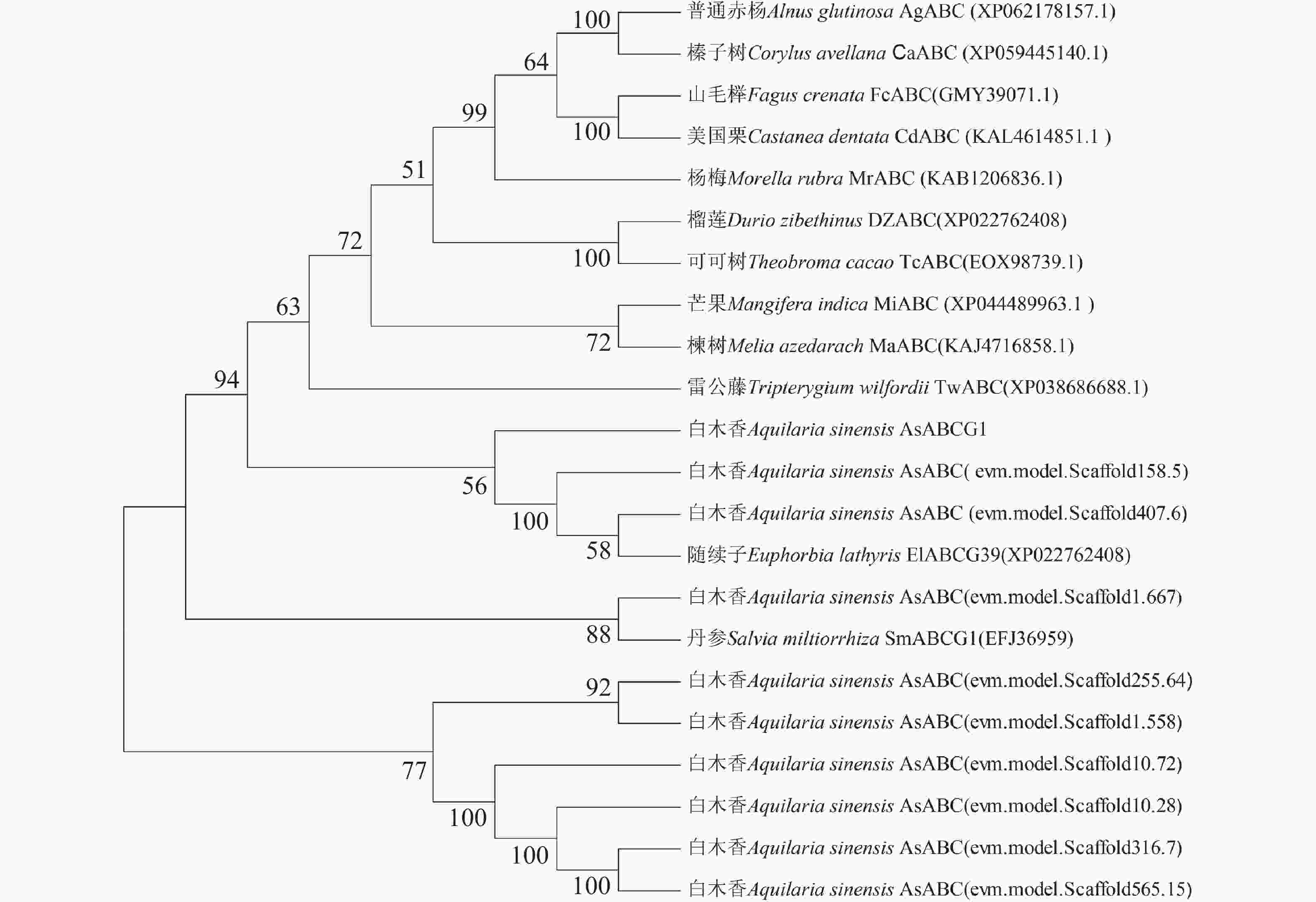 通常健康的白木香树不会产生沉香,只能在损伤后诱导才能形成[24]。研究表明,伤害处理和茉莉酸甲酯处理可诱导沉香中倍半萜和2-(2-苯乙基)色酮类化合物产生并促进次生代谢物形成[25-27]。本研究发现AsABCG1启动子存在多个茉莉酸和防御胁迫相关响应元件,进一步表达分析显示茉莉酸甲酯处理和伤害处理均可显著诱导AsABCG1基因的表达,说明AsABCG1参与了白木香伤害和茉莉酸信号转导,可能介导倍半萜和2-(2-苯乙基)色酮类化合物的转运。本研究不仅为沉香属植物研究提供了一个新的候选基因,也为深入揭示AsABCG1在沉香特征性成分转运与积累中的功能奠定了重要基础。后续将对该基因是否参与次生代谢物的转运等功能进行验证,并进一步解析其表达调控机制,以系统阐明ABC转运蛋白在沉香特征性成分转运过程中的功能及调控网络。相关研究结果有望为开发新型结香诱导技术、提升沉香特征性成分的积累水平提供理论依据和技术支撑。在此基础上可对该基因是否具有转运次生代谢物等功能进行验证,以期探究ABC转运蛋白对调控沉香特征性成分转运的分子机制并进一步揭示沉香特征性成分的转运和调控机理。