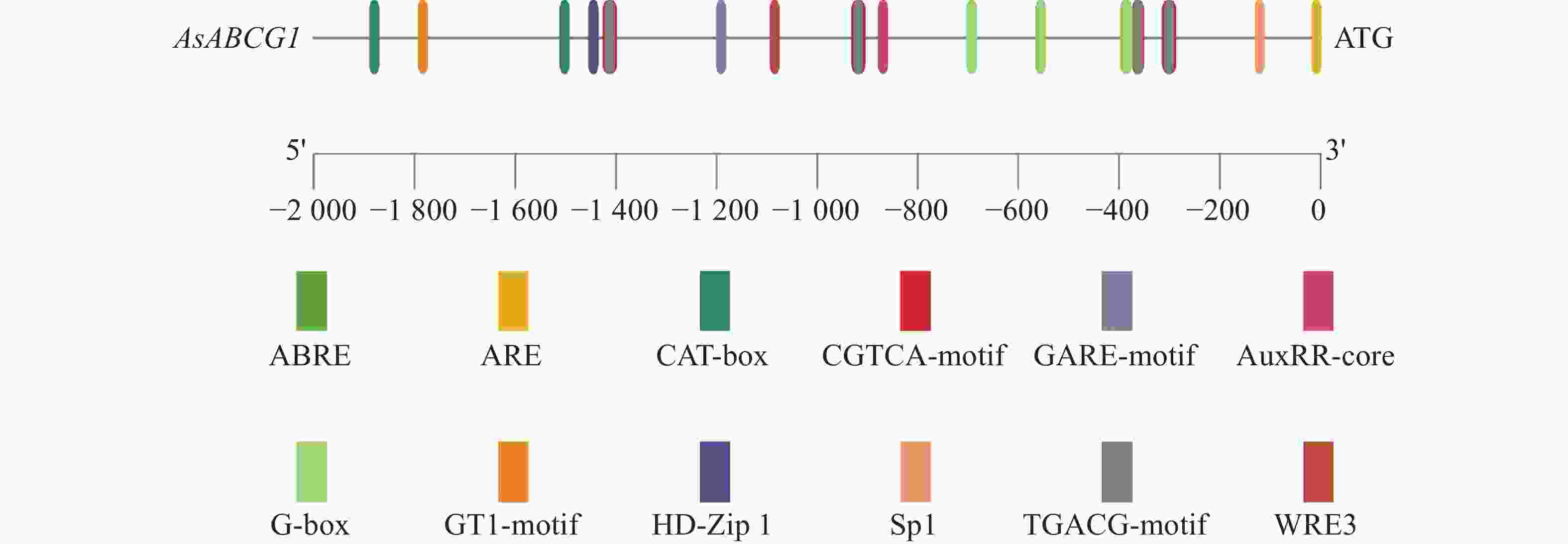 用PlantCARE对AsABCG1基因启动子区进行分析,结果(图8)显示,该区域存在多种参与植物表达调控的顺式作用元件,包括参与光响应调控(G-box cis-acting element)G-box;参与茉莉酸(Jasmonic acid response element)TGACG-motif、生长素 (auxin response element)AuxRR-core、赤霉素(Gibberellin Response Element)GARE-motif、脱落酸(abscisic acid response element)ABRE 等多种激素调控;参与胁迫响应如厌氧诱导反应(Anaerobic Response Element)ARE、机械损伤响应元件(Wound Responsive Element 3)WRE3以及参与植物生长发育等相关元件。以上结果表明,AsABCG1基因的表达可能受到这些因素的调控。