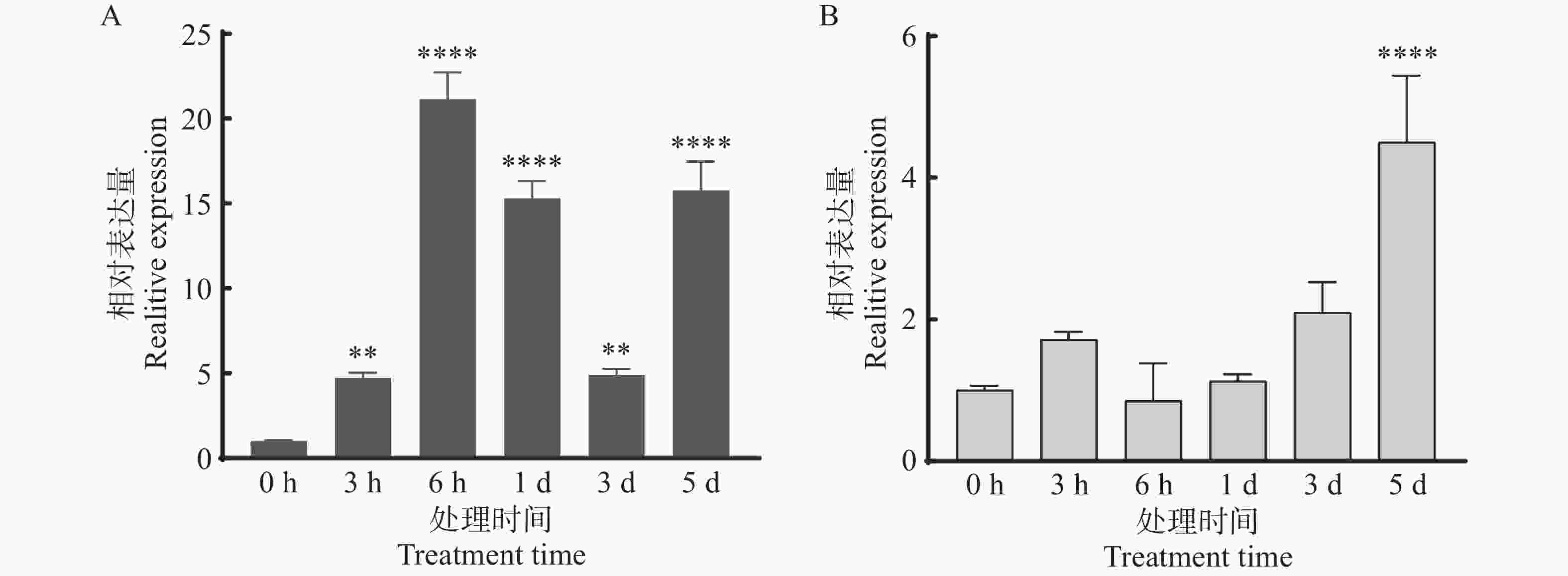 采用RT-qPCR技术分析了AsABCG1在茉莉酸甲酯和机械伤害处理下的表达模式,结果显示,AsABCG1基因对两种处理均表现出显著的应答反应。在茉莉酸甲酯处理下(图9-A),AsABCG1的表达在各时间点均明显上调,其中在处理6 h后表达量达到最高,为对照组的21.1倍。而在机械伤害处理中,基因表达量在处理5 d后才达到峰值,为对照组的4.5倍(图9-B)。上述结果表明,AsABCG1可能参与了茉莉酸信号通路和机械伤害应答的生理过程。