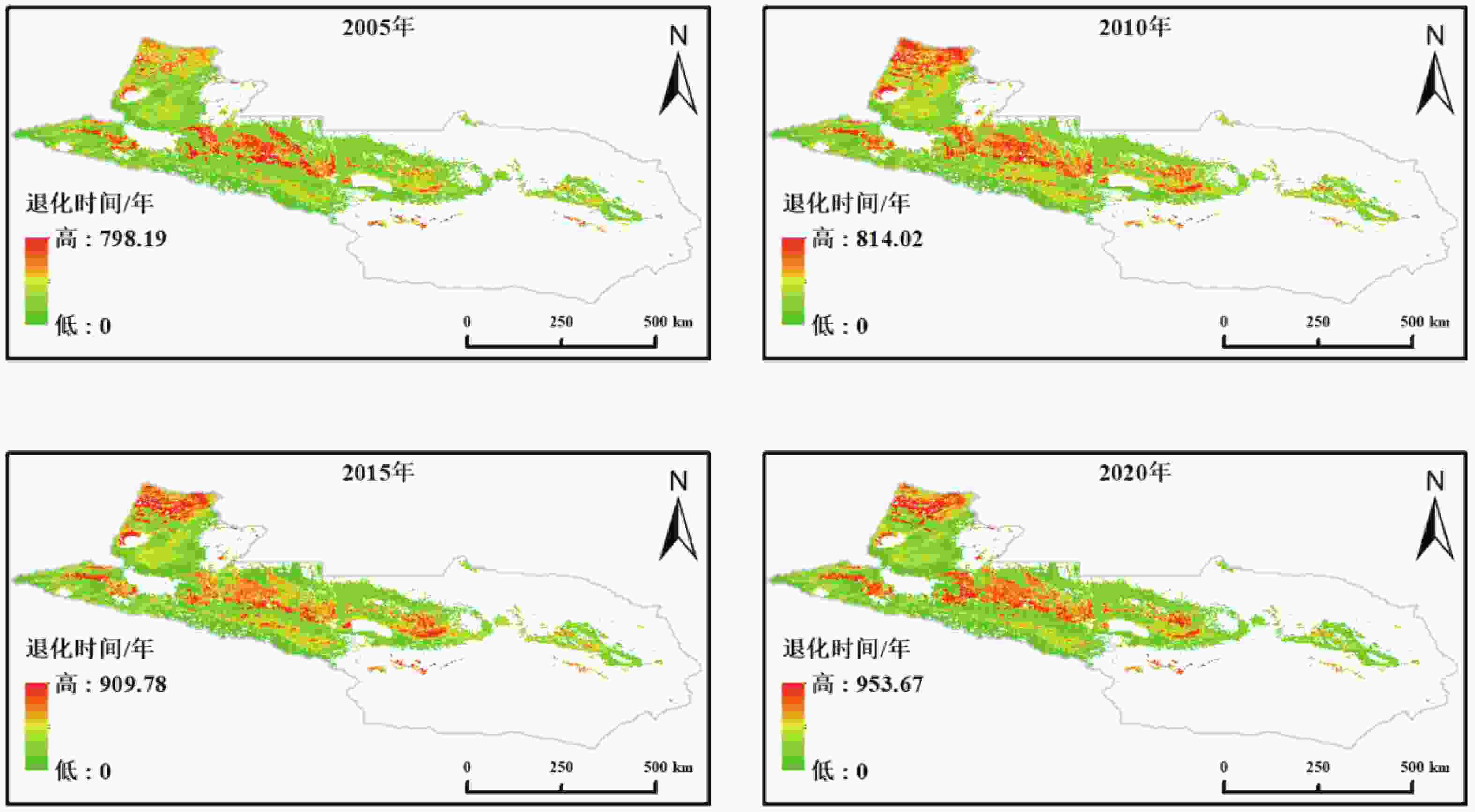 Figure 3. Spatial distribution of grazing thresholds and degradation time of grasslands on the northern Tianshan Mountains