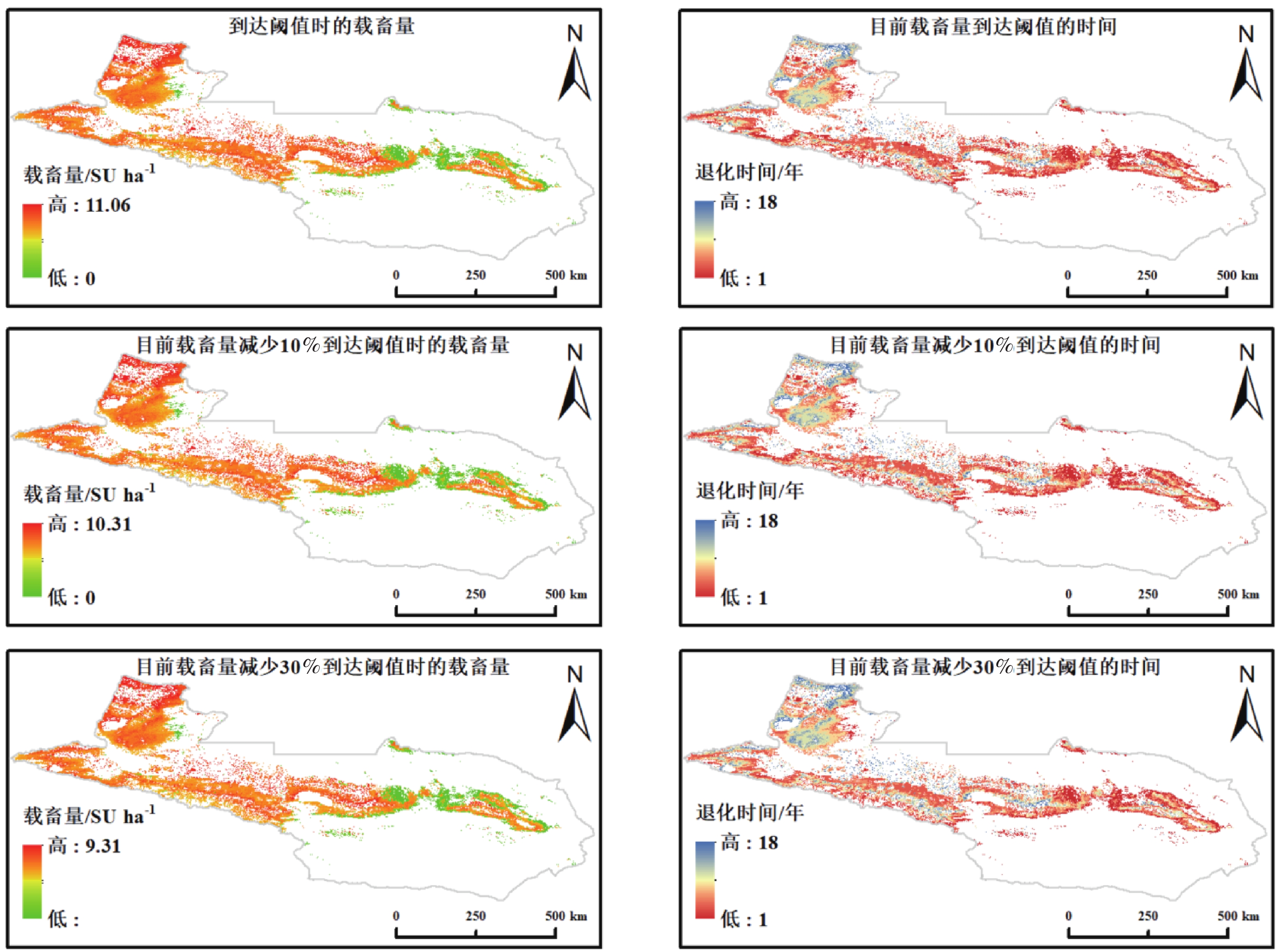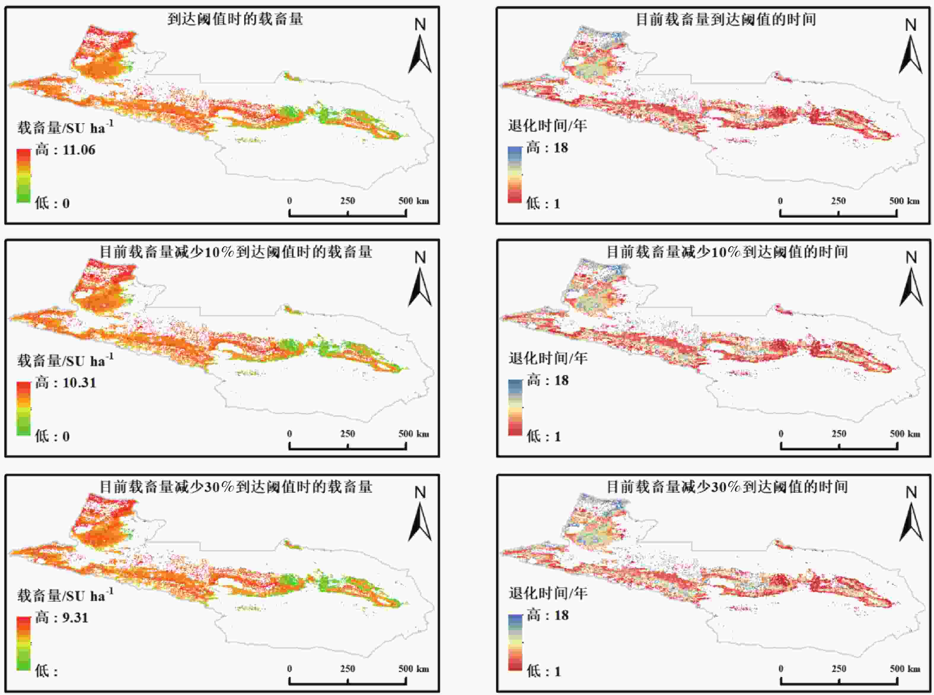 2)在现有载畜水平下,草地退化年限分布于 1–18 年,临界载畜量范围为 0–11.06 SU·ha−1。部分区域出现临界载畜量为零的情况,说明当前已处于或超过生态承载极限。高寒草甸和草甸草原具有较高的生态耐受性与承载潜力,而典型草原与荒漠草原退化速率较快、系统脆弱性较高。