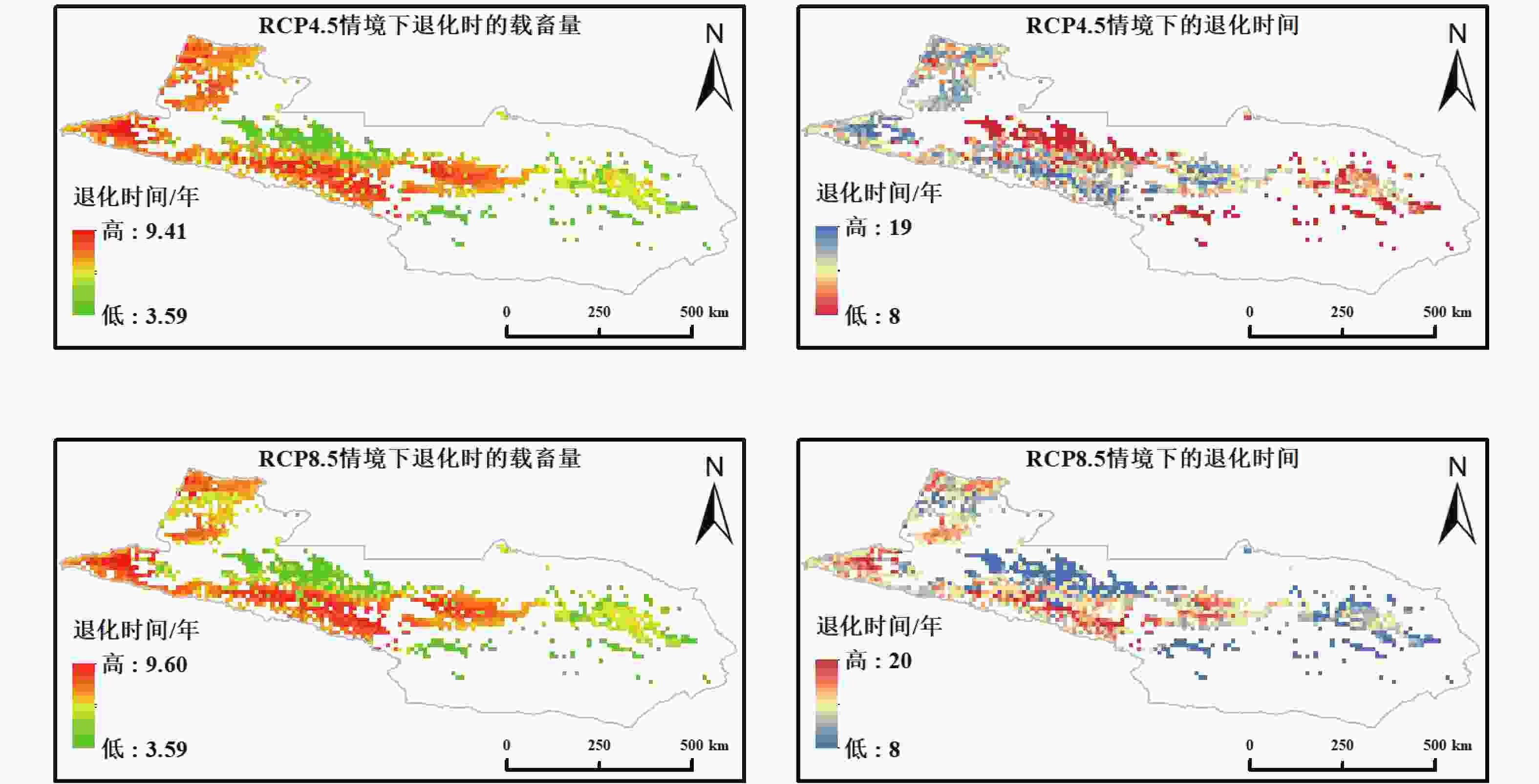 基于 RCP4.5 与 RCP8.5 两种气候情景输入的未受放牧影响的 NPP,本研究对天山北坡草地的临界载畜量与达到退化阈值所需年数进行了空间化模拟(图4)。两种气候情景下临界载畜量范围均较当前情景有所降低,其中 RCP4.5 情景下为 3.49~9.41 SU·hm−2,RCP8.5 情景下为 3.49~9.60 SU·hm−2。退化年限整体分布于 8~20 a 之间,明显高于当前载畜情景的 1~18 a,表明在气候变暖背景下草地的未受放牧影响的恢复期有所延长。