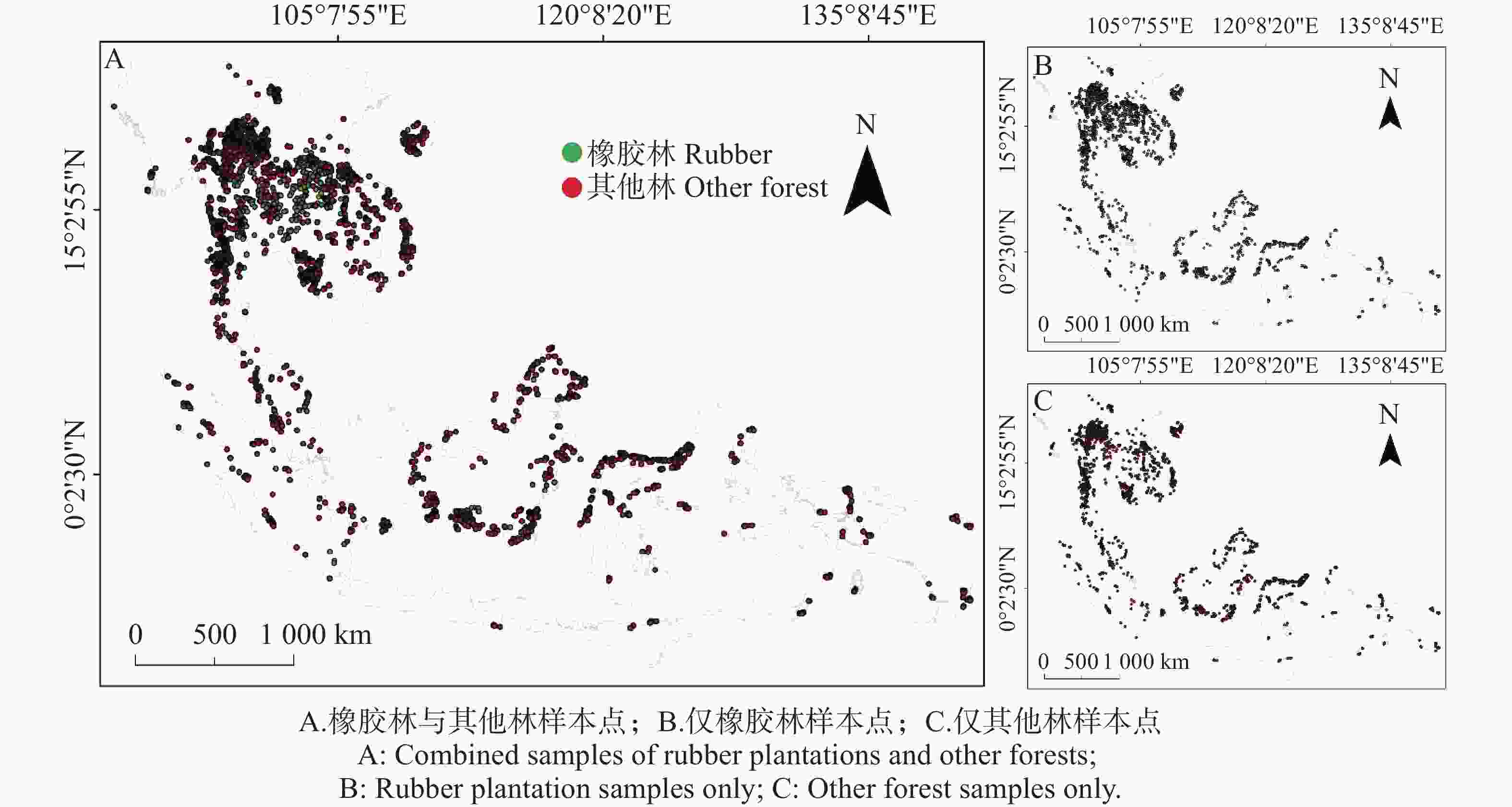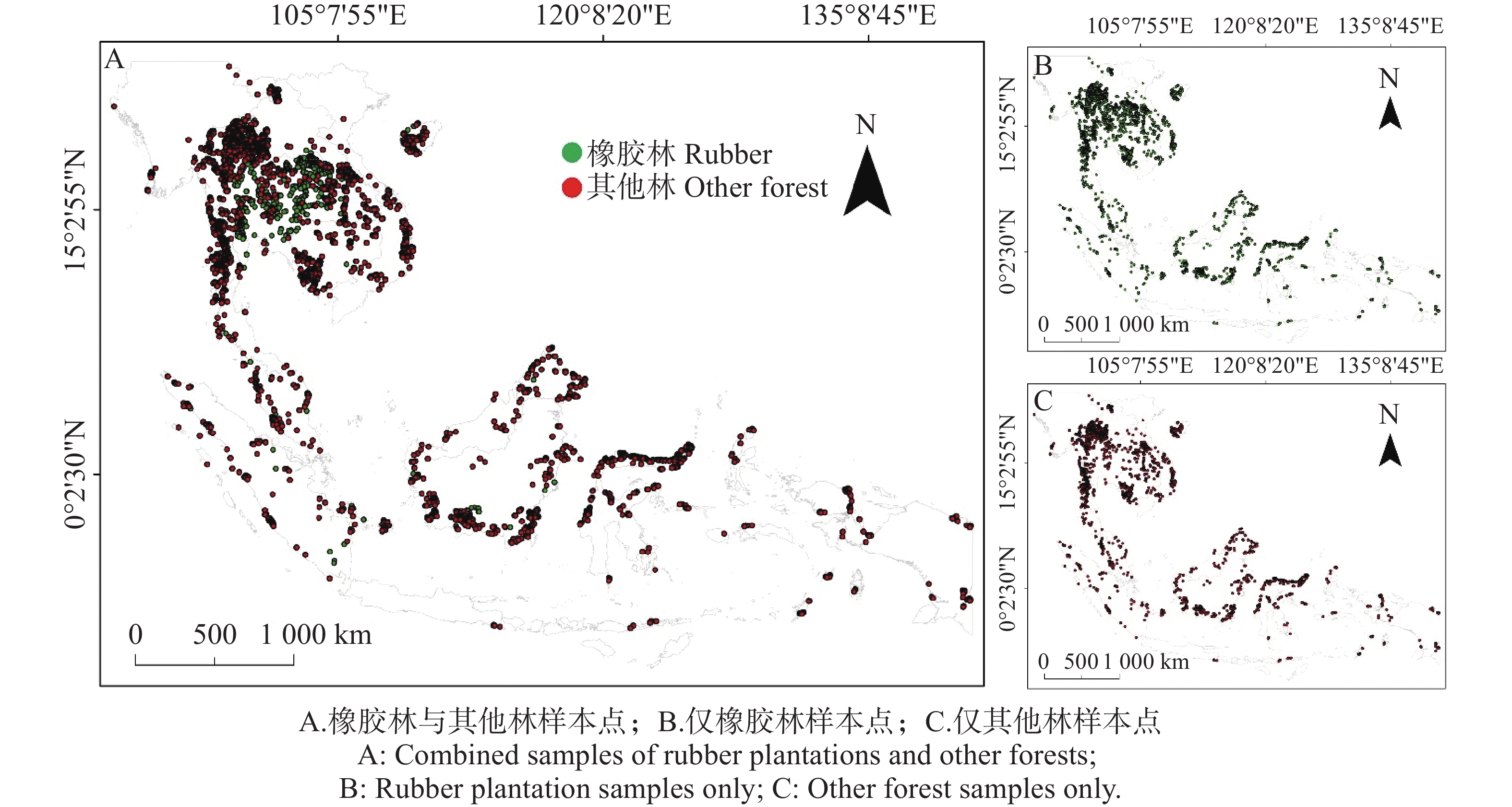 本研究所使用的橡胶林样本点(图1)综合整合了多源信息,主要包括三类数据来源:(1)海南岛实地调查获取的高可信度样本点;(2)基于区域已有的橡胶林分布数据中筛选出的可靠橡胶林像元[1,40,41],以及(3)通过高分辨率遥感影像进行目视解译所获得的橡胶林样本。其他林(非橡胶林)样本的构建则由两部分组成:一部分来自海南岛实地调查的非橡胶林样本点;另一部分来源于LUCU数据集中森林类别所对应的非橡胶林像元。此外,为确保与橡胶林样本的空间环境保持一致性,我们进一步从LUCU数据中识别出与橡胶林像素相邻的森林地块,将其作为周边森林的代表性样本,以增强非橡胶林样本在结构、物候和环境条件上的可比性。主要使用了MODIS数据包括:8天平均的1 km昼/夜地表温度数据(MOD11A2)[42] 和下行短波(DSR)数据MCD18A1[43]、每日500 m的反照率数据(VNP43DNBA3)[44]、8天的500 m潜热数据(MOD16A2)[45];除此之外还有月度的感热数据(GLEAM4.2a)[46],每日1 km的下行长波(SLDR)数据(ELITE)[47]。由于部分地区云影或者其他因素影响出现的空值,这部分数据均被剔除。其中,反照率数据同时包含短波(0.3~5.0 µm)宽谱段的定向半球反射率(黑天反照率)与双向半球反射率(白天反照率),为了更接近实际条件的情况下,我们取两者的平均进行分析[44,48]。其中,所有遥感数据均被重采样至1 km空间分辨率,用于统计分析和成对比较。此外,本研究还采用了来自全球气候变化研究数据集(ISIMIP)的数据2m温度数据[49],并通过温度–植被指数方法(TVX)将分辨率降为1km[50]。样本点则是东南亚范围内共计