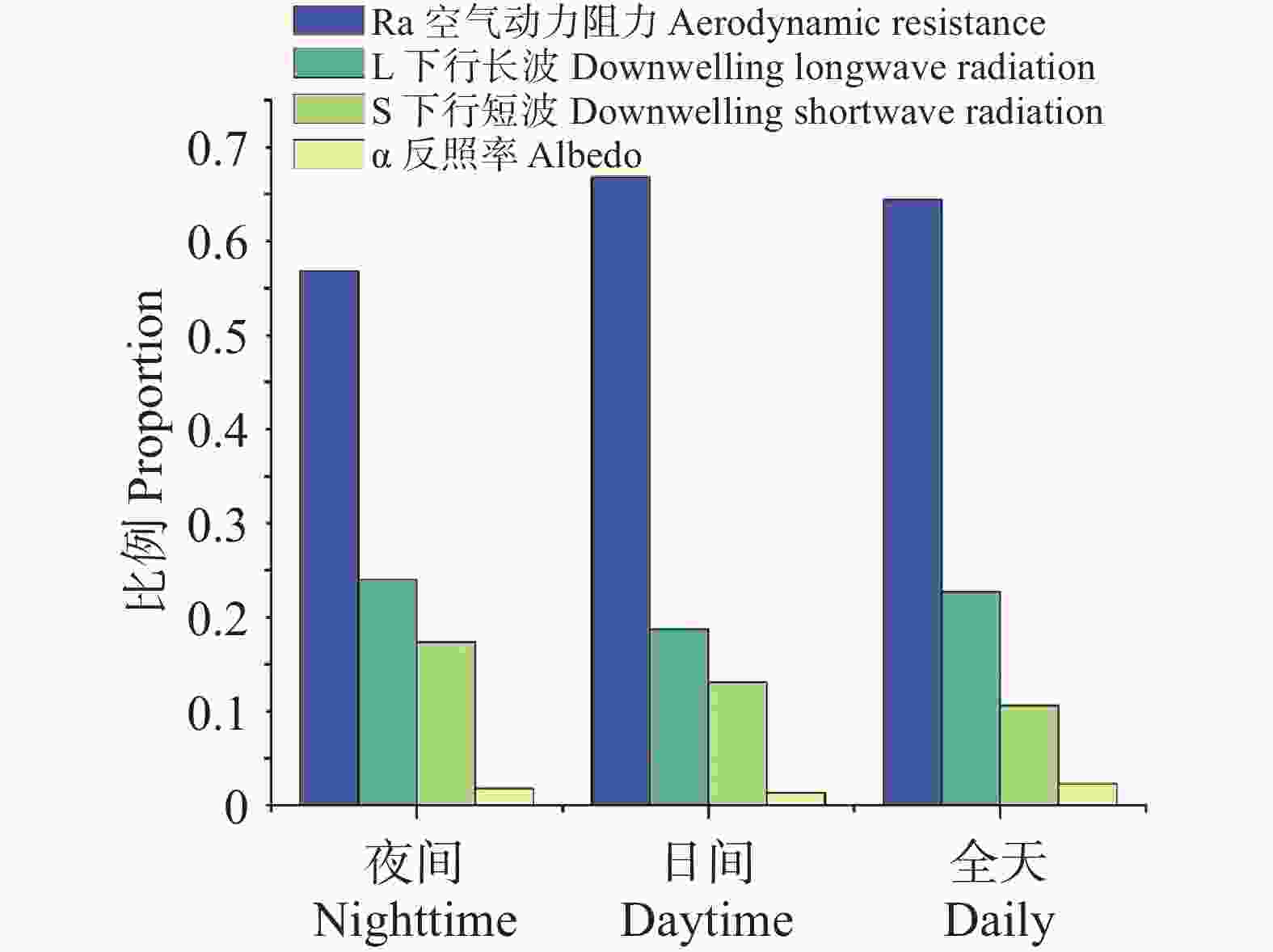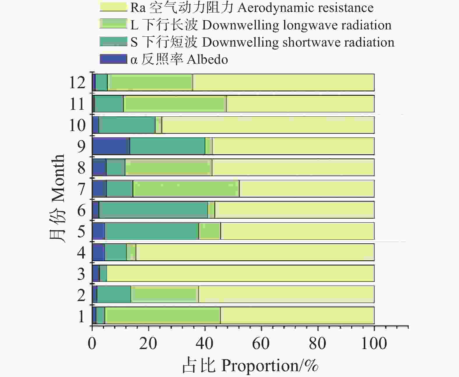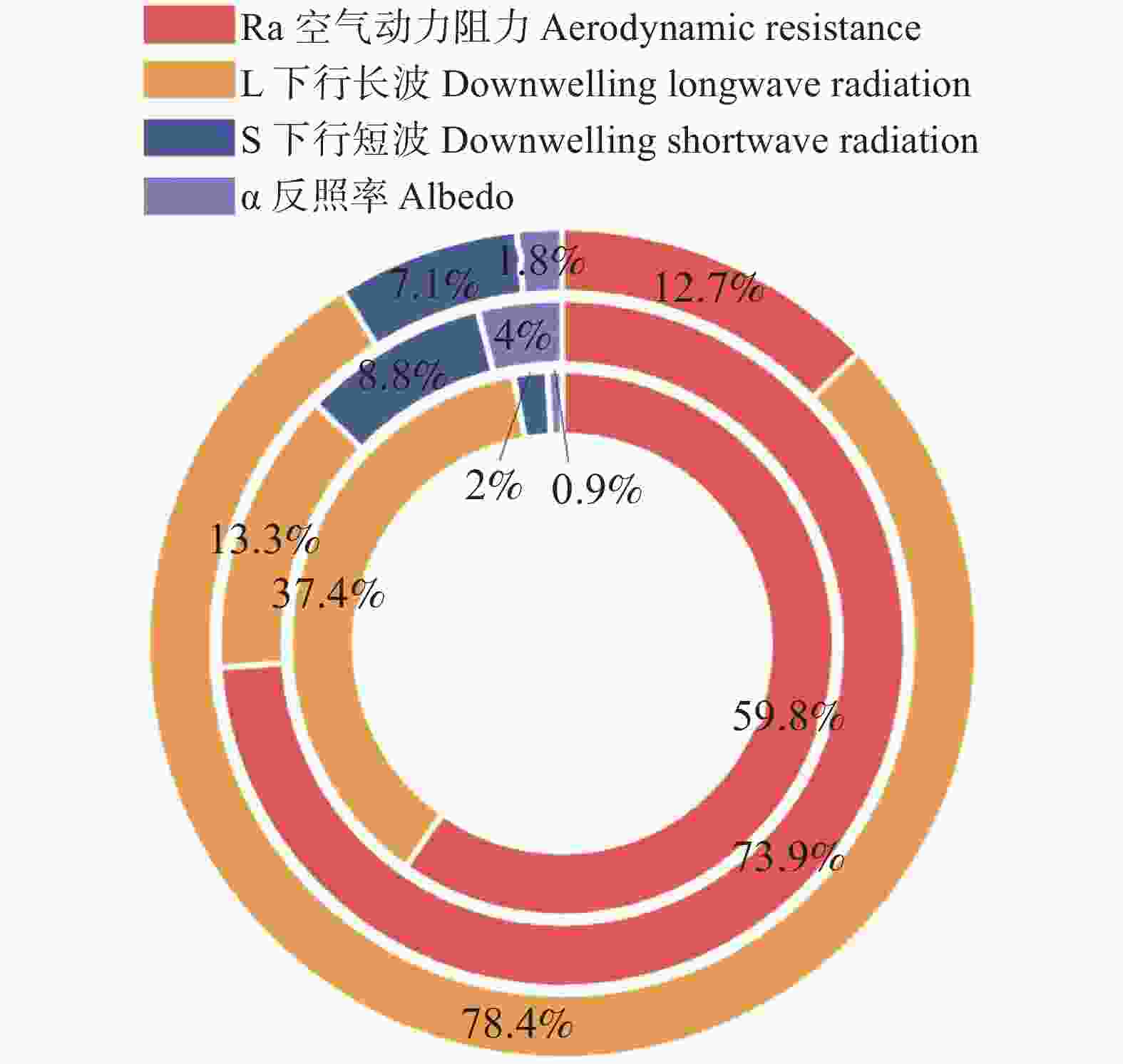月份 Month $ \Delta {T}_{S} $/(℃) $ \left(\dfrac{\partial T}{\partial \alpha }\right)\Delta \alpha $ $ \left(\dfrac{\partial T}{\partial S}\right)\Delta S $/(W·m−2) $ \left(\dfrac{\partial T}{\partial {L}_{\downarrow }}\right)\Delta {L}_{\downarrow } $/(W·m−2) $ \left(\dfrac{\partial T}{\partial {r}_{a}}\right)\Delta {r}_{a} $/(s·m−1) 1 0.34 0.03 0.07 −0.90 1.20 2 0.82 0.03 0.21 −0.42 1.09 3 1.03 0.03 0.03 0 1.10 4 0.87 0.04 0.07 0.03 0.76 5 0.85 0.04 0.30 0.07 0.49 6 1.16 0.03 0.47 −0.03 0.69 7 0.07 0.06 −0.11 −0.44 0.56 8 0.3 −0.06 −0.08 −0.37 0.69 9 0.5 0.10 0.20 −0.02 0.43 10 0.25 0.02 0.17 −0.02 0.64 11 0.67 0.02 0.26 −0.92 1.32 12 0.73 0.02 0.08 −0.56 1.19 总计 Total 0.63 0.03 0.14 −0.30 0.85 注:$ \Delta {T}_{a} $和$ \Delta G $的贡献值过小,故未在表中展示 Note: The contributions of $ \Delta {T}_{a} $ and $ \Delta G $ are negligible and therefore not shown in the table. Table 1. Contributions of different factors to the temperature difference (°C)