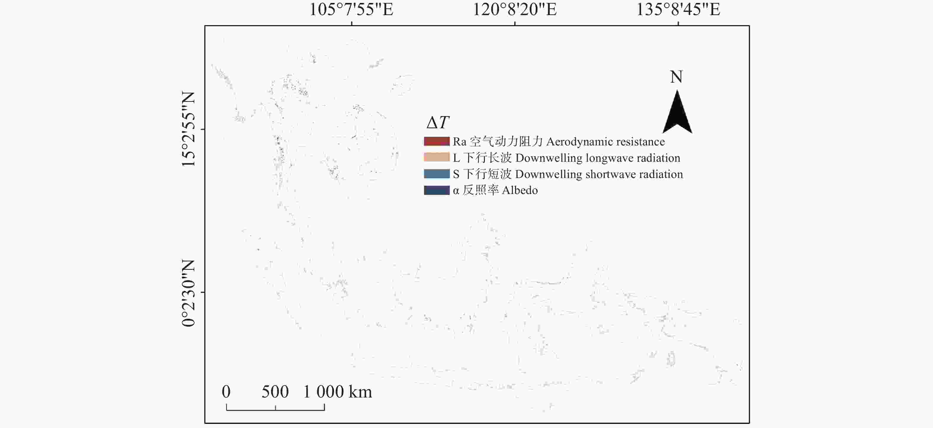 5.670374419 ×10−8W/m2K−4;ρ表示空气密度,约为1.2 kg/m3;$ {C}_{P} $为空气在定压条件下的比热容,1004J/(kg∙K−1);$ {r}_{a} $:空气动力阻力,单位为s·m−1;H:显热通量,单位为W·m−2;LE:潜热通量,单位为W·m−2。其中,Δ表示变化量(即橡胶林和周边其他林差异)。偏导数表示LST对各地表生物物理因子变化的敏感性,这些敏感性的解析形式可由$ {T}_{S} $的表达式推导得到[52]。