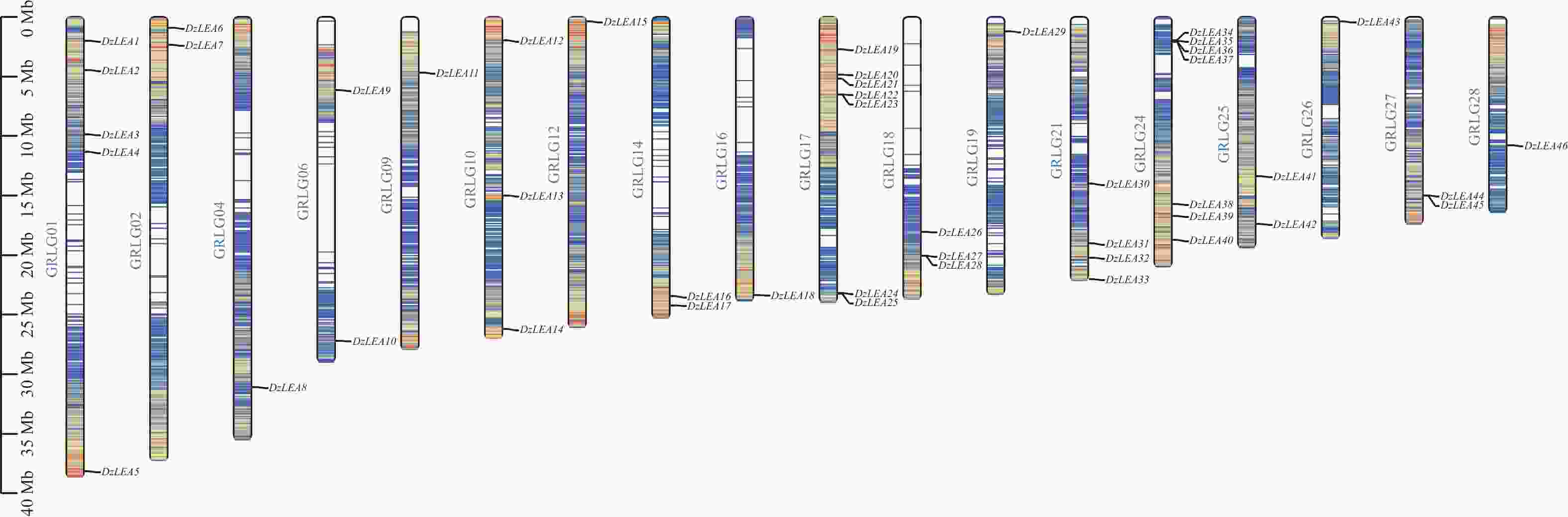 • 对DzLEA家族成员在染色体上的位置进行分析(图1),46个DzLEA家族成员分布在18条染色体上,且呈现不均匀分布。其中,17号和24号染色体均含有7个DzLEAs基因;1号和21号染色体上分别含有5个和4个DzLEAs基因;10号和18号染色体上均含有3个DzLEAs基因;2号、6号、14号、25号和27号染色体均含有2个DzLEAs基因;4号、9号、12号、16号、19号、26号和28号染色体各含有1个DzLEAs基因。并且,通过染色体定位图显示,DzLEA22DzLEA23DzLEA27DzLEA28DzLEA36DzLEA37DzLEA44DzLEA45,这四组基因距离相近,推测以上成员存在遗传连锁和多种复制事件的可能性。