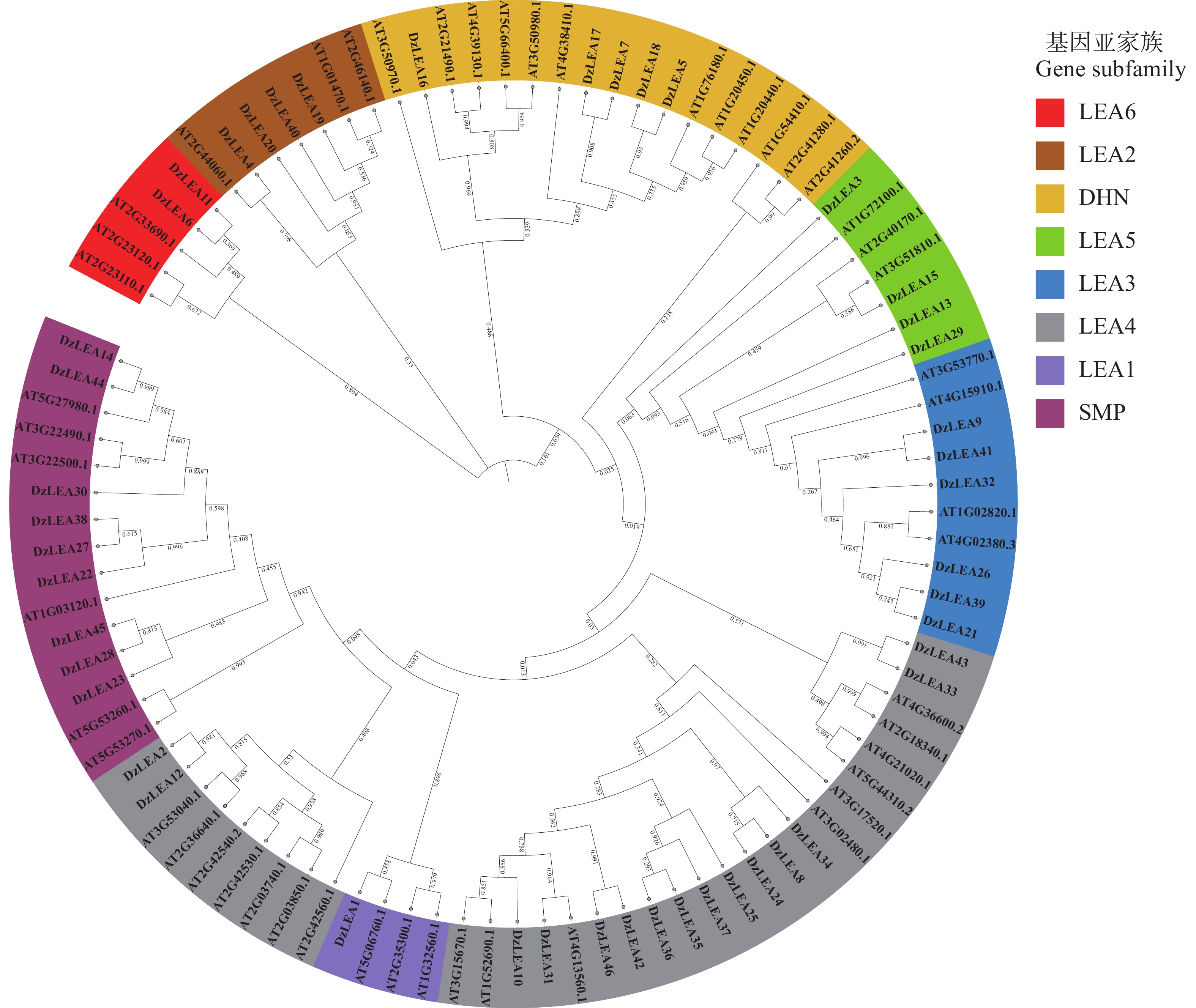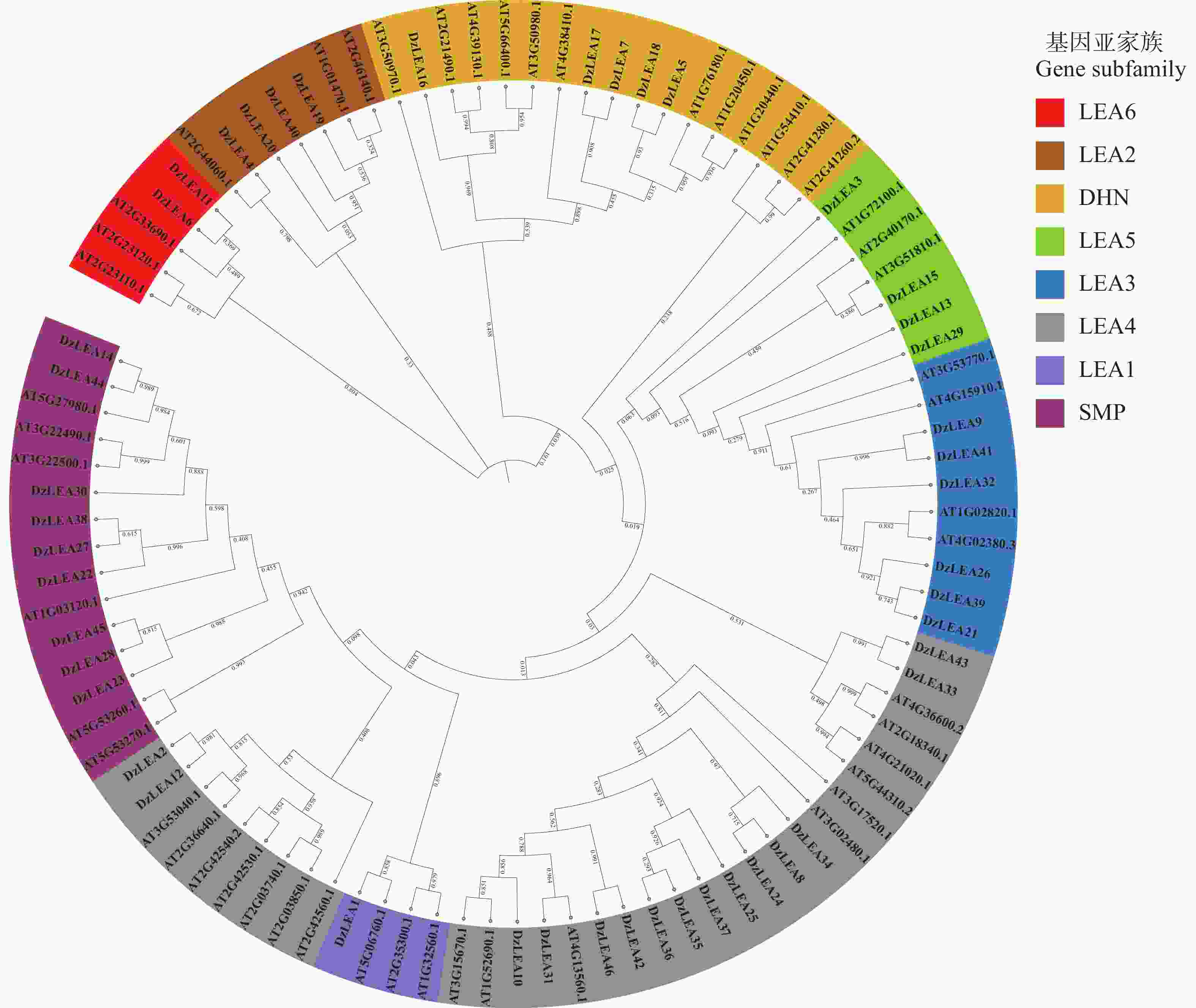 DzLEA蛋白的亚细胞定位预测表明:LEA1亚家族的1个成员(DzLEA1)、LEA5亚家族的3个成员(DzLEA13、DzLEA15、DzLEA29)和LEA6亚家族的2个成员(DzLEA6、DzLEA11)均位于细胞核内;LEA2亚家族的1个成员(DzLEA20)位于质膜内,其余3个成员(DzLEA4、DzLEA19、DzLEA40)位于细胞质内;LEA3亚家族的1个成员(DzLEA9)位于线粒体内,其余5个成员(DzLEA21、DzLEA26、DzLEA32、DzLEA39、DzLEA41)位于叶绿体内;LEA4亚家族的1个成员(DzLEA43)位于细胞外,5个成员(DzLEA10、DzLEA12、DzLEA35、DzLEA36、DzLEA37)位于线粒体内,其余均位于细胞核内;DHN亚家族的1个成员位于细胞质内,其余DHN成员位于细胞核内;SMP亚家族的成员在细胞核、细胞质、线粒体和叶绿体中均有存在。