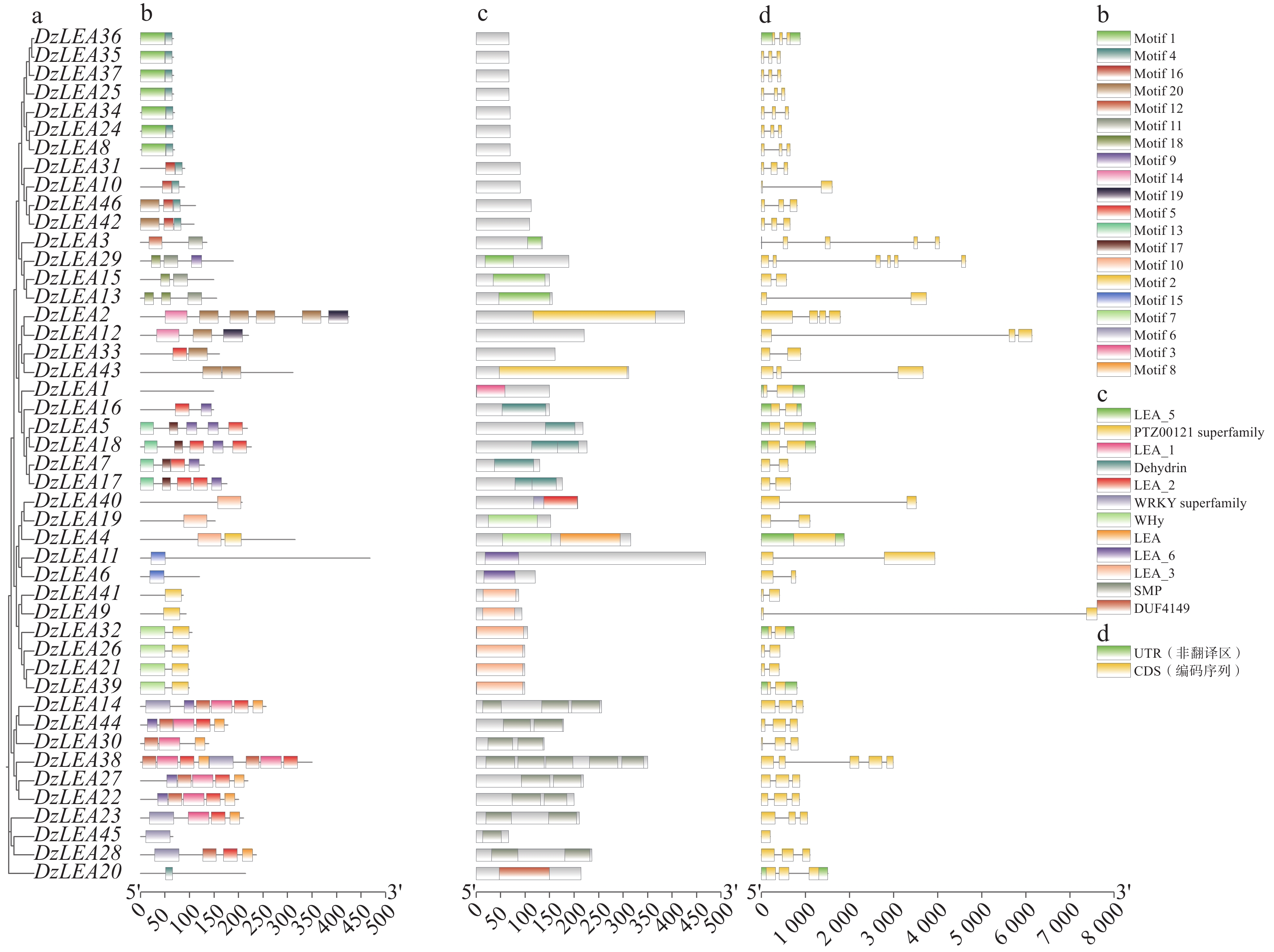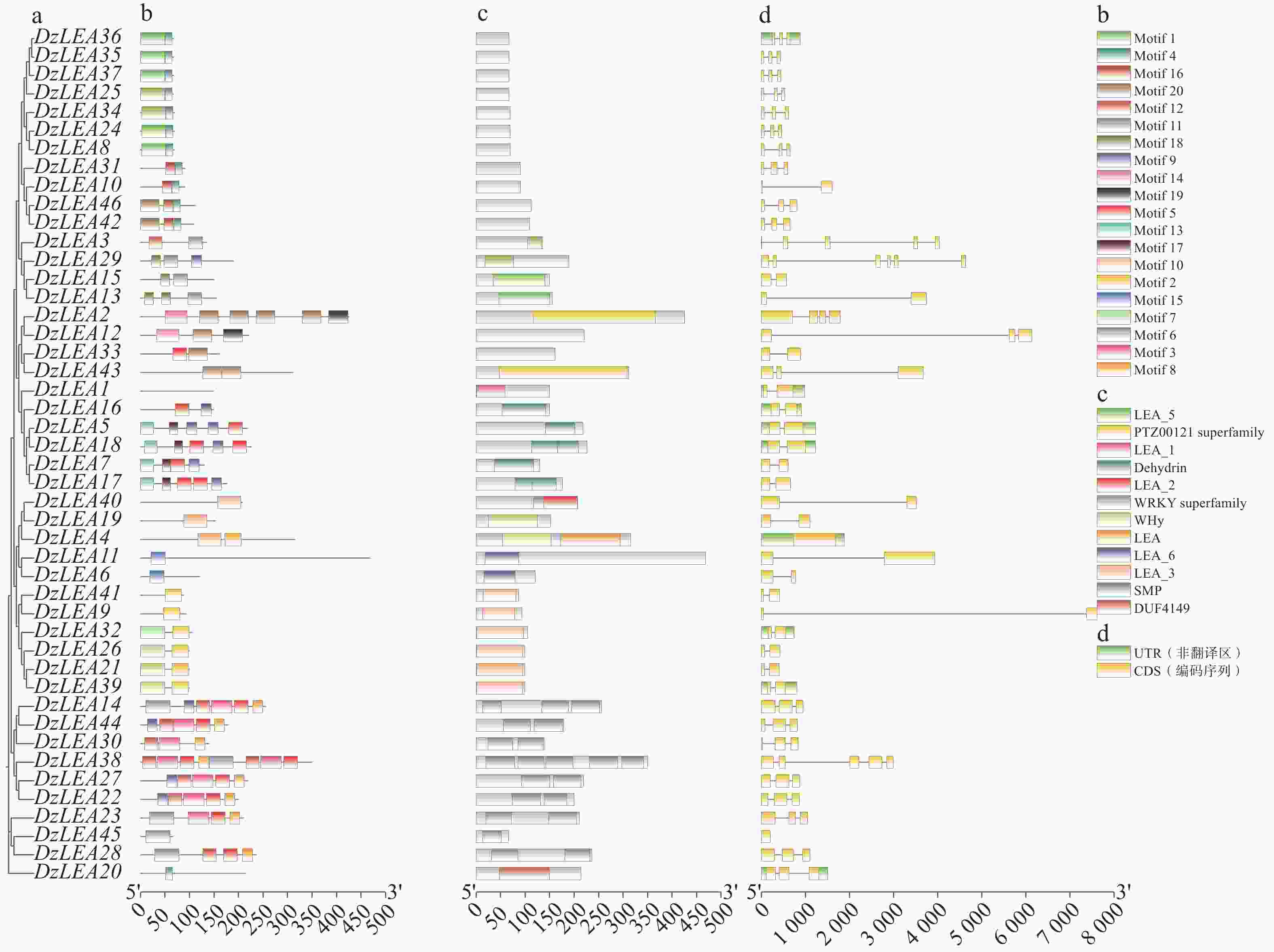 Figure 3.  The phylogenetic tree (a), conserved motifs (b), protein domains (c), and gene structures (d)of DzLEA genes.