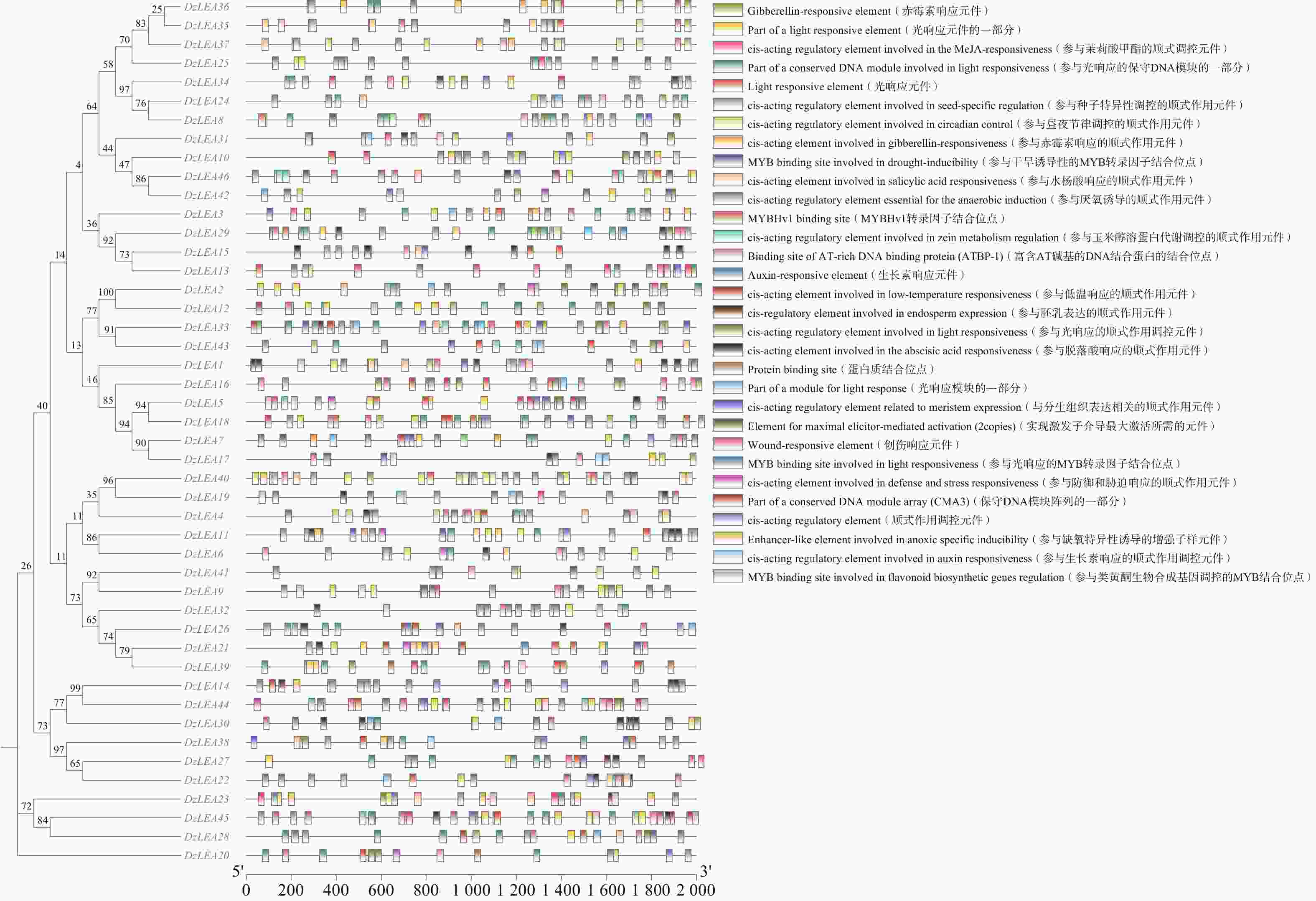 • 通过TBtools软件获取DzLEAs基因起始密码子上游2 000 bp的序列,在PlantCARE网站(https://bioinformatics.psb.ugent.be/webtools/plantcare/html/)对获取的序列进行分析,最后通过TBtools软件对分析结果进行可视化[13]