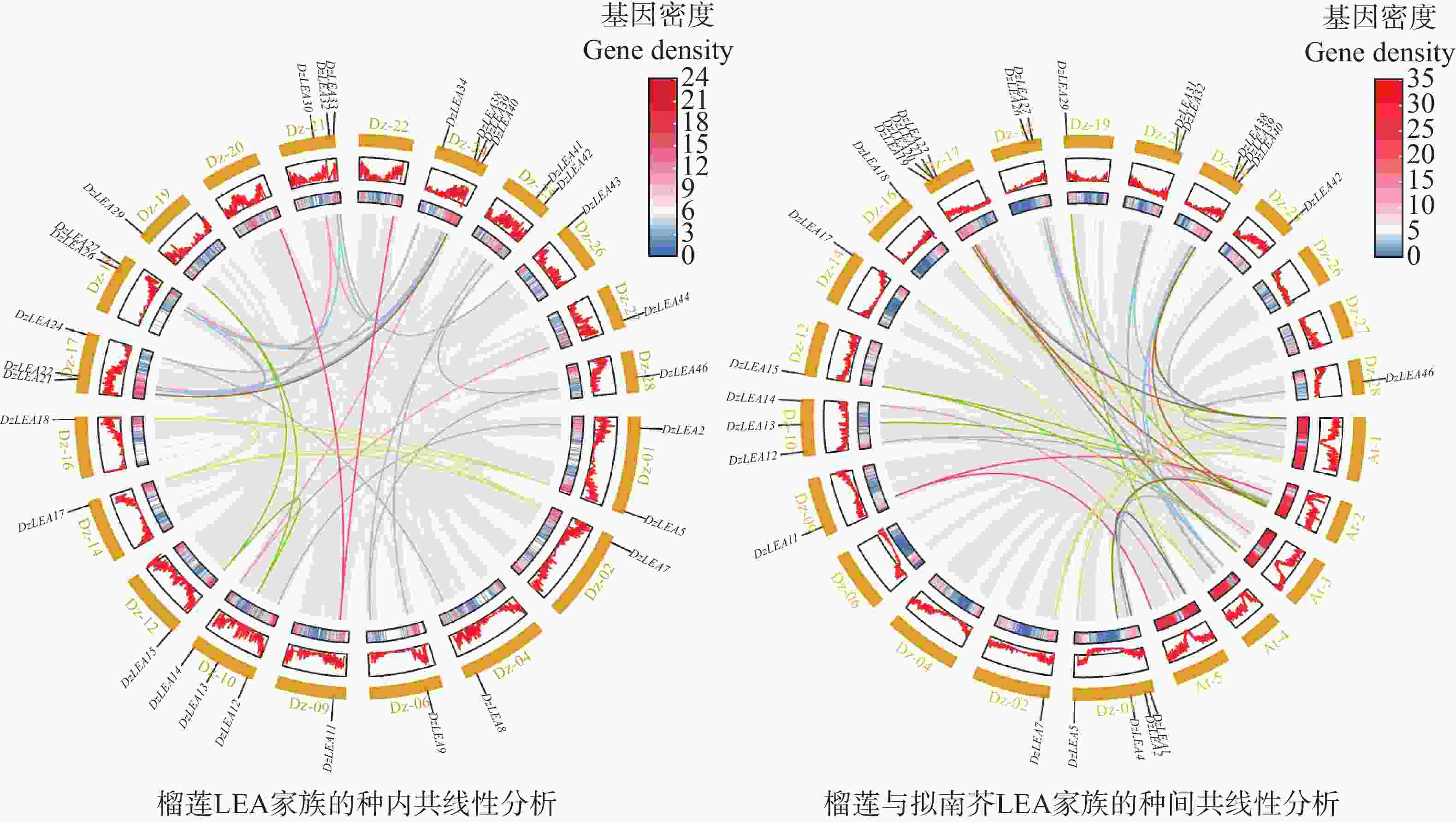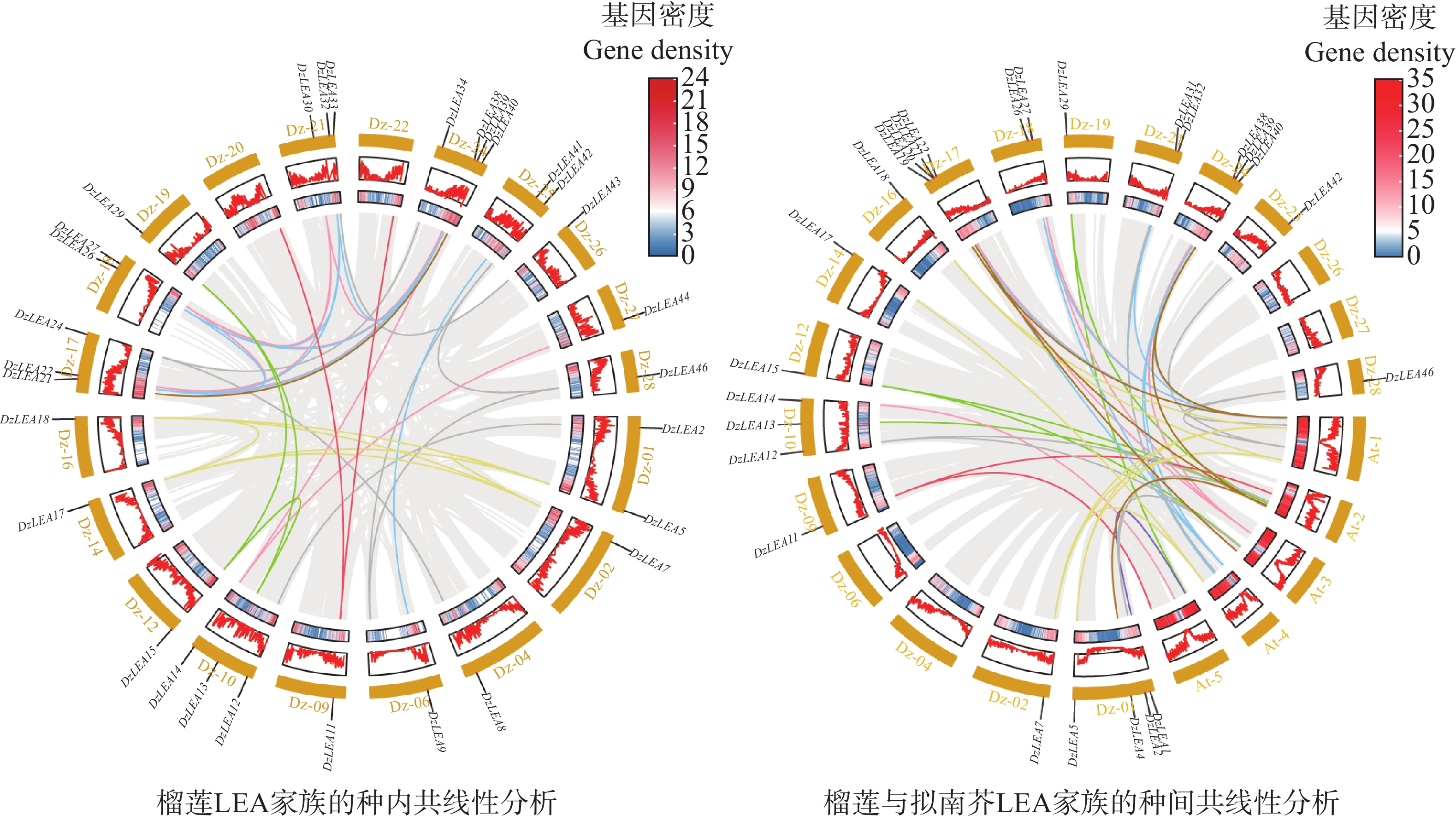 • 基于榴莲和拟南芥的基因组文件和注释文件[12],通过TBtools软件[13]获取其染色体长度、基因密度和位置信息,通过MCScanX对榴莲与拟南芥LEA基因家族进行物种内和物种间共线性分析,采用默认参数;最后通过Advanced Circos程序对共线性分析结果进行可视化。