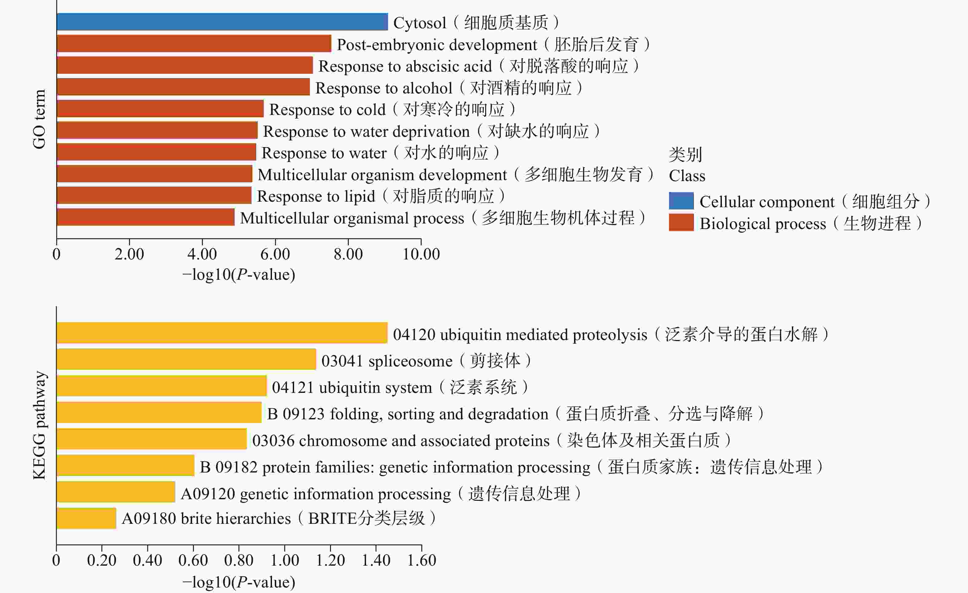 • 为了进一步研究LEA基因的具体功能,对榴莲DzLEAs基因进行基于超几何分布的GO和KEGG分析(图6)。GO富集分析结果显示,在生物进程类别中,6个LEA基因家族成员均在“对寒冷的反应”以及“对缺水的反应”显著富集,分别是DzLEA5DzLEA16DzLEA18DzLEA21DzLEA26DzLEA39