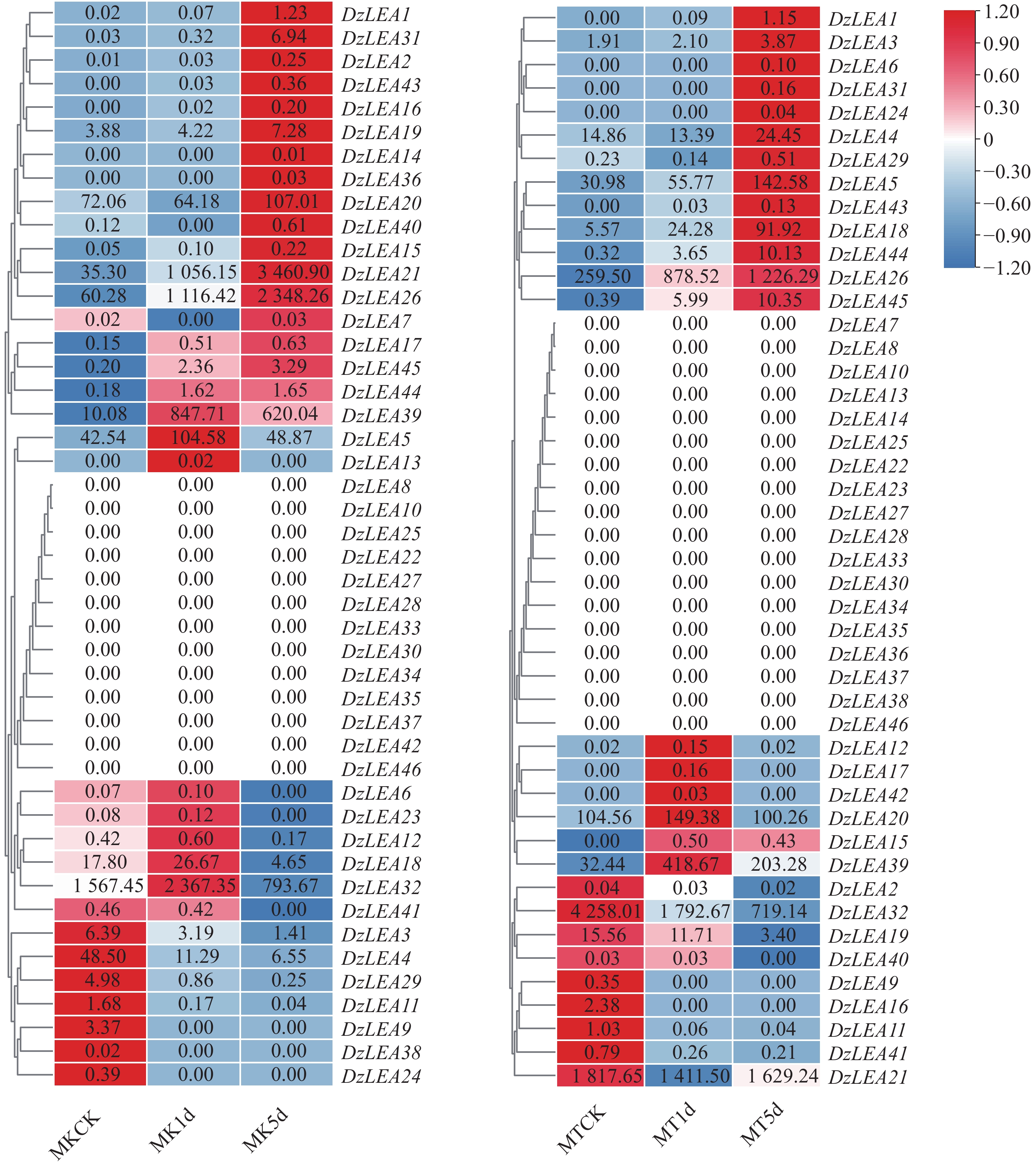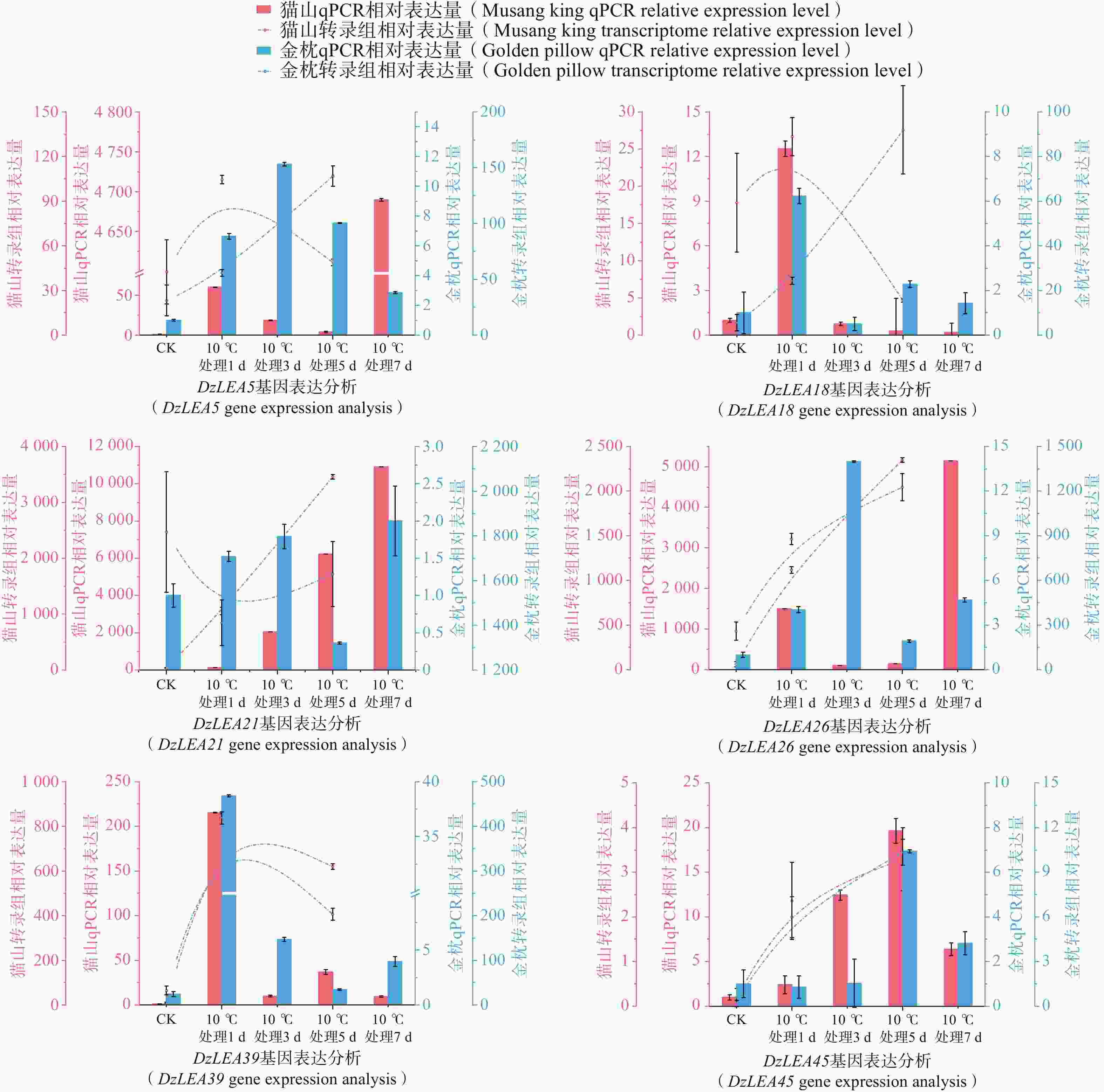 Figure 8.  Relative expression levels of DzLEA genes in the two durian cultivars under cold stress.