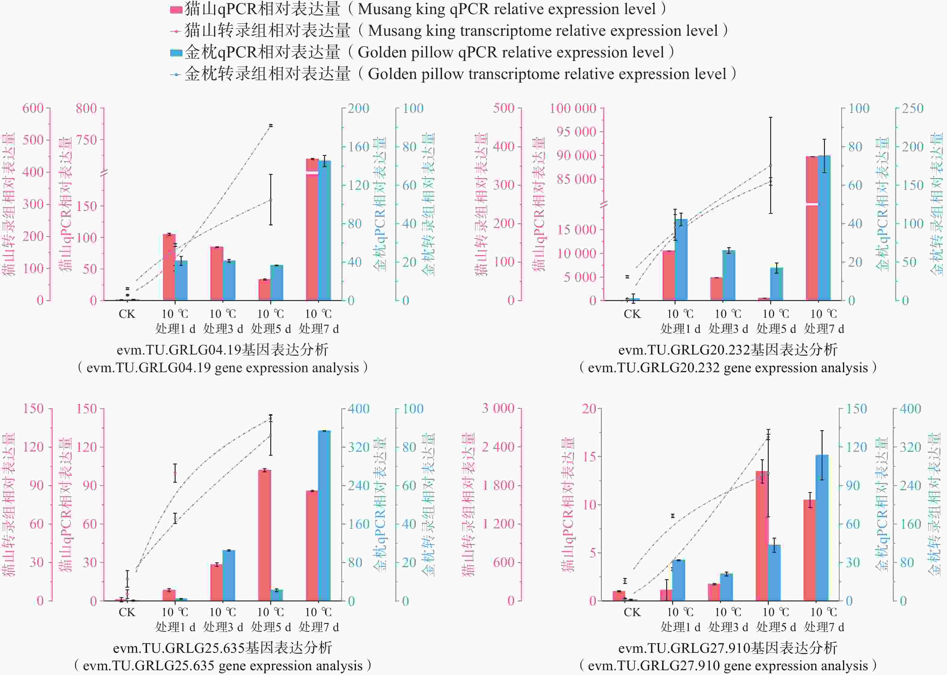 为了进一步分析DzLEAs基因在低温胁迫中的作用,基于低温处理下的榴莲叶片转录组数据,挑选出6个低温处理(10℃)下表达量升高的DzLEAs基因(图8)和4个非DzLEAs基因(图9),通过qRT-PCR测定榴莲叶片在四个低温处理时期下的表达量变化。结果显示,DzLEAs基因均在10℃低温处理下呈现不同程度上调表达,其中不同品种的DzLEA18DzLEA39均在10℃低温处理1d表达量最高,而后表达量逐渐降低;猫山王品种DzLEA5表达量随低温处理时间增加而逐步上升,并在10℃低温处理7d表达量最高,金枕品种DzLEA5表达量呈现先升高而后降低趋势,在10℃低温处理3 d表达量最高;不同品种的DzLEA21表达量均随低温处理时间增加而逐步上升,且在10℃低温处理7 d表达量最高;猫山王品种DzLEA26表达量随低温处理时间增加而逐步上升,并在10℃低温处理7 d表达量最高,金枕品种DzLEA5表达量呈现先升高而后降低趋势,在10℃低温处理3 d表达量最高;不同品种的DzLEA45表达量均呈现先升高而后降低趋势,且在10℃低温处理5 d表达量最高。非DzLEAs基因在10℃低温处理下表达模式有所不同,evm.model.GRLG04.19evm.model.GRLG20.232表达模式类似,在不同品种中均呈现先升高后降低而后再升高的趋势,且均在10℃低温处理7 d表达量最高;evm.model.GRLG25.635evm.model.GRLG27.910表达模式类似,猫山王品种中呈现先升高而后降低的趋势,在10℃低温处理5 d表达量最高,金枕品种中呈现逐步升高的趋势,在10℃低温处理7 d表达量最高。综上,这些基因的表达模式在不同品种之间相近,且与转录组表达结果基本一致,呈现较为明显的上调趋势,表明这些基因可能在榴莲响应低温胁迫过程中发挥了关键作用。