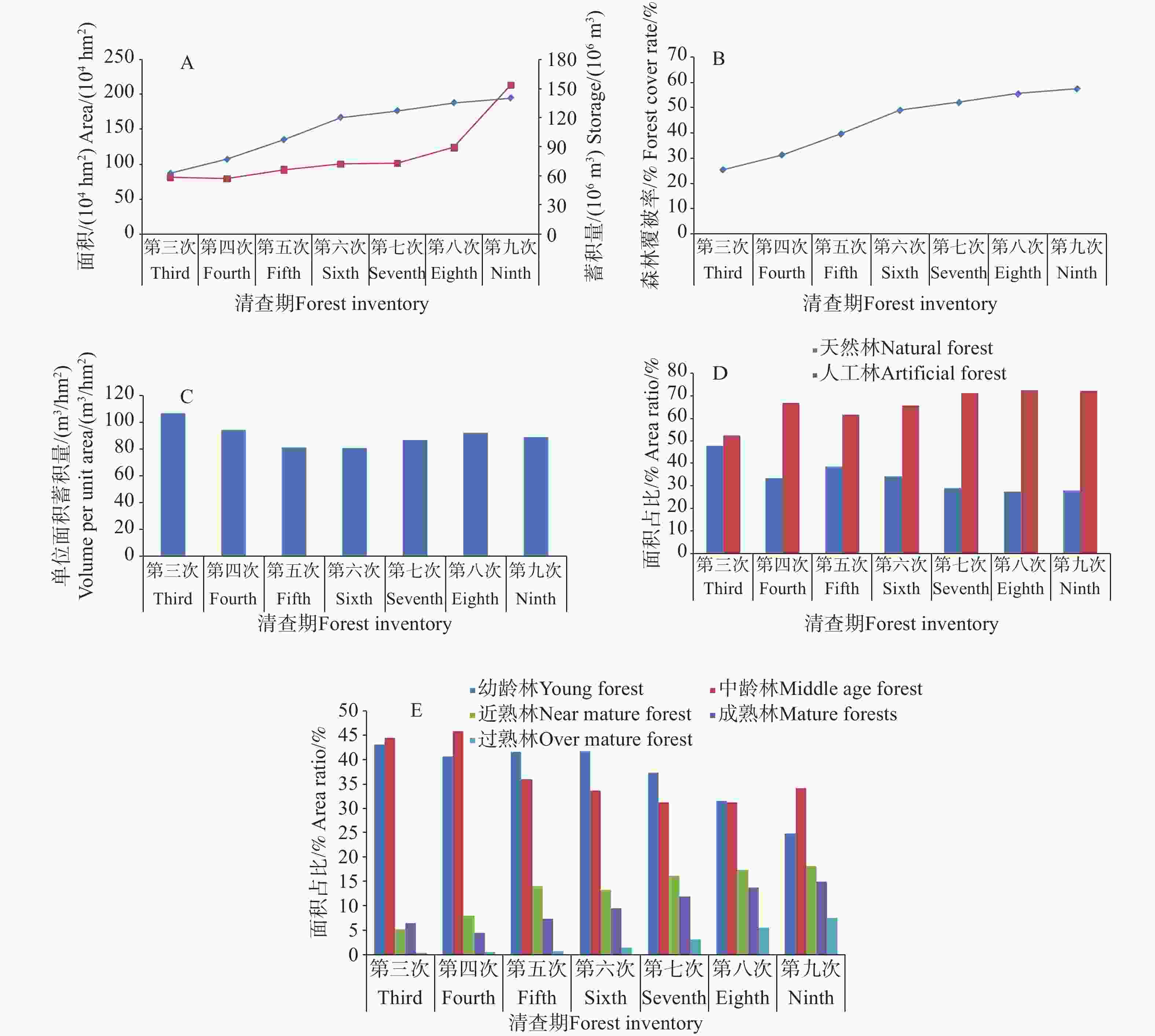 就林龄结构变化而言,中幼龄林面积呈现出持续降低的趋势,近熟林、成熟林和过熟林面积则恰恰相反,三者总面积占比逐渐增加,从第3次清查期的12.33%,增加了到第9次清查期的40.85%(图3-E)。说明在林业政策的实施下,毁林现象逐渐得到遏制,森林资源得到了有效的保护,林龄结构逐渐合理。