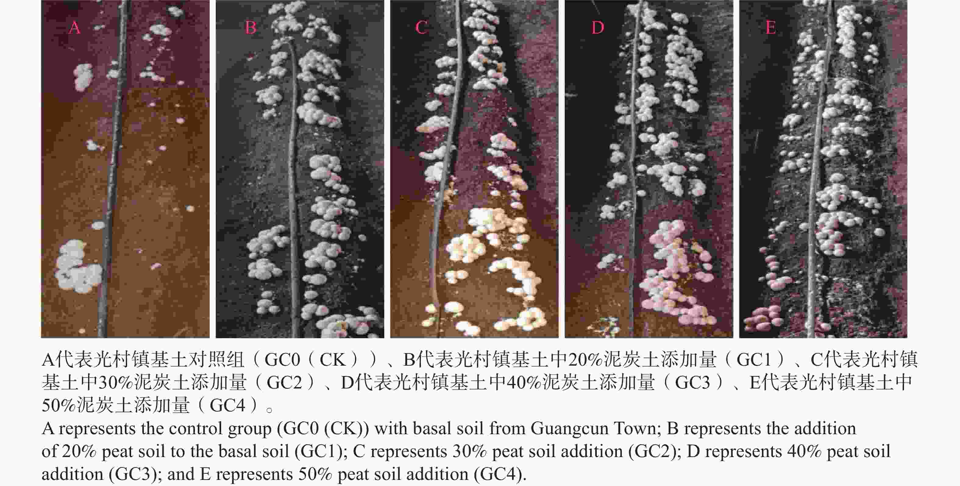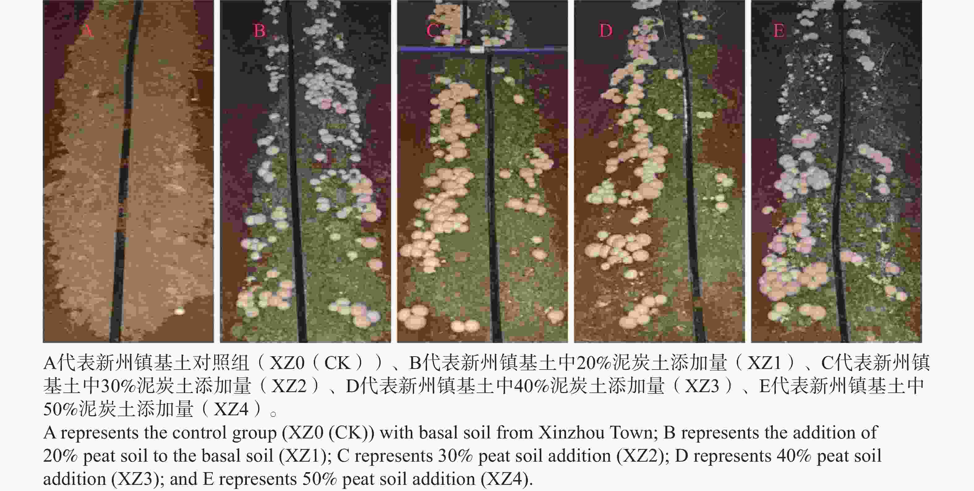 处理组 Treatment 基土 Base soil 泥炭土 Peat GC0(CK) 100% 0 GC1 80% 20% GC2 70% 30% GC3 60% 40% GC4 50% 50% DC0(CK) 100% 0 DC1 80% 20% DC2 70% 30% DC3 60% 40% DC4 50% 50% XZ0(CK) 100% 0 XZ1 80% 20% XZ2 70% 30% XZ3 60% 40% XZ4 50% 50% Table 2. Experimental Design of Different Casing Soil Formulations