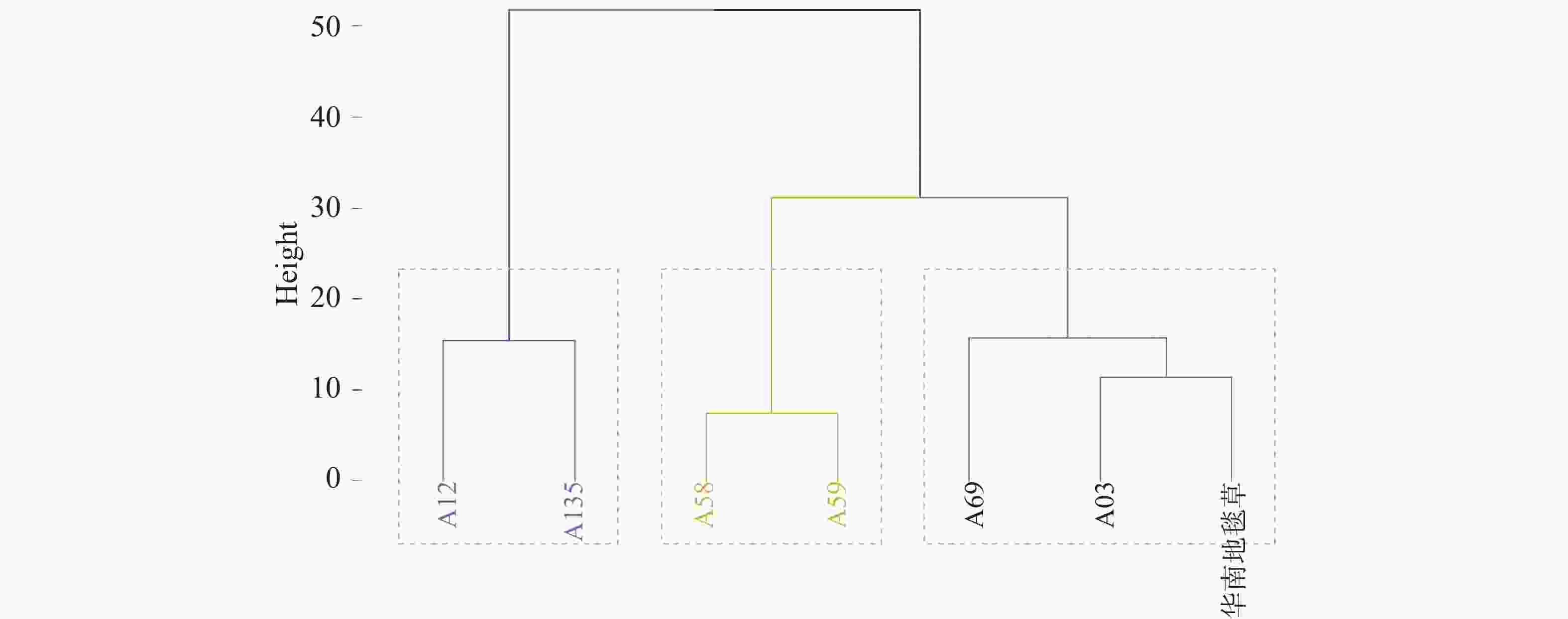 利用欧式距离对18个指标的耐荫系数进行耐荫性聚类分析(图3),可以综合评估不同地毯草种质对遮荫胁迫的耐受能力。当欧式距离约为20时,可以将7份地毯草分为三类。其中A69为最耐荫种质,与A03和对照品种同为耐荫型。其D值排名分别为1、2和3;A58、A59属于中度耐荫型,表现不及对照品种,其D值排名分别为第4和5名;A135和A12为敏感型,其耐荫性最差,D值排名为6和7。以上结果与耐荫种质排名(表4)基本一致,说明本研究筛选的耐荫种质结果可靠。