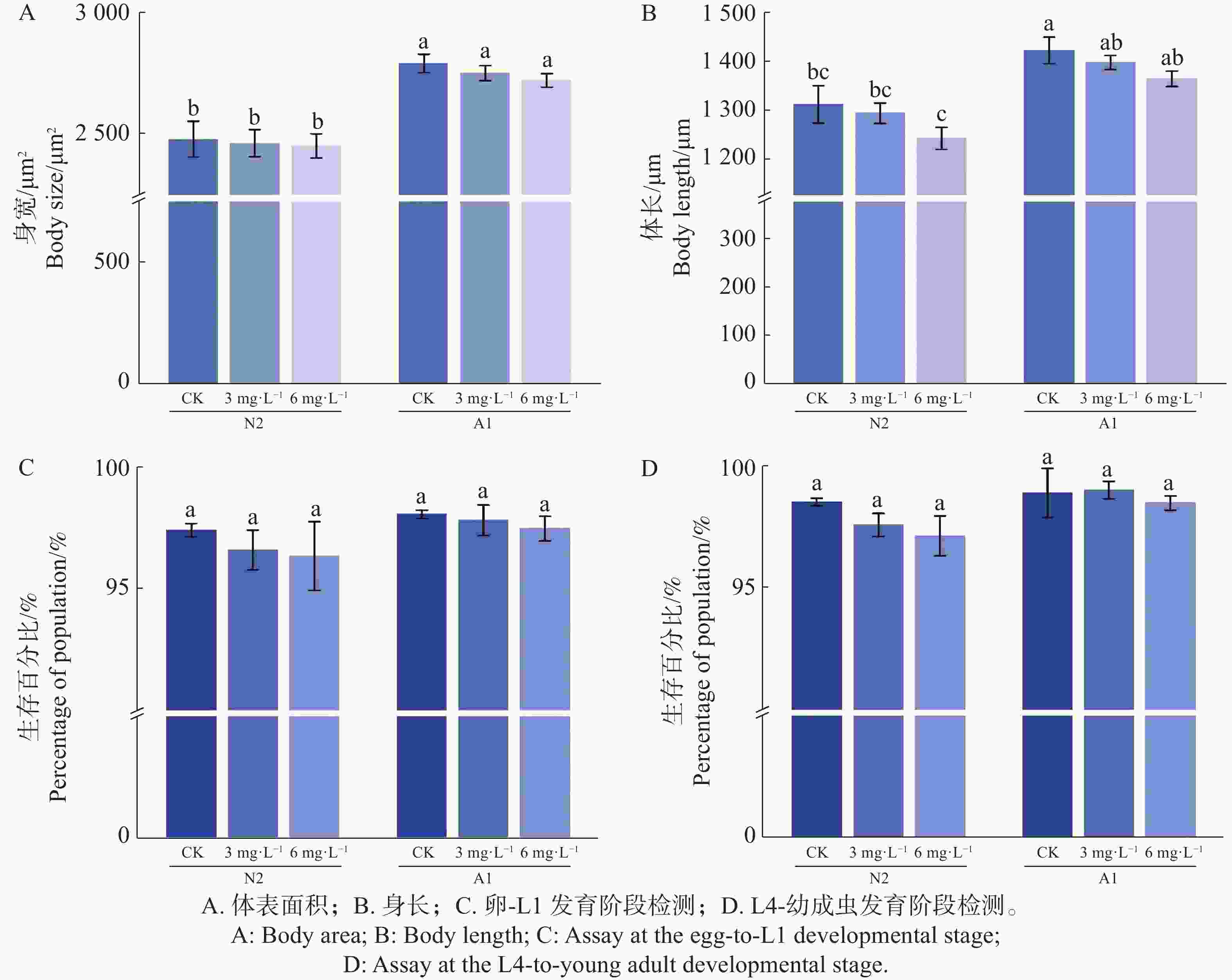 • 同步化方法如1.2.3,同步培养至L4时期,施药暴露方法如1.2.4。将暴露后的线虫用M9缓冲液清洗3遍后吸出放至NGM空白板中,用1 mmol·L−1的左旋咪唑固定线虫,置于2 %(m/m)的琼脂垫上,在正置显微镜下进行拍照,使用Image J 2022软件测量每条线虫的面积和长度。实验重复3次,每个处理随机挑选30条线虫。