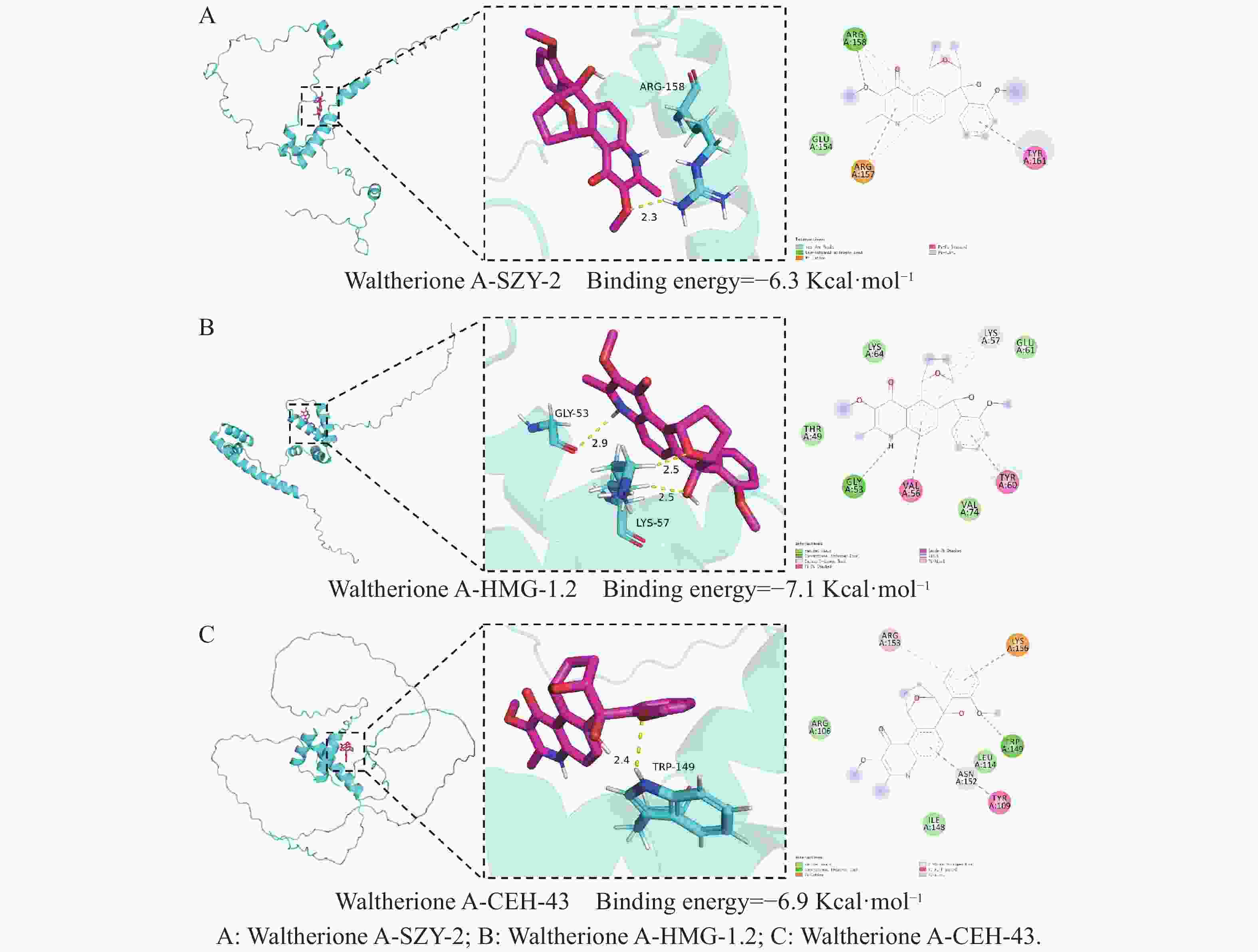 • SZY-2(由Y32H12A.4表达)与Waltherione A的结合能为−6.3 kcal·mol−1图6-A);HMG-1.2(由F47D12.4表达)与Waltherione A的结合能为−7.1 kcal·mol−1图6- B);CEH-43(由C28A5.4表达)与Waltherione A的结合能为−6.9 kcal·mol−1图6- C)。由此得出Waltherione A能与Y32H12A.4szy-2)、F47D12.4hmg-1.2)和C28A5.4ceh-43)所表征的蛋白在理论上均存在自发且稳定的结合潜力。