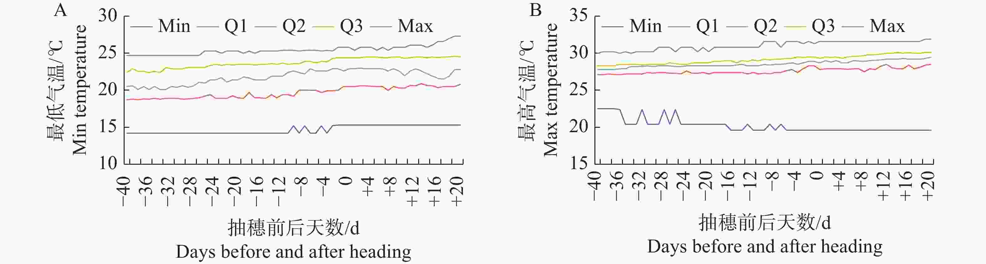 Figure 1. Distribution of the minimum (A)and maximum temperatures (B)of 254 rice varieties from 40th day before heading to 20th day after heading