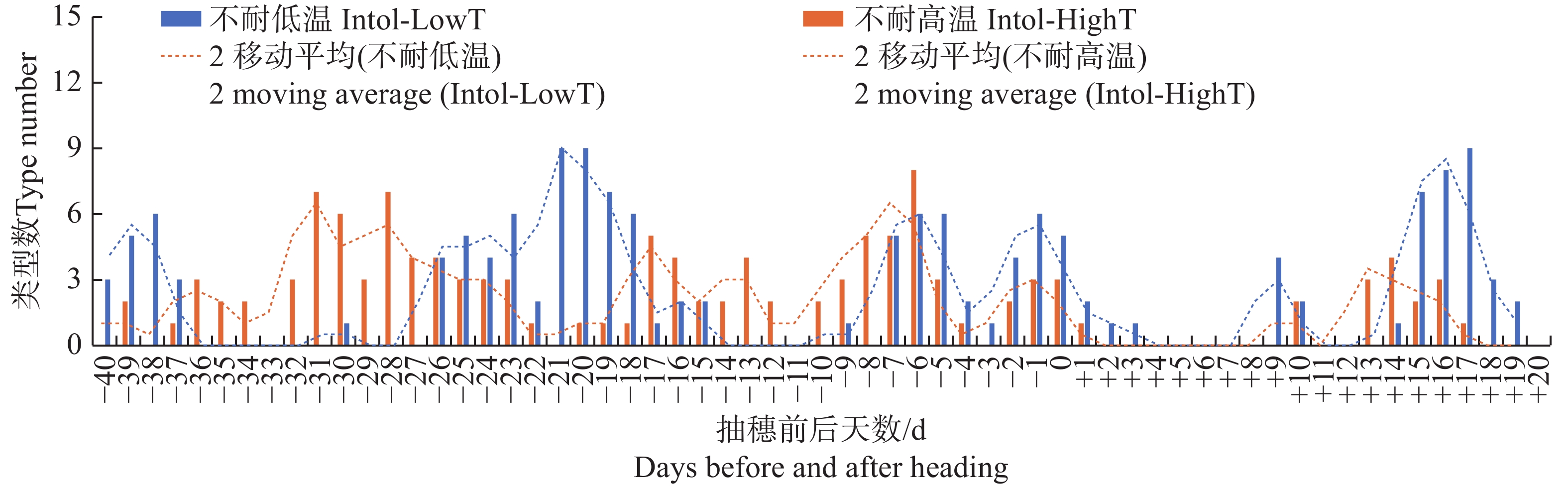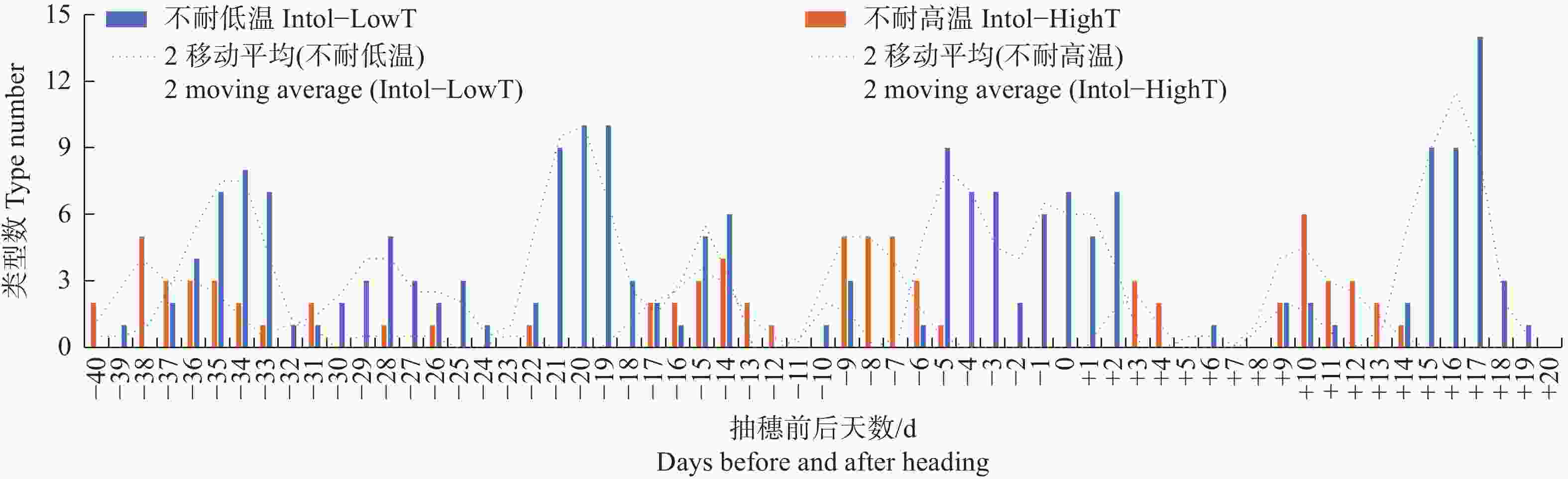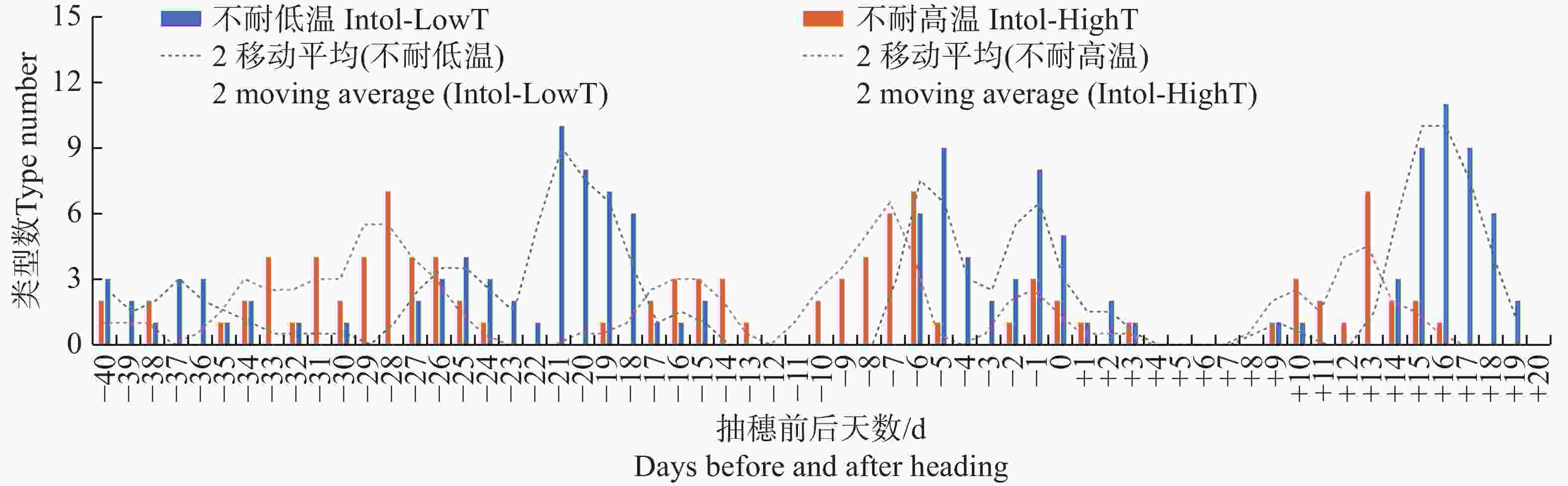 Figure 2. Distribution of the number of different types of varieties that are intolerant to low temperature or high temperature, based on the minimum temperature recorded on each date before and after heading