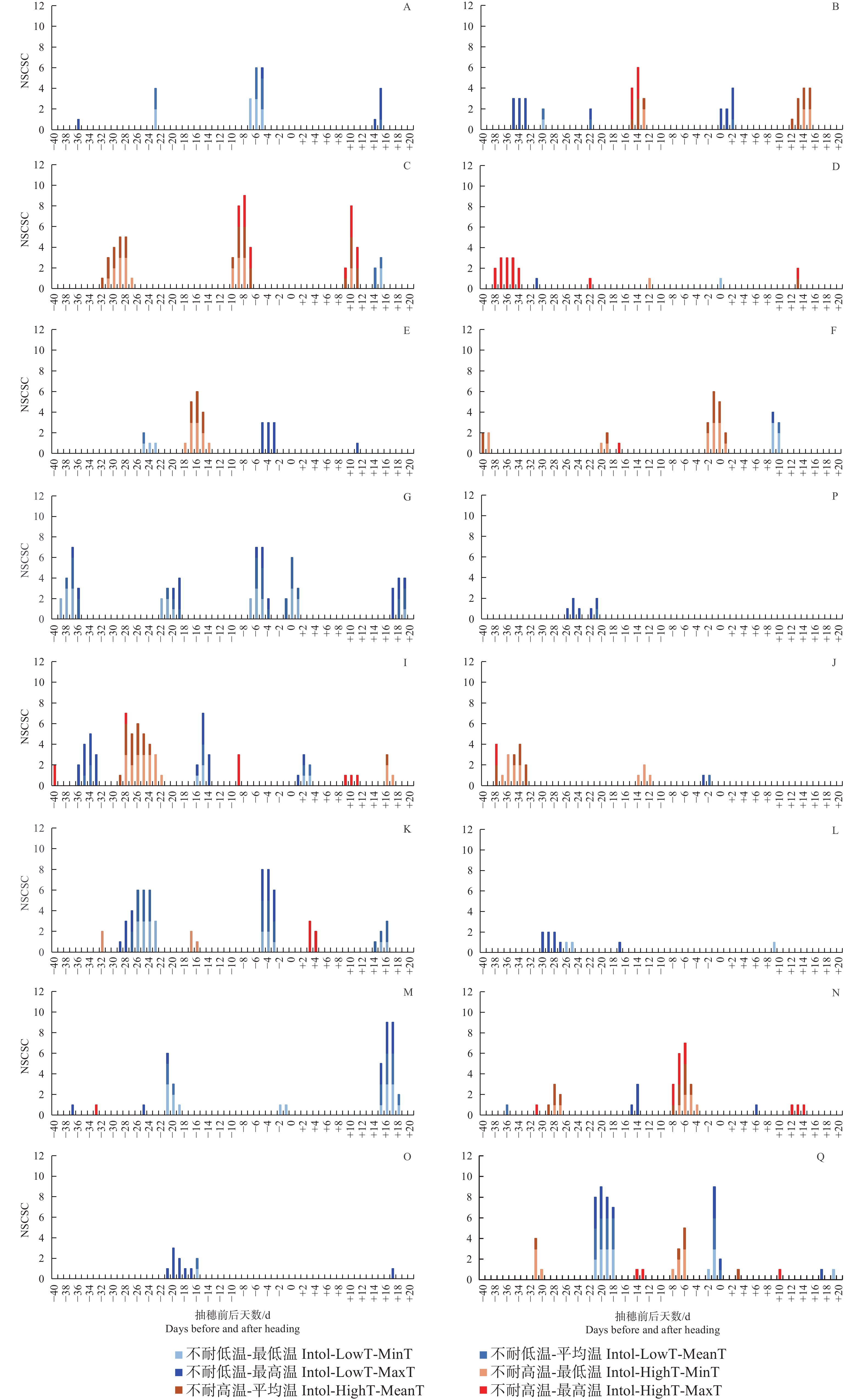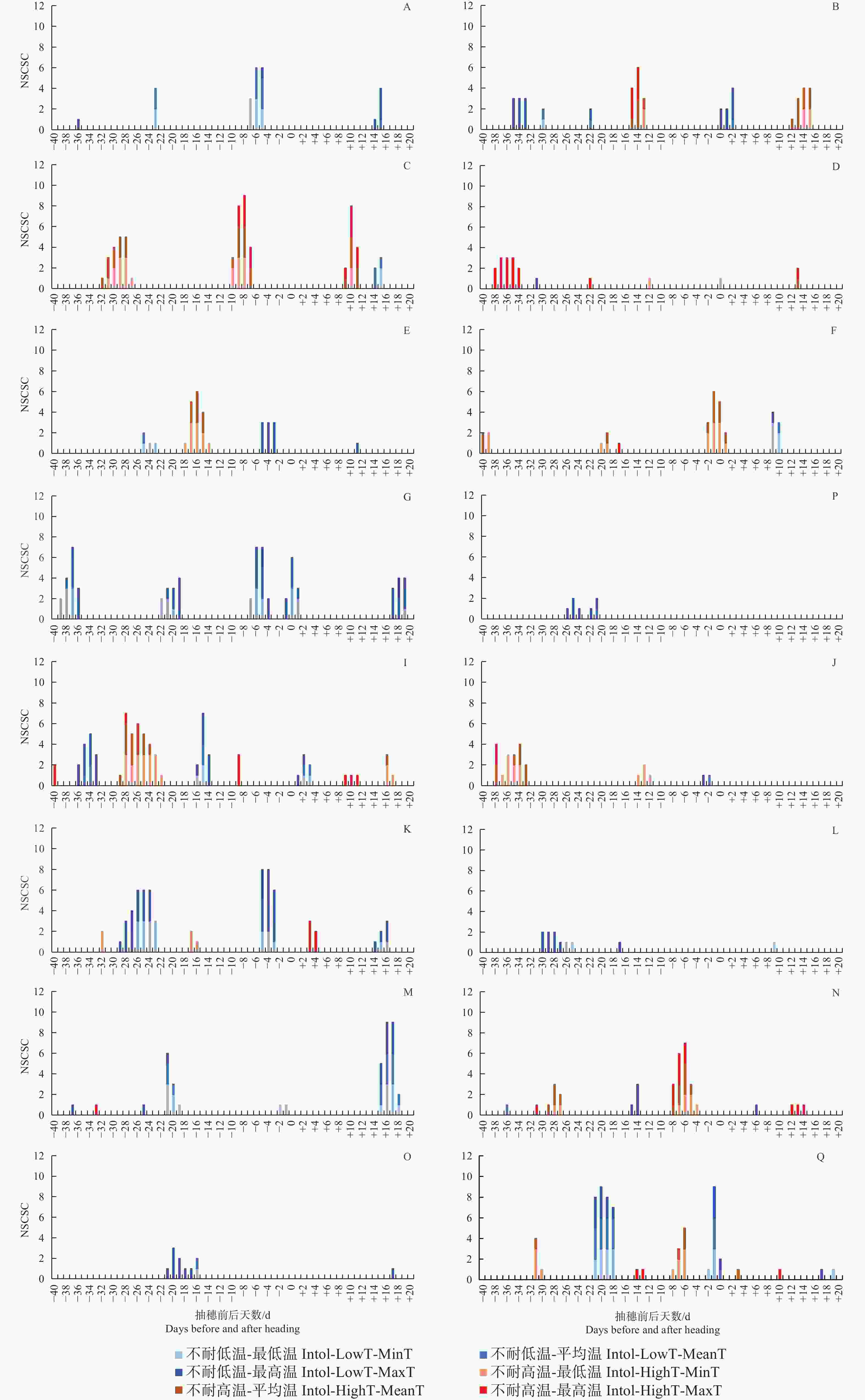 就高温胁迫而言,不管按最低气温、最高气温还是平均气温统计,在抽穗前9~5 d如遇高温,XI-LAN-PIMP-M和GJ-Te-RIMP-M等品种类型的结实率会显著降低。同时受到较高的最低气温、最高气温及平均气温影响的品种类型及发育阶段还包括抽穗前15~13 d的XI-LAN-M,抽随后9~11 d的XI-LAN-PIMPM,抽穗前8~4 d的GJ-Te-RIMP-M。另外,有些发育阶段和品种类型表现出对最低气温、最高气温及平均气温的不同响应。其中,XI-LAN-M在抽随后12~15 d,XI-LAN-PIMP-M在抽穗前32~27 d,XI-LAN-PIMP-T在抽穗前18~14 d,XI-RIMP-M在抽穗前后2 d,XI-IMP1在抽穗前28~22 d,XI-CC1在抽穗前37~33 d,GJ-Tr抽穗前8~6 d,在遇到较高的最低气温和平均气温时,结实率会显著降低;而XI-RIMP-T在抽穗前38~34 d,GJ-Te-RIMP-M在抽随后12~14 d主要受较高的最高温度胁迫。