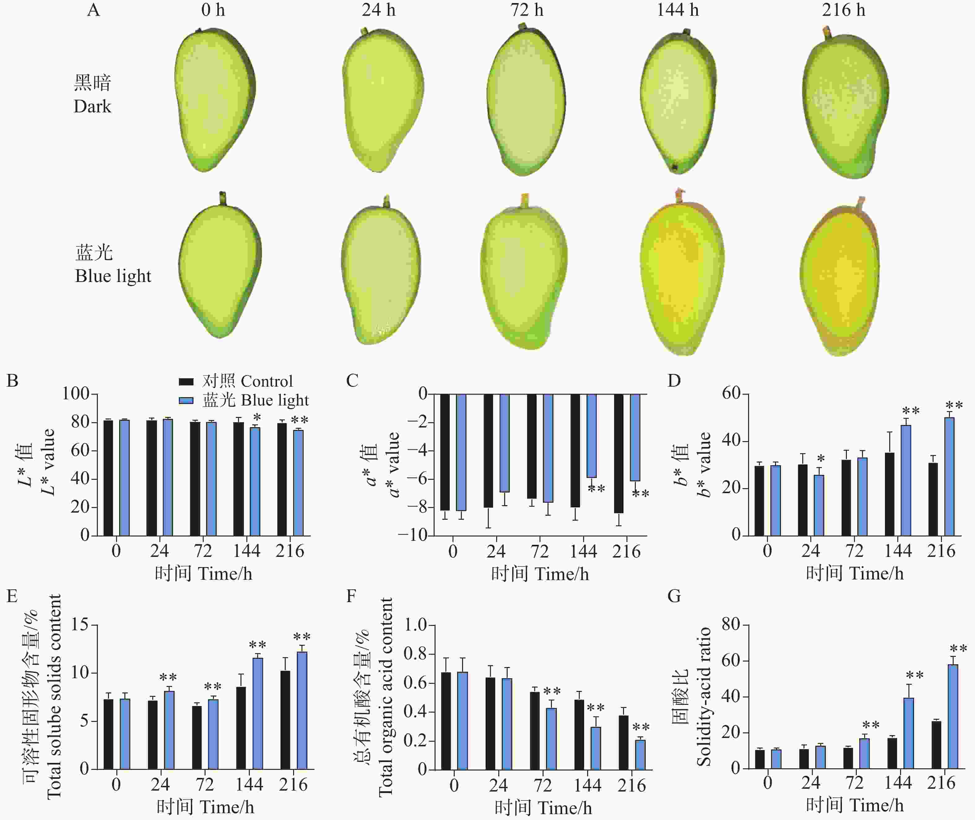• 相比较于对照组,处理组下的芒果果肉在处理进行到144 h时果肉出现明显转黄,而对照组则无明显变化(图2-A)。对果肉的颜色指数测定结果也表明,在第144 h和216 h时,处理组下的果肉表现出更高的b*值,说明果肉更为偏黄色。对L*和a*值的测定结果表明,在144 h和216 h时,处理组显著降低了L*值和增加了a*值(图2-B—D)。同时发现,处理组下的芒果果肉在24~216 h整个处理期间均表现出更高的可溶性固形物含量(图2-E);而在72~216 h期间表现出更低的总有机酸含量(图2-F);在整体上,处理组下的芒果果肉在72~216 h表现出更高且不断增加的固-酸比(图2-G)。说明蓝光处理能够促进芒果果实的成熟。