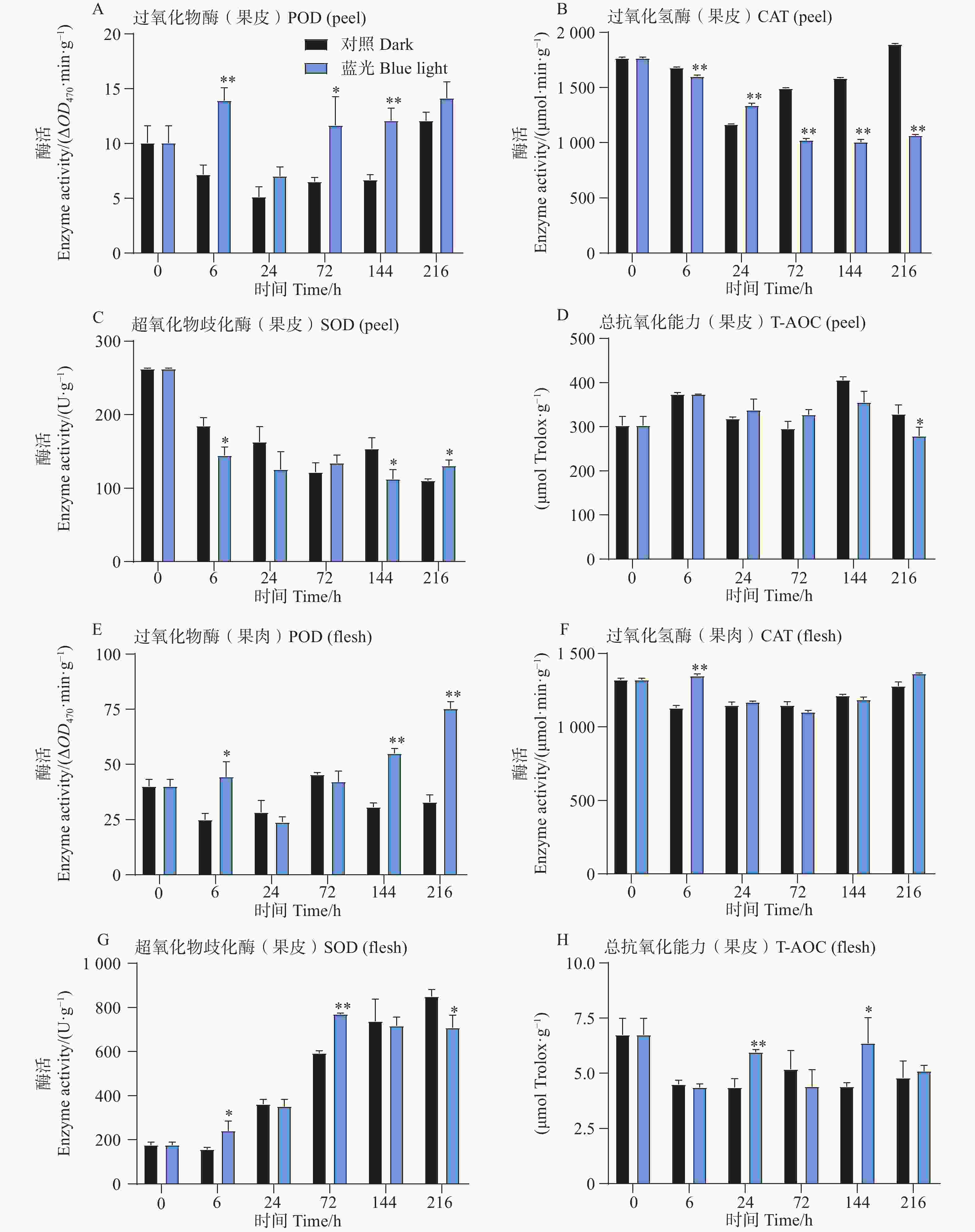 • 相比较于对照组,试验发现在6、72和144h时处理组芒果果皮中含有的POD活性更高,而在果肉中,POD活性整体呈上升趋势,且在6、144和216h时POD活性要比对照组高(图3-A,E)。此外发现,芒果果皮CAT活性在蓝光处理过程中呈现下降趋势,而对照组中的CAT活性则呈现先下降后上升的趋势,除了24 h,其余时间点处理组果皮中的CAT活性均低于对照组果皮(图3-B)。而T-AOC在果皮中无显著差异趋势, 而在24和144 h处理组果肉中,T-AOC较高(图3-D,H)。此外对于SOD活性,发现在处理组和对照组果皮中其整体呈现下降趋势,而在果肉中则相反,且处理组果肉中的SOD活性在前期高于对照组,在后期则开始出现低于对照组的现象(图3-C,G)。