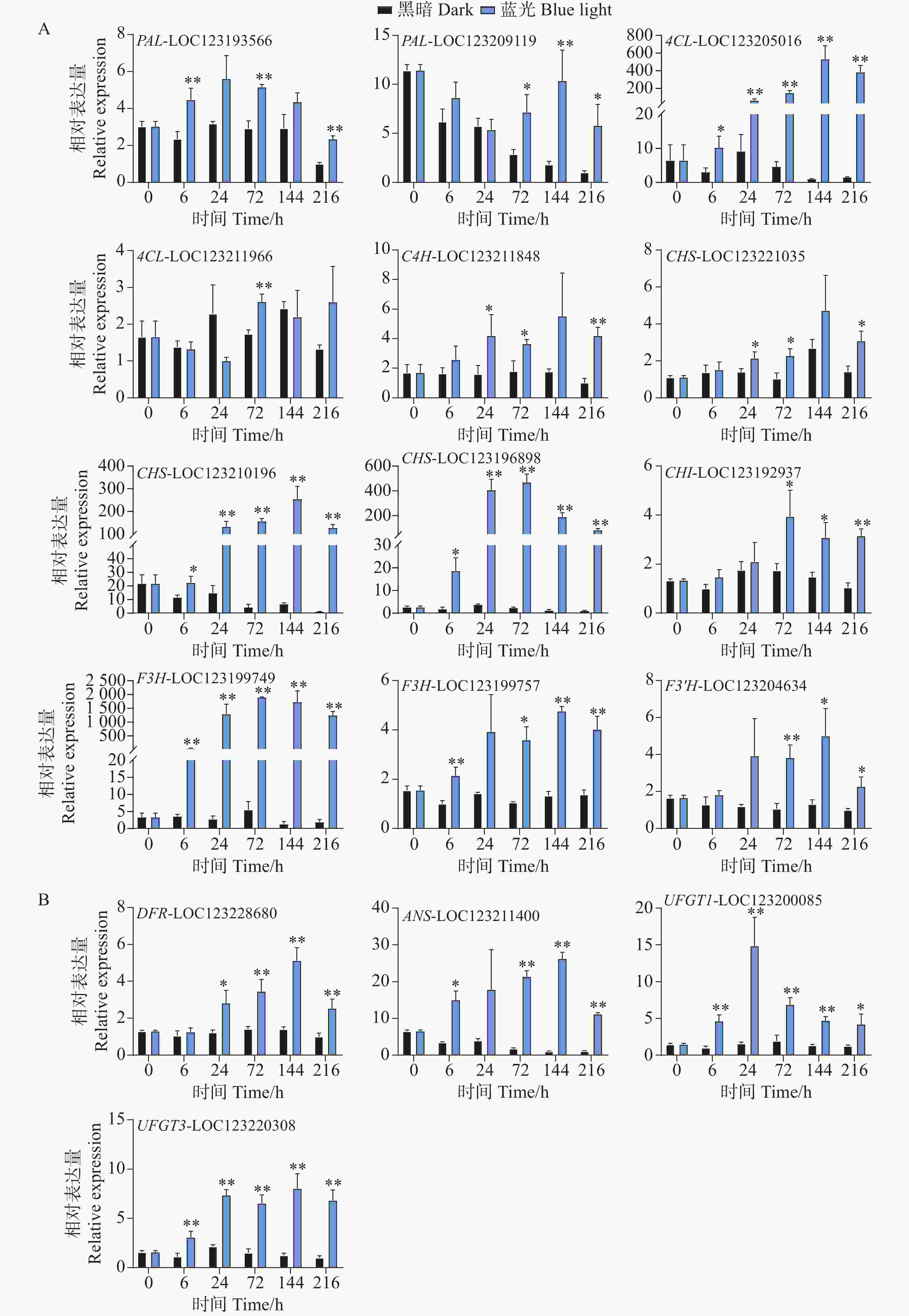 • 基因表达水平分析反映了花青苷生物合成通路结构基因对蓝光和黑暗处理的差异响应。对于早期合成基因,在蓝光处理后,所有基因均变现出不同程度的光响应表达模式。其中,PAL-LOC123193566基因在第6、72以及216 h处理组中表现出更高的表达水平,而PAL-LOC123209119基因在处理后期的72到216 h表达水平更高(图4-A)。4CL-LOC123205016基因在处理组的整个时期均表现出光响应模式,其基因表达水平在144 h时达到顶峰,是对照组的528倍(图4-A)。C4H-LOC123211848和CHS-LOC123221035基因的表达水平均在24、72和216 h显著高于对照组(图4-A)。而CHS-LOC123210196、CHS-LOC123196898和F3H-LOC123199749基因在整个处理时期均表现出强烈的受光诱导现象(图4-A)。其中CHI-LOC123192937和F3'H-LOC123204634基因均在后期表现出较高的表达水平模式(图4-A)。F3H-LOC123199757基因在6h开始被蓝光诱导表达,并在72、144和216h显著高于对照组的表达水平(图4-A)。