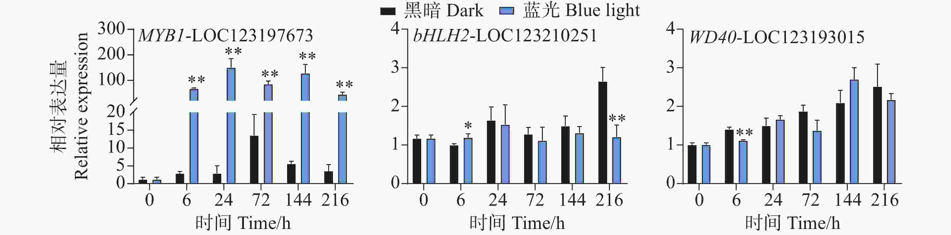 • 在花青苷生物合成过程中结构基因会受到转录因子的调控,其中MYB、bHLH和WD40转录因子在这个过程中发挥着主要作用。qPCR试验结果分析发现,在采后蓝光诱导下,芒果果皮中MYB和bHLH以及WD40转录因子的基因表达模式存在着很大不同。相比于对照组,其中MYB1-LOC123197673基因在处理组中的所有时期均表现出强烈的光响应模式现象,基因表达水平被显著诱导(图5)。其基因表达水平在24 h时达到顶峰,是对照组的52倍(图5)。而在对bHLH2-LOC123210251和WD40-LOC123193015的基因表达模式分析中发现,它们并未表现出由蓝光引起的差异表达趋势(图5)。相比于对照组,其中bHLH2-LOC123210251基因在6 h时轻微受到蓝光诱导表达,在216h时其表达水平又显著低于对照组,而在其它时期,并未表现出显著性差异(图5)。WD40-LOC123193015基因在6 h时处理组中的表达水平低于对照组,而在其它时期其基因表达并未表现出显著差异(图5)。