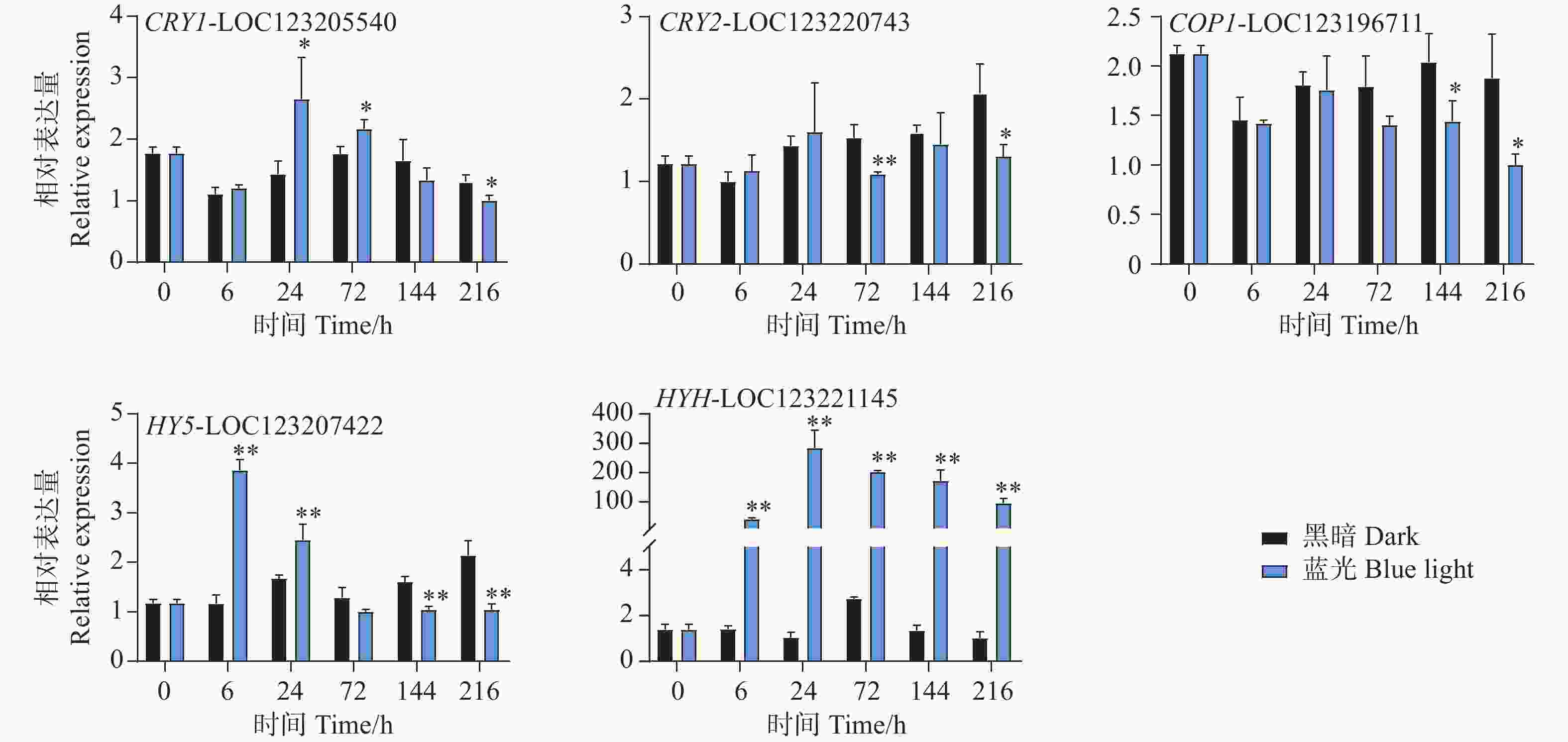• 本研究通过蓝光对芒果进行采后处理,且花青苷的合成积累主要受到光信号的诱导。因此,对光信号通路一些重要基因进行了基因表达分析。qPCR试验结果显示,光信号受体隐花色素的编码基因CRY1-LOC123205540和CRY2-LOC123220743的表达模式存在差异。其中CRY1-LOC123205540在试验进行后的6 h和72 h在处理组中被显著诱导表达,且在6 h时基因表达水平达到顶峰,随后逐渐下降,并在216 h时显著低于对照组(图6)。而CRY2-LOC123220743在所有时期并未出现受到蓝光诱导表达的现象,且在72 h和216 h时其基因表达水平处理组显著低于对照组。COP1-LOC123196711基因在处理前期的处理组和对照组中的表达水平并未存在差异,而在处理后期的144 h和216 h时,其基因表达开始出现受蓝光抑制的现象,显著低于对照组(图6)。光形态关键调控因子HY5-LOC123207422和HYH-LOC123221145的基因表达模式在本试验中存在差异。其中HY5基因在6 h时就显著受到蓝光的诱导表达,并持续至24 h,随试验进行其表达水平开始出现下调,并于144 h和216 h时显著低于对照组(图6)。而HYH基因在整个试验时期,其基因表达均受到蓝光的剧烈诱导,显著高于黑暗条件下的基因表达水平,在24 h时其基因表达达到顶峰,是对照组的284倍(图6)。