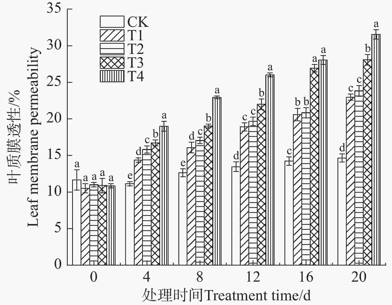 从图2可知,矮蕉幼苗的叶质膜透性呈上升趋势。盐胁迫第4天时,各处理组与CK组之间均出现差异,表明低浓度盐胁迫已对矮蕉叶质膜系统产生影响。随着盐胁迫时间的延长,矮蕉叶质膜透性持续上升,说明盐胁迫会导致其叶质膜系统逐渐功能丧失;盐胁迫浓度越高,叶质膜透性上升幅度越大。在较高浓度盐胁迫(T3、T4)下,处理第16天时叶质膜透性急剧上升,表明此时膜系统已发生较为严重的损伤。至第20天,T1~T4组的叶质膜透性分别增长56.79%、62.66%、91.60%和115.36%,膜系统损伤进一步加重。