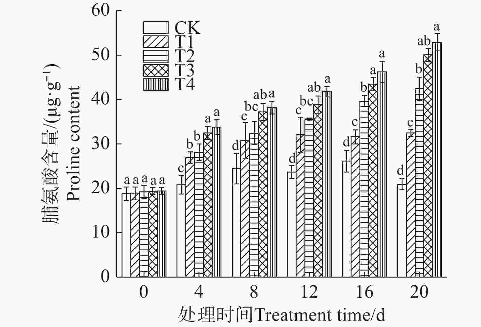 由图5可知,随着盐胁迫浓度增大,矮蕉幼苗叶片的MDA含量呈上升趋势。各盐胁迫处理在第20天时,叶片MDA含量达到最大值,相比对照组分别增加了211.07%、354.10%、400.18%和454.16%。其中,T4组的MDA含量最高,为30.18 nmol·g−1,较同期T1、T2、T3组分别高出78.14%、22.04%和10.79%。