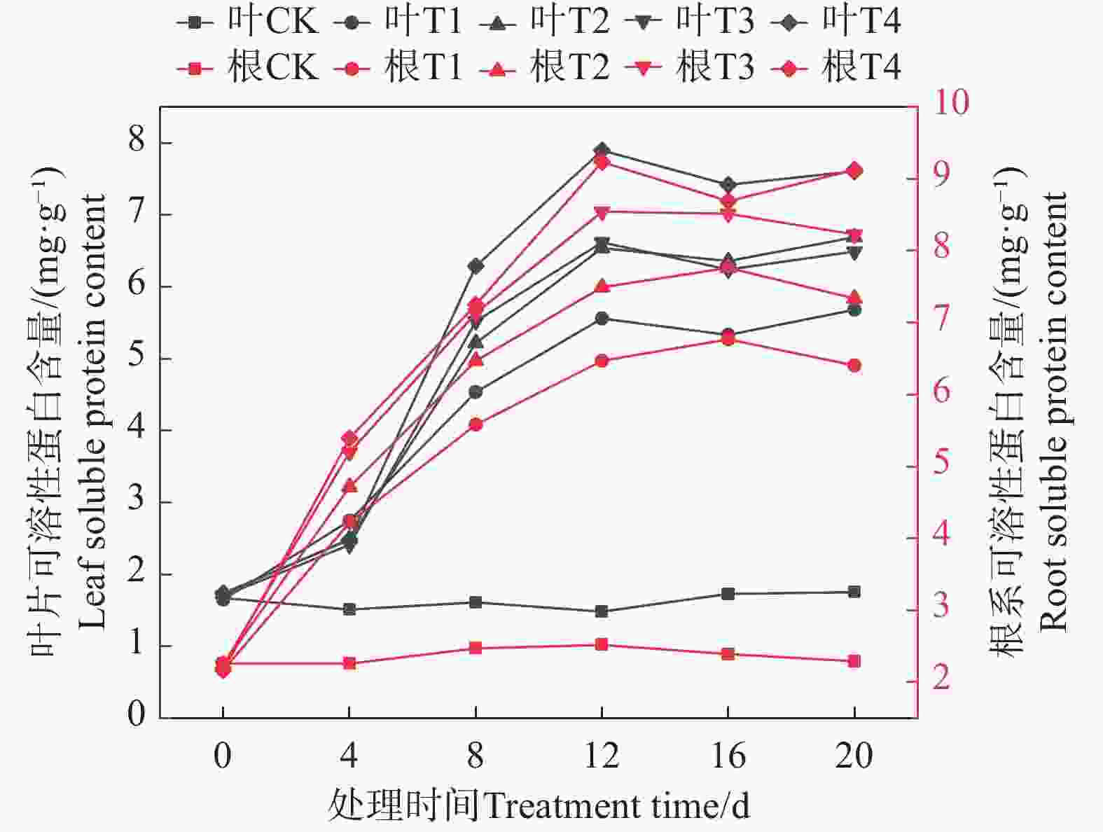 矮蕉幼苗根系的可溶性蛋白含量变化趋势与叶片相似,也呈先上升后下降的趋势。在0~12天期间,根系可溶性蛋白含量不断上升,第12天时T1~T4处理组分别增长了186.43%、231.56%、278.17%和308.70%,达到最大值,之后略有下降,但仍维持在较高水平。