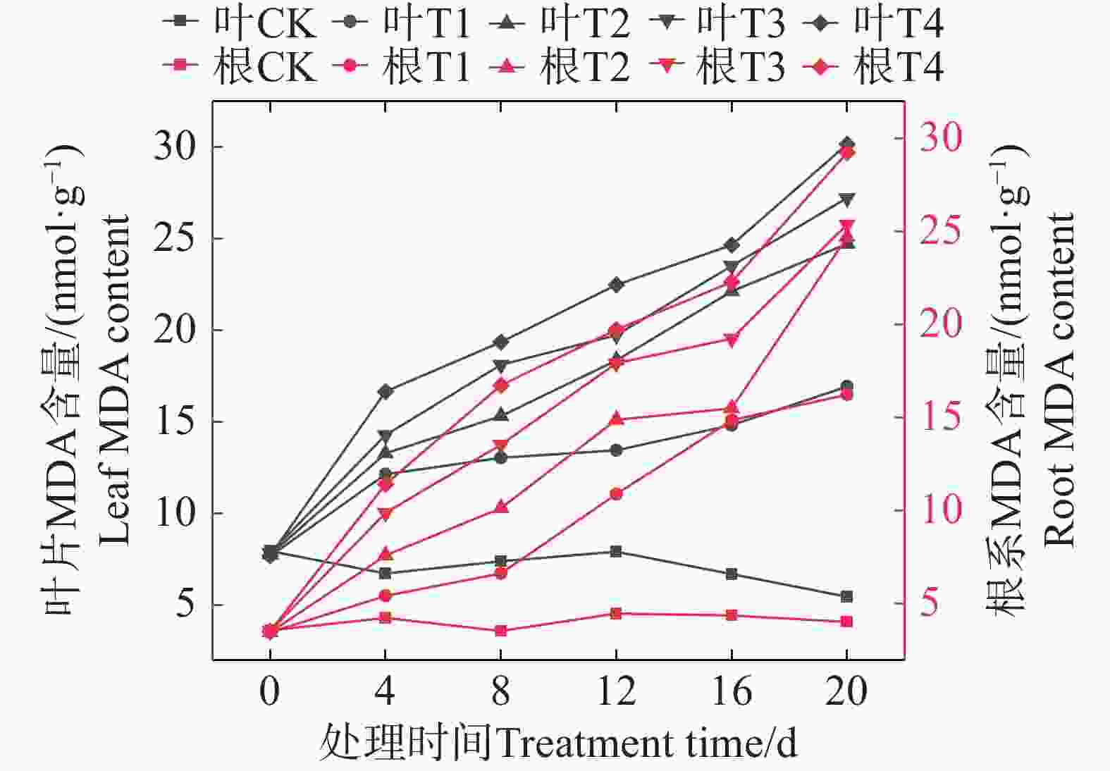 在根系中,随着盐胁迫浓度增大,矮蕉幼苗根系的MDA含量总体也呈上升趋势。各胁迫处理在第20天时达到最大值,分别增加了302.23%、512.21%、528.79%和624.34%。其中,T4组含量最高,为29.26 nmol·g-1,较同期T1、T2、T3组分别高出80.08%、18.32%和15.19%。这表明矮蕉幼苗的膜系统损伤程度不断加剧,且高浓度盐胁迫会加速细胞膜脂过氧化,可能导致细胞膜严重损伤。相比之下,根系在盐胁迫下的相对损伤程度大于叶片,根系的响应启动更快,对盐浓度的敏感性也远高于叶片,不同处理间MDA含量的差异在根系中更为明显。