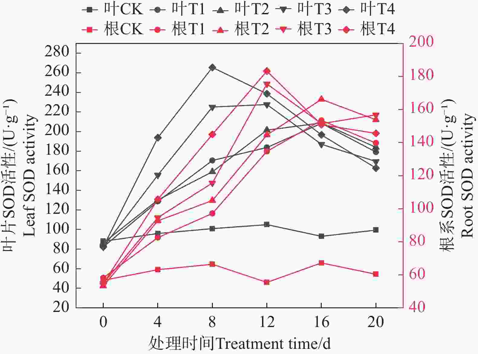 由图6可知,随着盐胁迫浓度的增大,矮蕉幼苗叶片的SOD活性总体呈先上升后下降的趋势。T1和T2处理在第16天时SOD活性达到最大值,分别为208.48 U·g−1和208.85 U·g−1;而T3和T4处理则在第8天时达到峰值,分别为225.19 U·g−1和265.66 U·g−1。矮蕉幼苗根系的SOD活性变化趋势与叶片相似,也表现为先上升后下降。T1和T2处理在第16天时达到最大值,分别为153.48 U·g−1和166.26 U·g−1;T3和T4处理则在第12天时达到峰值,分别为175.62 U·g−1和183.35 U·g−1。这表明盐胁迫可能诱导矮蕉幼苗提高SOD活性,且高浓度盐胁迫能更快激活其SOD活性以应对胁迫。在盐胁迫下,矮蕉幼苗根系SOD活性的相对激活强度高于叶片,且根系在达到峰值后活性维持时间更长;而叶片的响应速度更快,早期迅速激活,但也更早开始减弱。